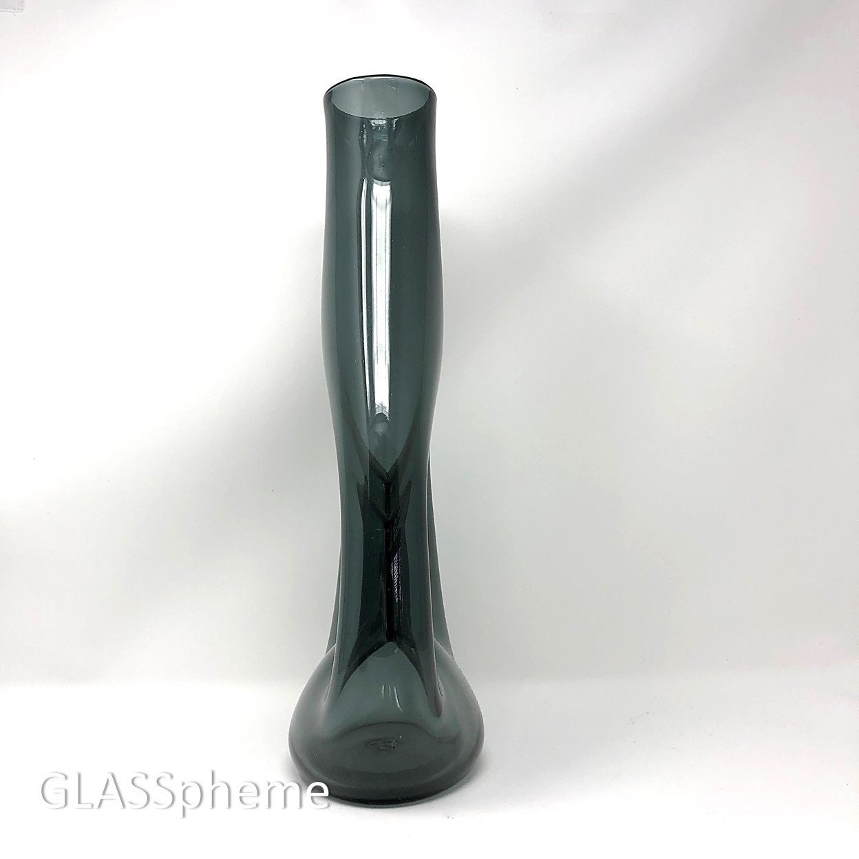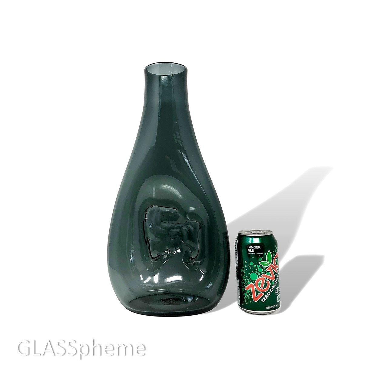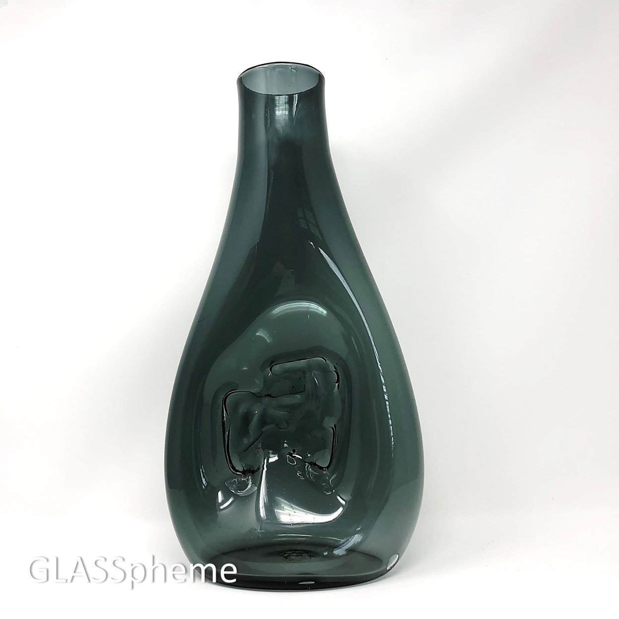 Bet you've never seen this one before... You're looking at an important (on display at the Corning Museum of Glass!) and ridiculously rare 1955-ONLY BLENKO 5518 vase in highly coveted CHARCOAL by Wayne Husted in MINTY condition. This is a magnificent showy piece, with the vase just short of 16" tall and 8" at widest. An abstractly formed horse remniscent perhaps of cave dweller drawings is pressed into both sides of the vase, compressing the center of the vase together. According to Worthpoint, which archives online auction results, only TWO of these beauties (properly identified anyway), have hit the market in the last decade. It makes you wonder how many are out there...