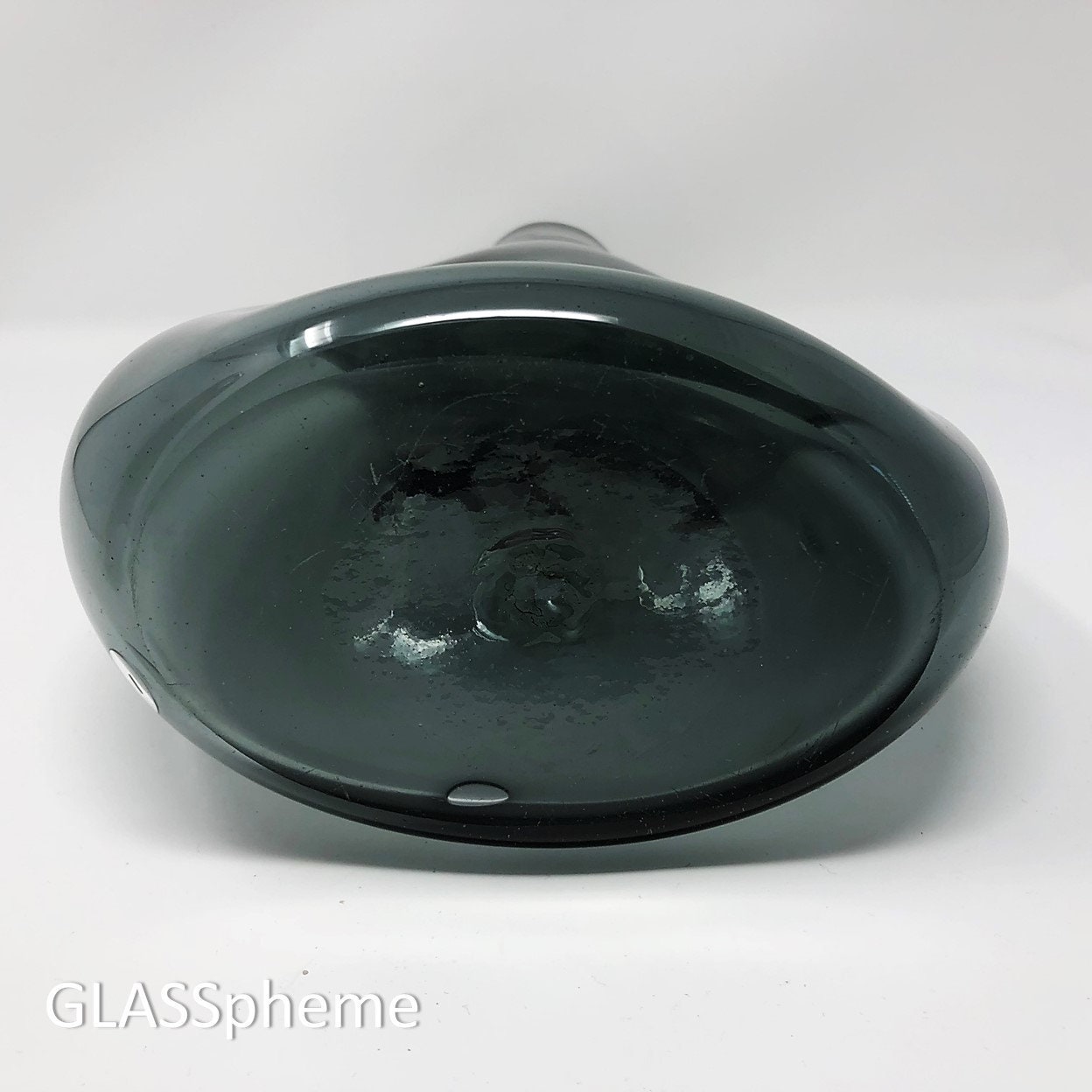 Our speciman has a factory-sheared base so that the vase sits flat and is in the mintiest possible condition given its 60+ years. A few bubbles in the glass, and some dust, but no stains and ZERO signs that it ever held fluid. In fact, typical of the mid-century modern aesthetic where form and function parted ways, this vase is completely impractical for cut flowers as the compressed center of the vase leaves no room for stems.