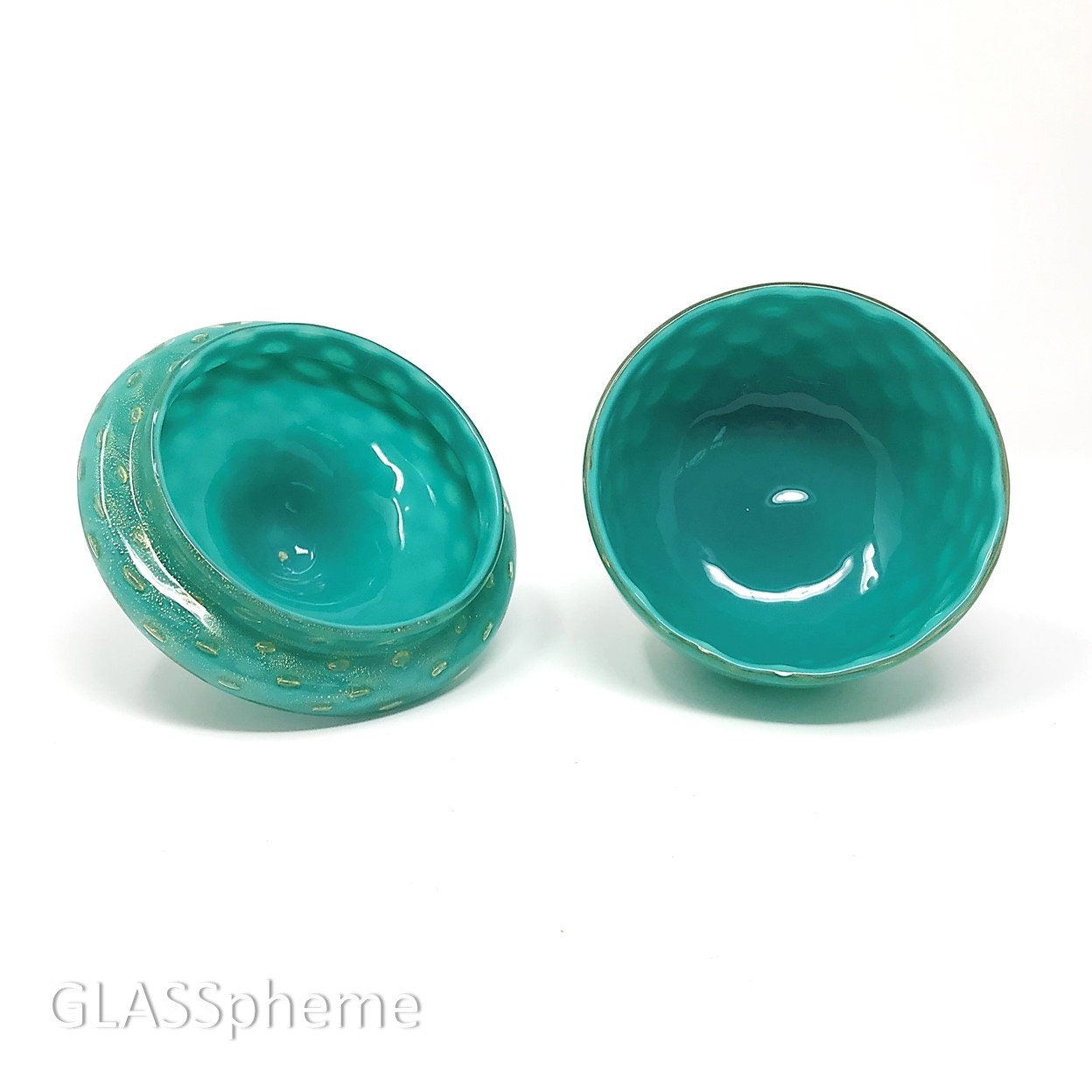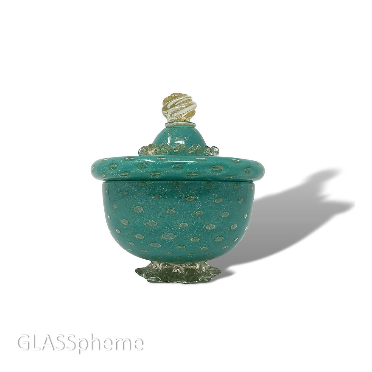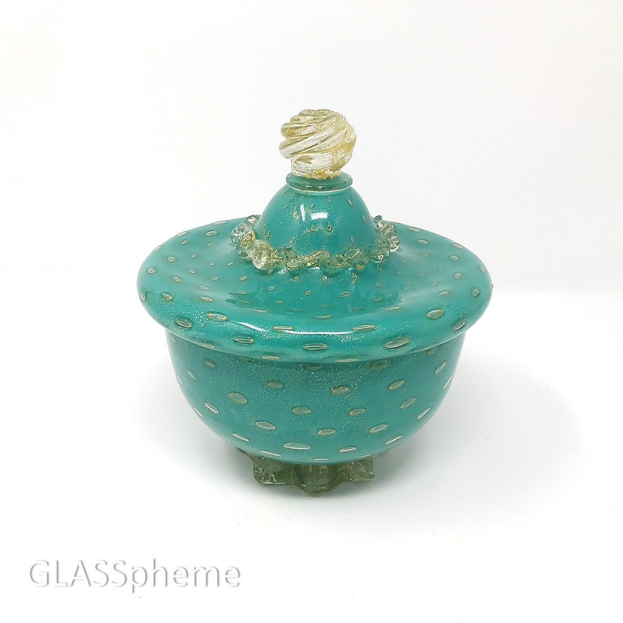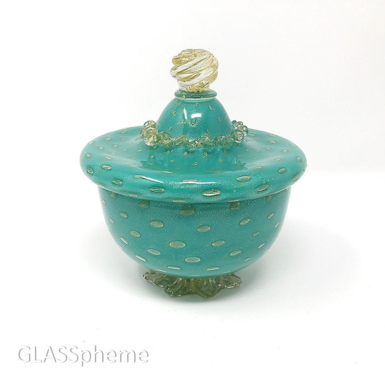 You're looking at a truly magnificent mid-century Murano cased aqua glass powder | jar laden shimmering with gold aventurine throughout, maker unknown. I've seen this piece attributed to Barbini and indeed, I've seen a very similar piece with a Barbini for Weil Ceramics label, but it didn't have a rigaree and I can't think of one documented piece by Barbini that features a rigaree. Worthpoint features the same jar with a Barovier attribution, but still, no label or other documentation to definitively attribute this to any particular maker.
