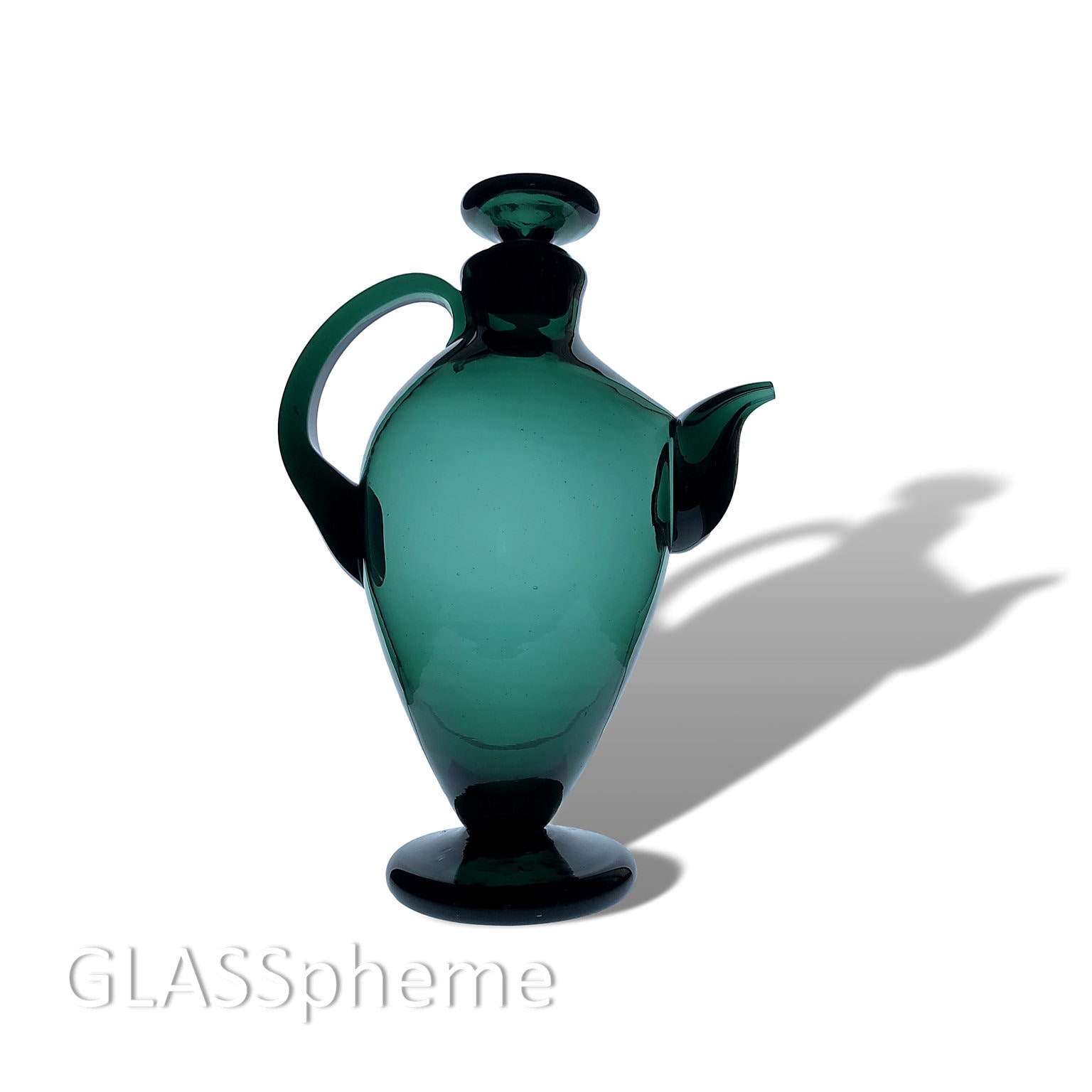 Wayne Husted's #573 "Cocktail pitcher with hollow spout ice guard" (as described in the 1957 Blenko catalog) was actually produced for three years (1957-1959). But JUNIPER, one of Blenko's few "one year only" colors, was used only in 1957, so our beauty here was clearly made in the design's first year of production. It's a highly coveted piece, and in rare Juniper (a deep rich evergreen), even more awesome!