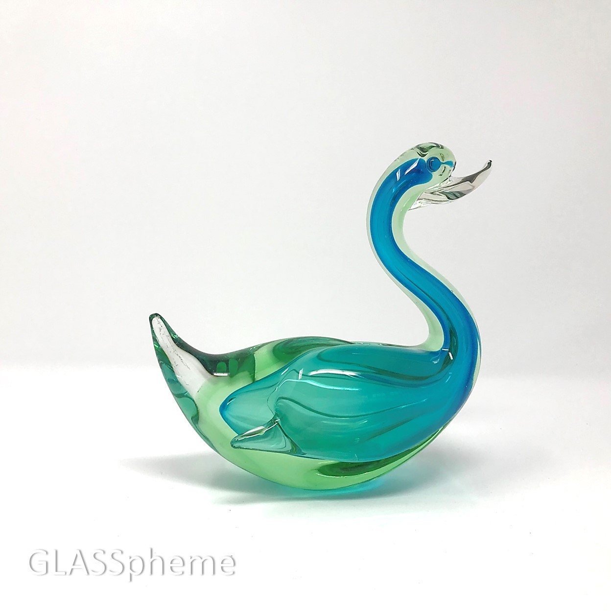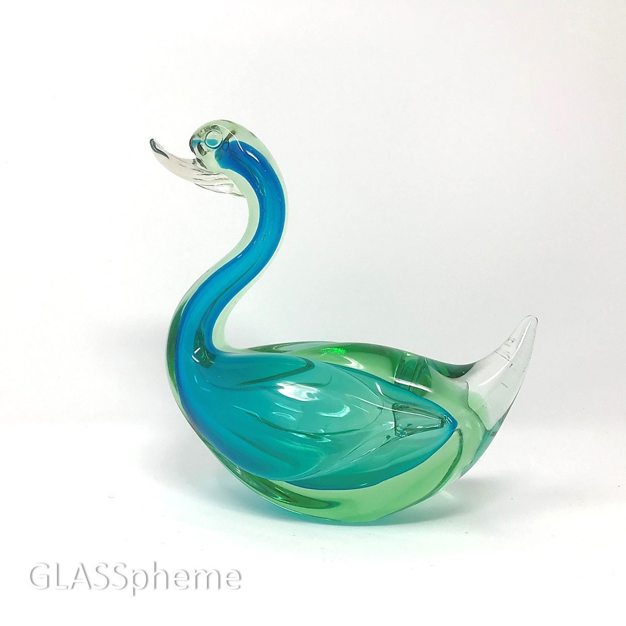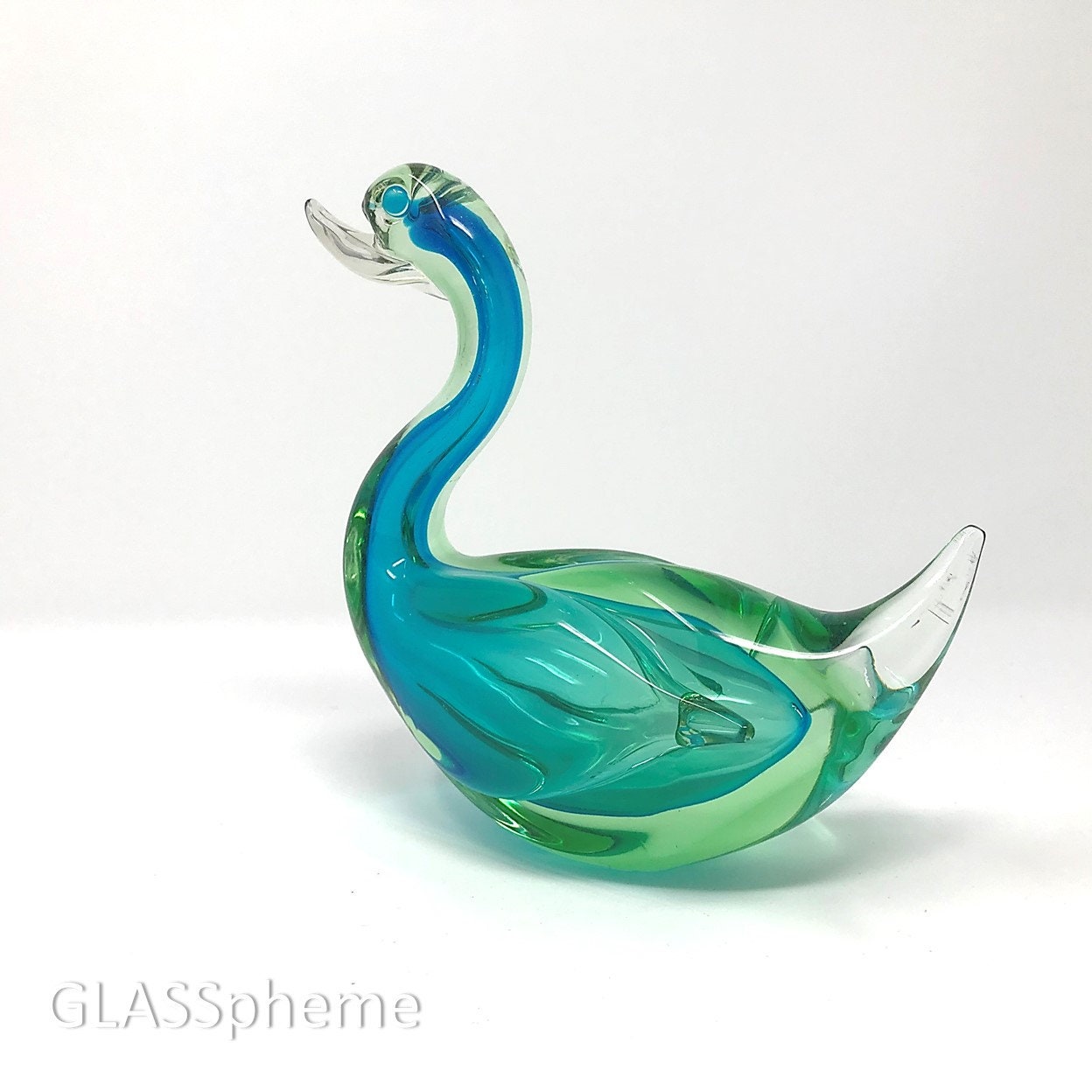 This is a gorgeous large late 20th century Murano glass duck (or some manner of water fowl) done in a compex and utterly mesmerizing green and blue blend sommerso | cased | submerged glass. Murano firms borrow each other's designs freely, and I've seen similar pieces from many furnaces--I simply cannot attribute this beauty to a particular one with any confidence. Most importantly, it bears the exquisite artistry of MURANO. The internet is stewn with Chinese fakes--I've seen China-made figurines advertised as Murano on sites purportedly run by experts, e.g. 1stDibbs. To me, the easiest way to tell a Chinese fake murano figurine is to look at the craftmanship and grace of the piece. Chinese 'murano' animal figurines look awkward--garish colors, clubbed rather than graceful lines, and childish facial detail. There's none of that here--this is one exquisite graceful wonderous piece!