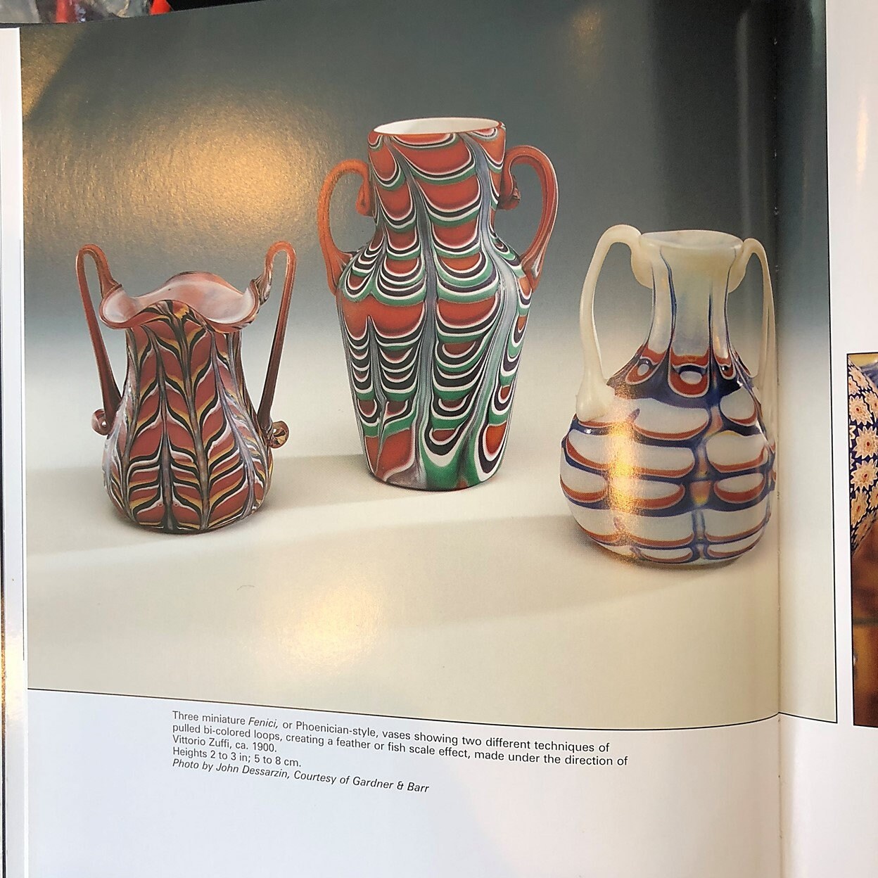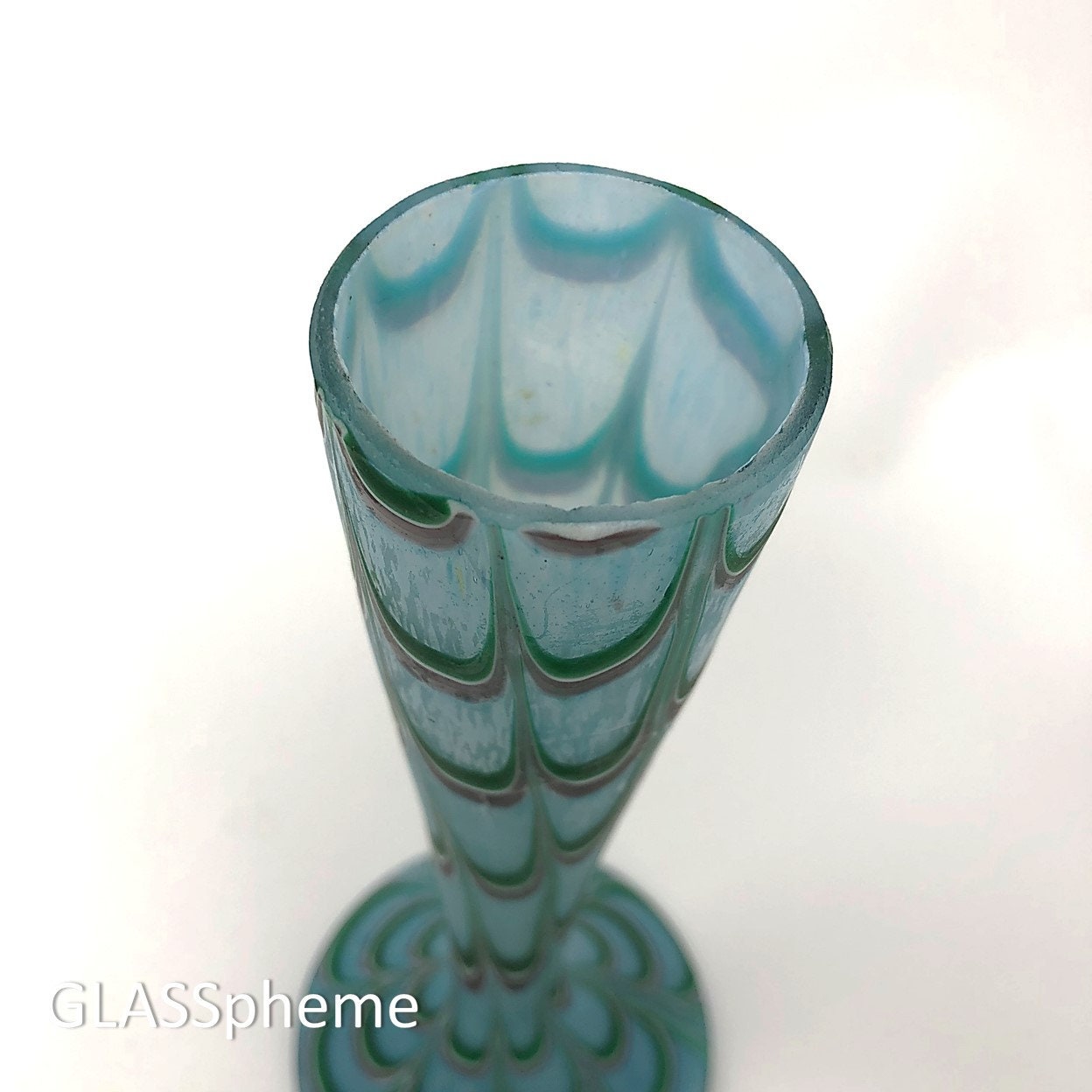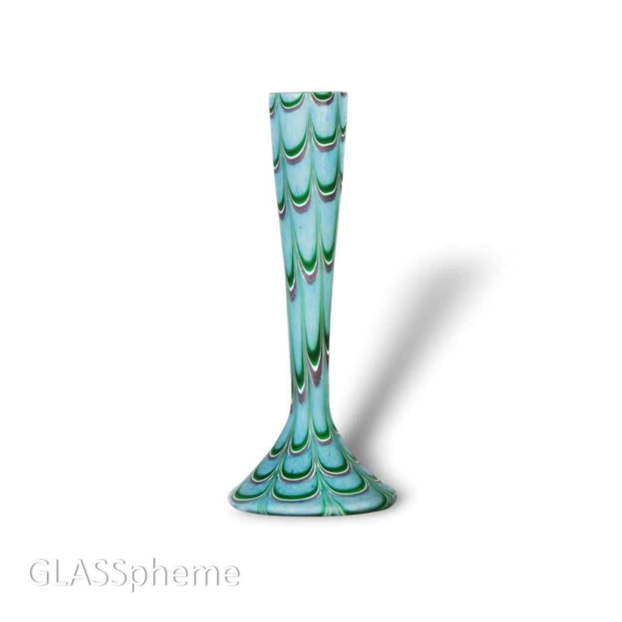 Fratelli Toso's highly coveted Fenicio/Fenici vases, produced around the turn of 20th century under Vittorio Zuffi, are exquisite vestiges of a time long past. This blue glass vase with green, purple and white "pulled feathers" is in excellent condition, and still sports the label of its French retailer.