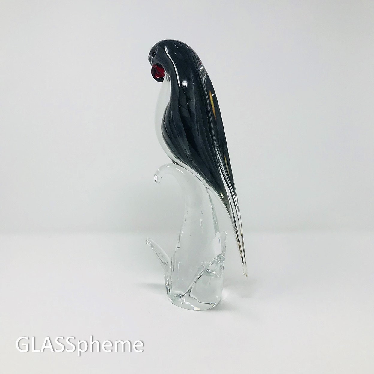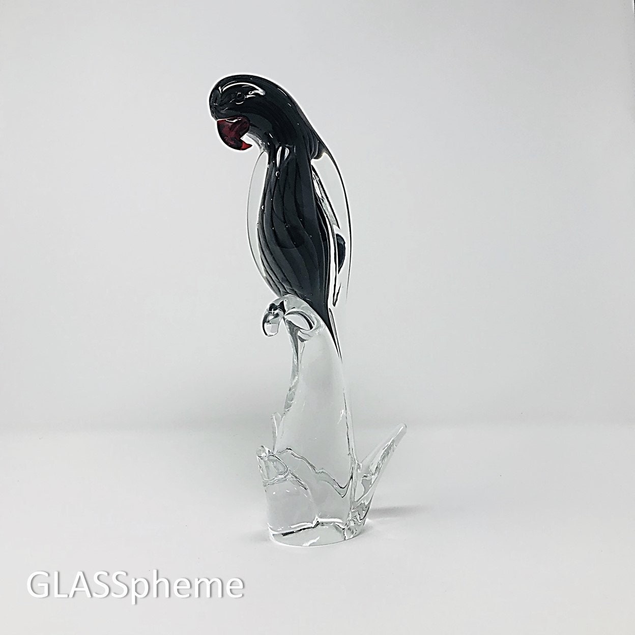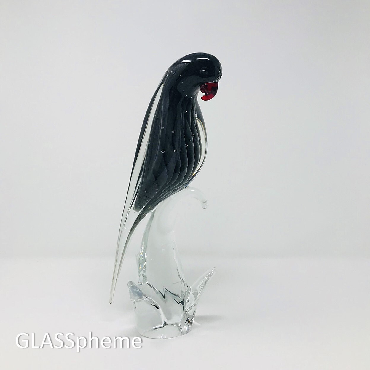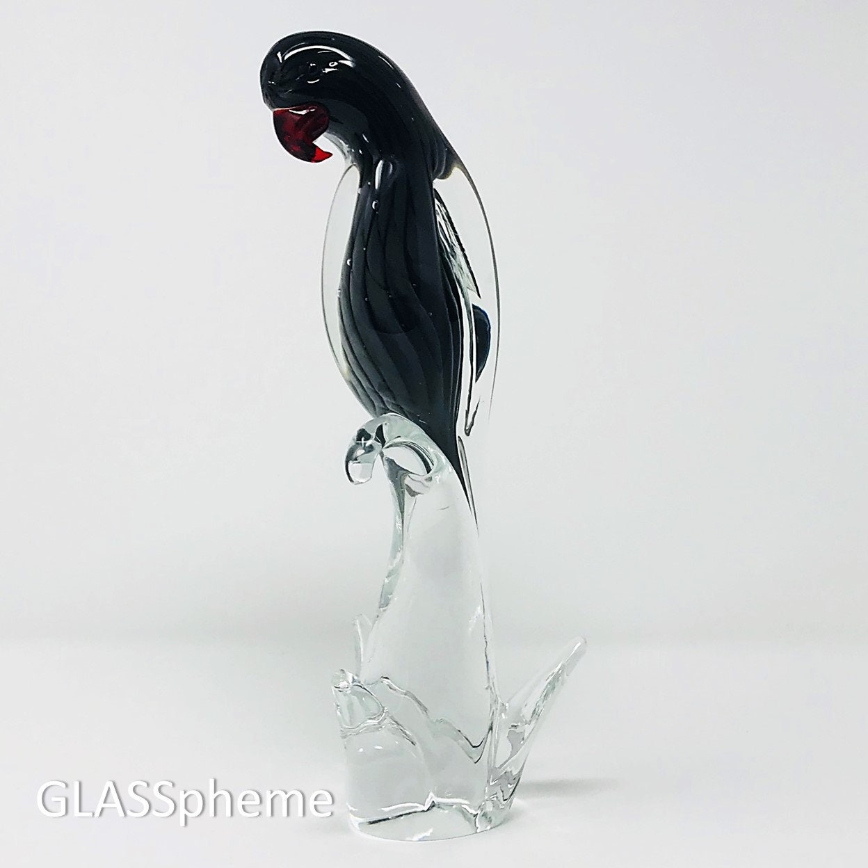 This dramatic and uncommon piece stands about 12" tall and 5" in its widest diameter. It is unmarked and in perfect condition, although I did notice a highly unusual manufacturing issue--the three points off the base on which the bird is perched have not been fired/polished. Instead, the edges are just as the shears left them, ending in a pinch rather than a rounded point. This is not the type of thing most would notice--it's just my habit to run my fingers all over a piece of glass to insure I haven't missed anything.