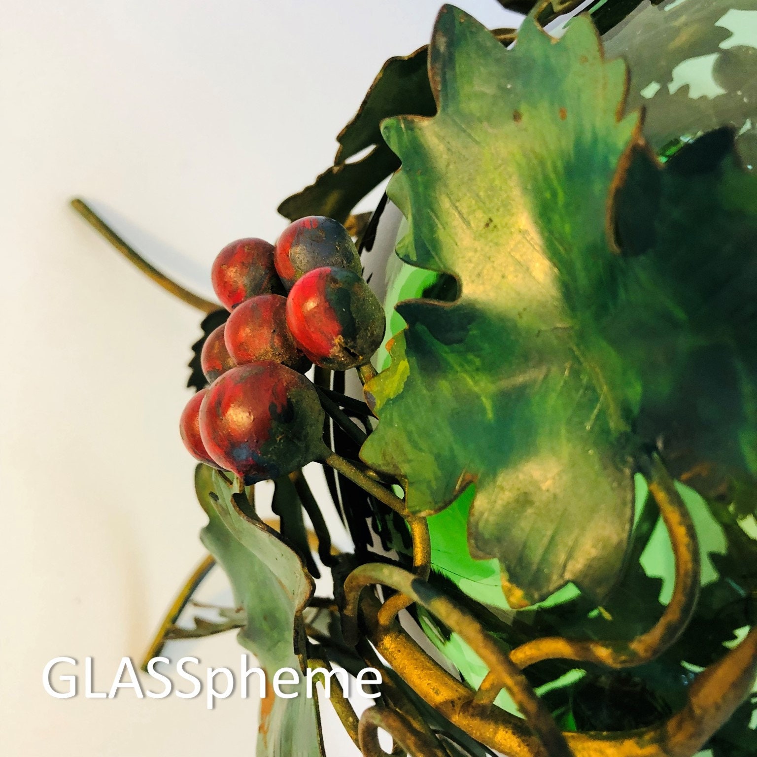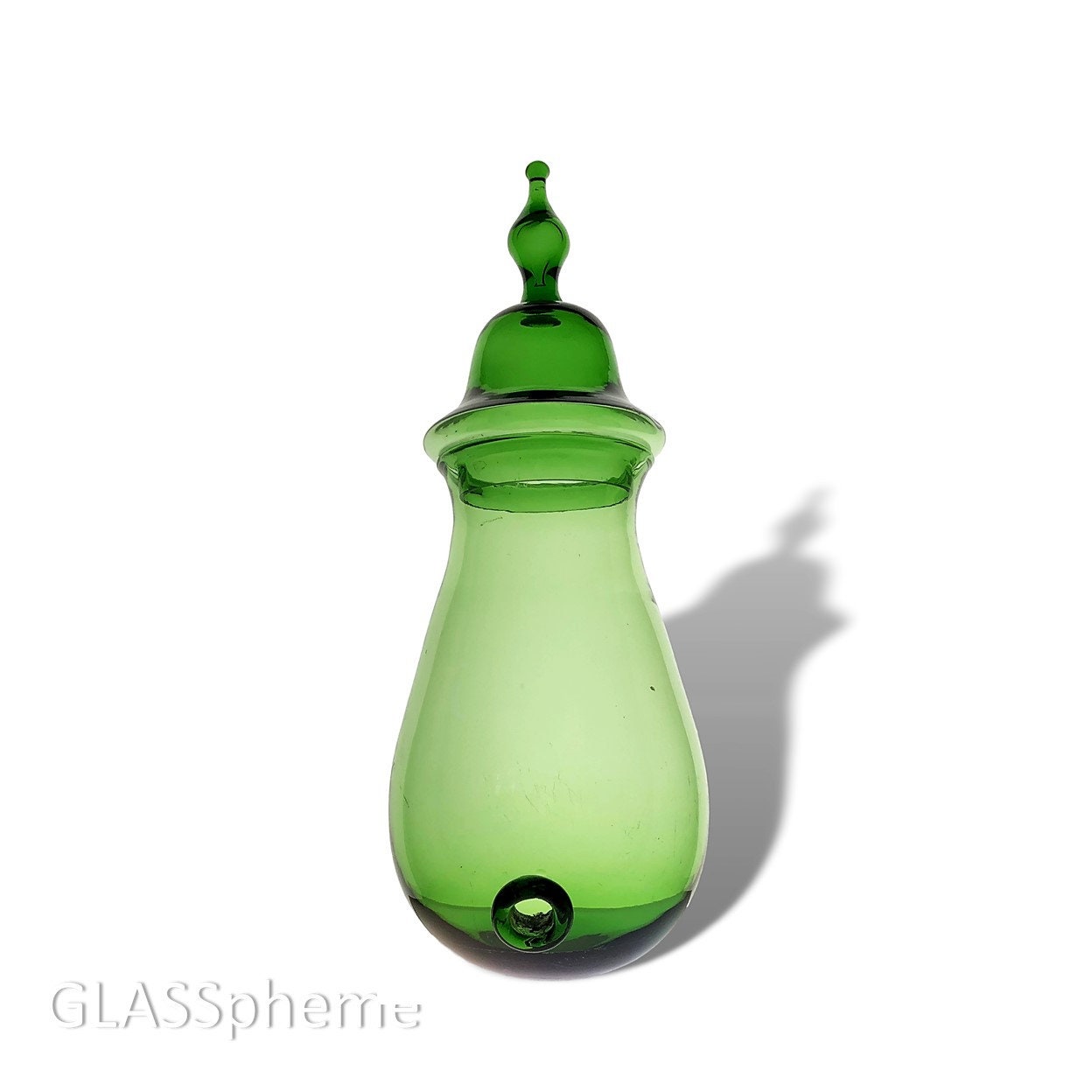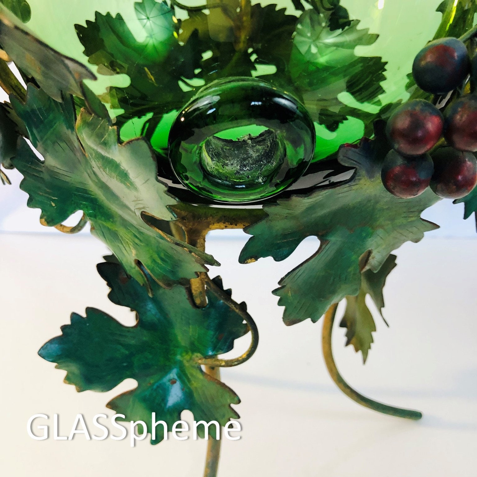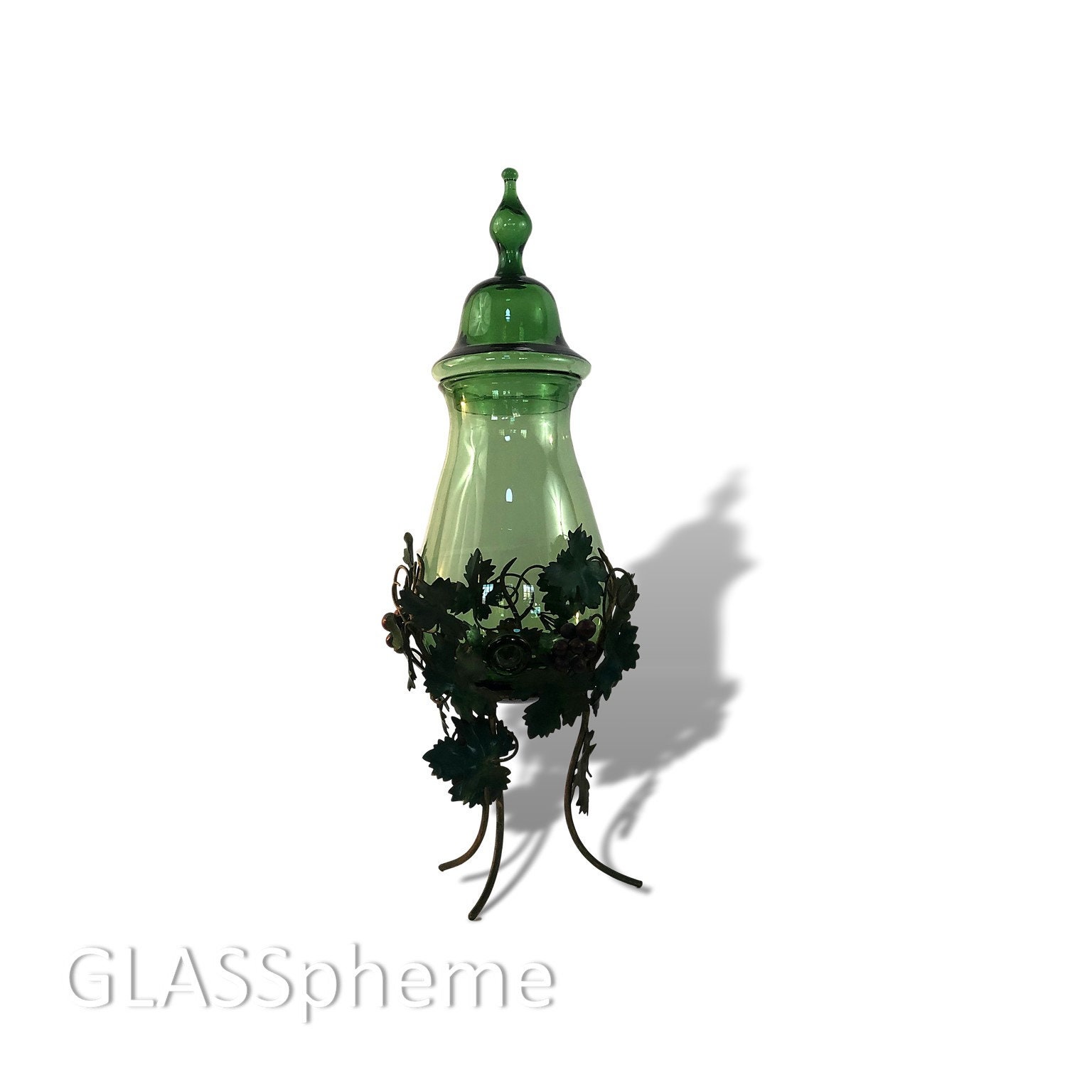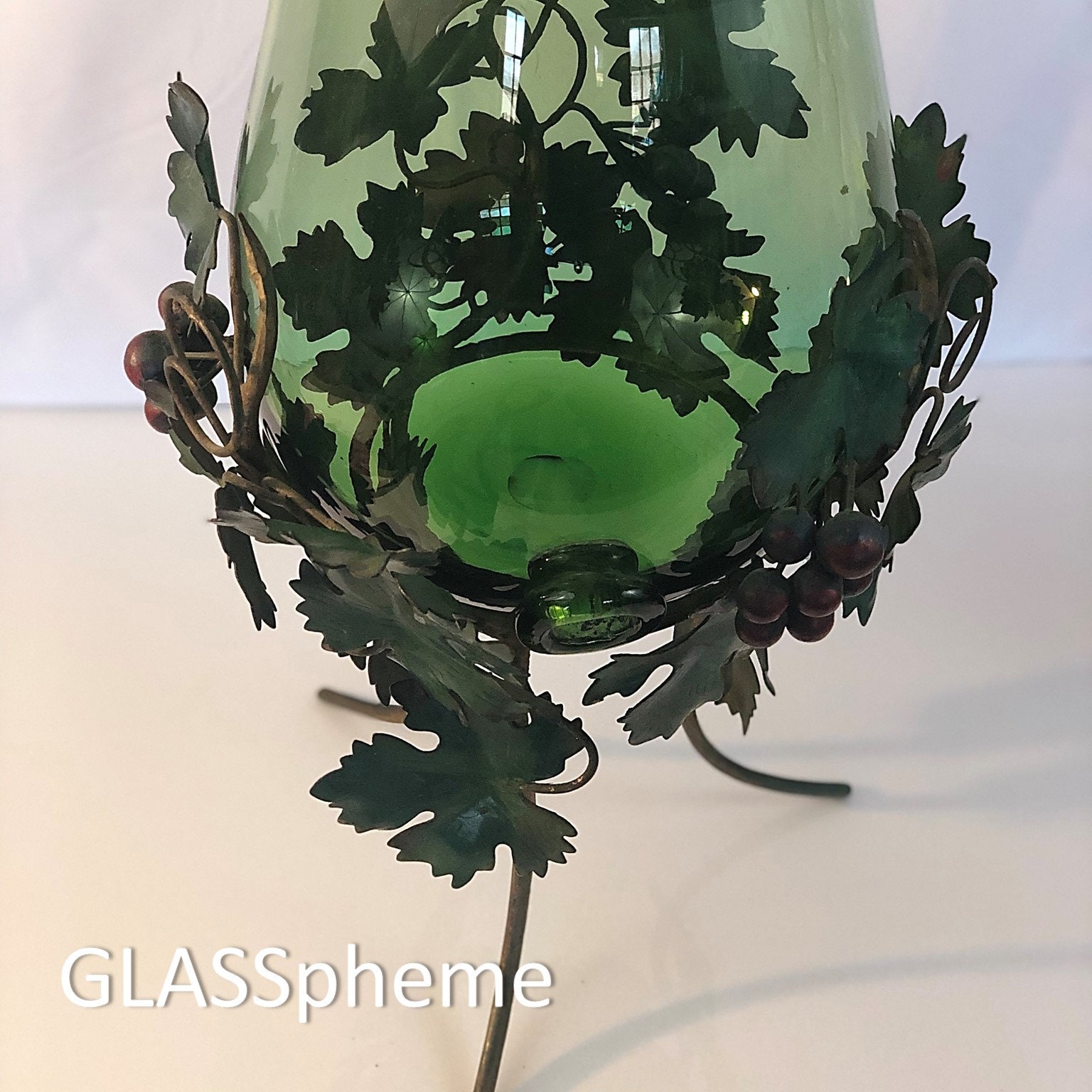 You're looking at an awesome and BIG piece of vintage mid-century Empoli glass--it stands 21" tall and is nearly 8" wide. This beauty was originally sold as a beverage dispenser--notice the hole at the bottom of the 'jar' where the cork used to go. This is classic Empoli VERDE glass, green from the minerals in the Empoli soil. IMPORTANT NOTE: The polished pontil is large enough to allow this bottle to stand on its own in a display, but it is NOT stable enough to be in a place where it might be accidentally touched. This decanter came with a green metal 'grapes and vines' stand, which I've finally gotten around to photographing. You would want this stand only if you planned to serve beverages from this beautiful piece of vintage glass. Otherwise, frankly, it doesn't have much display value.