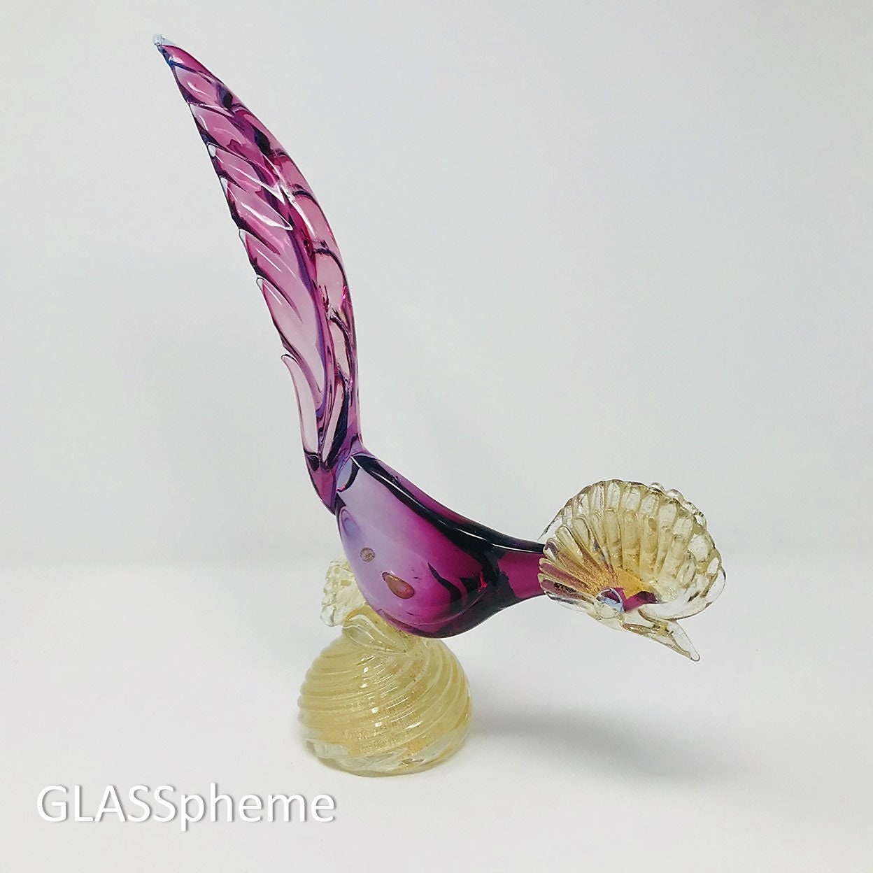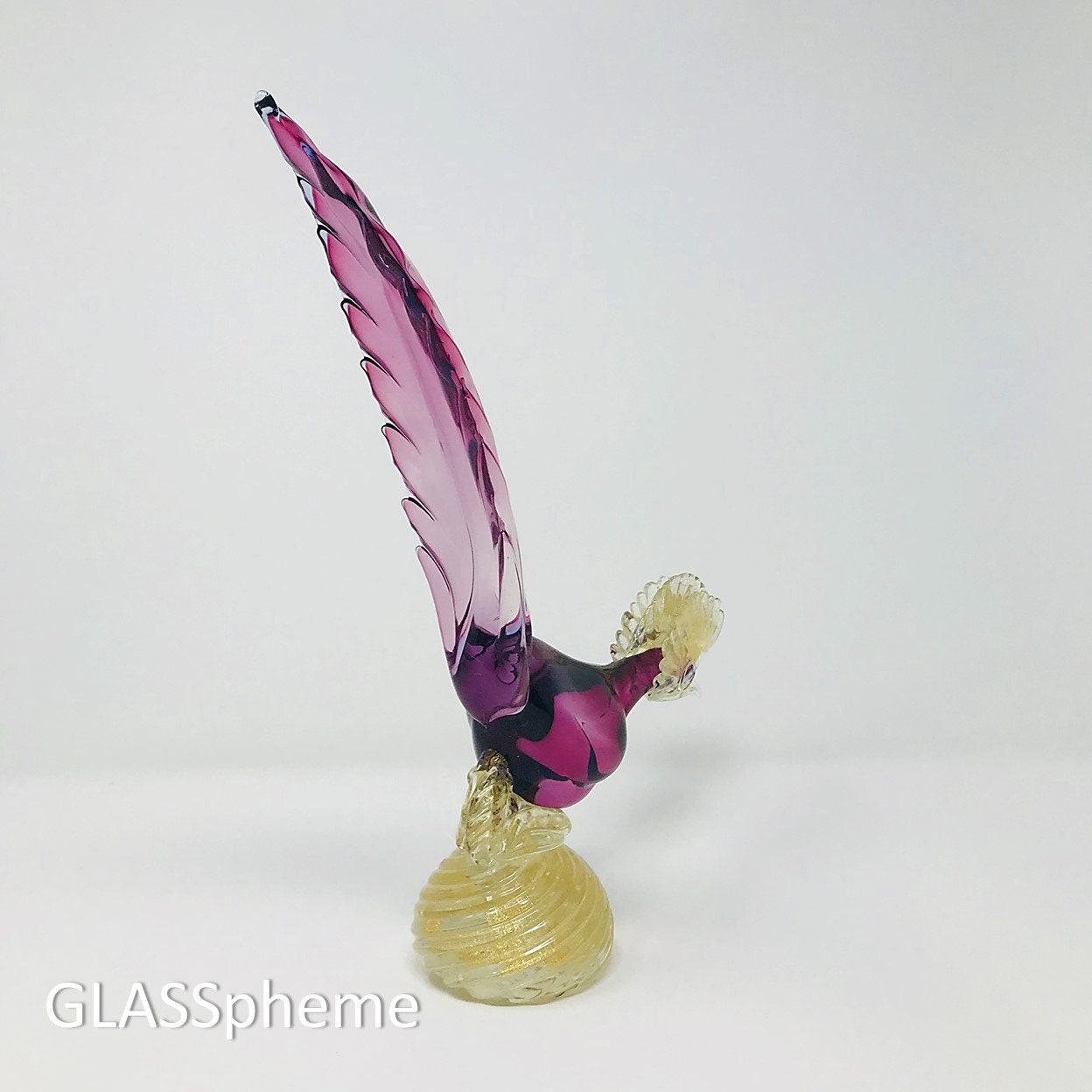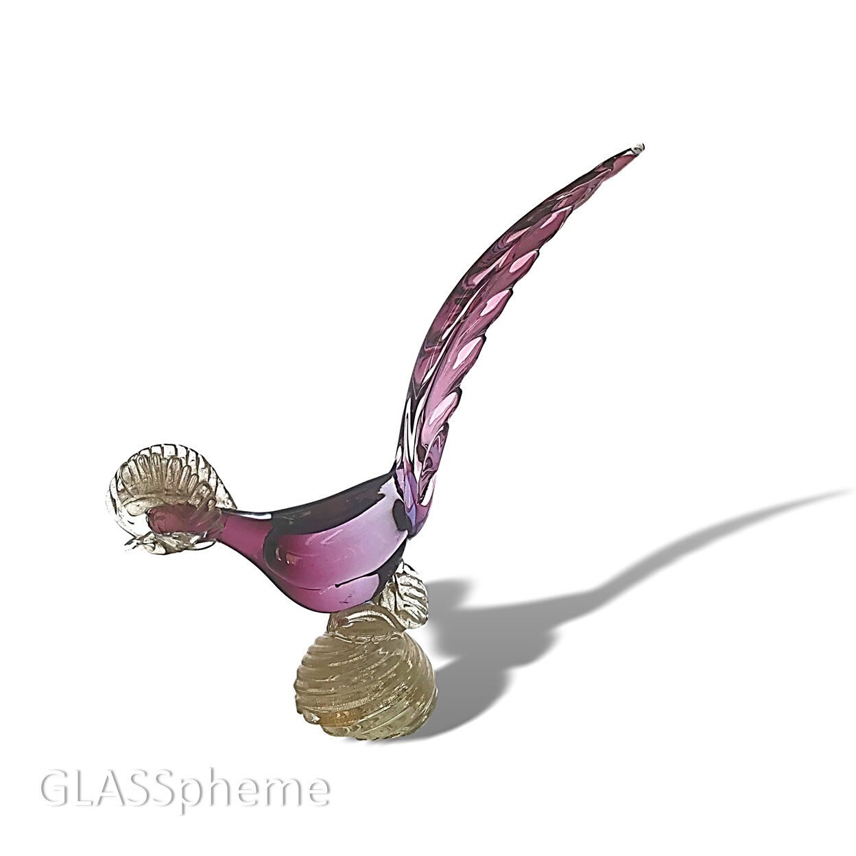 Behold this spectacularly beautiful mid-century Arte Vetreria Muranese (A.VE.M) bird | pheasant glass sculpture done in a brilliant 'to die for' purple/amethyst/cranberry with gold aventurine-strewn base, head, and beak. While our beauty is unlabeled, a similarly constructed bird with the same base can be found under A.VE.M in the Murano Zoo (https://sites.google.com/site/muranozoo/birds-3).