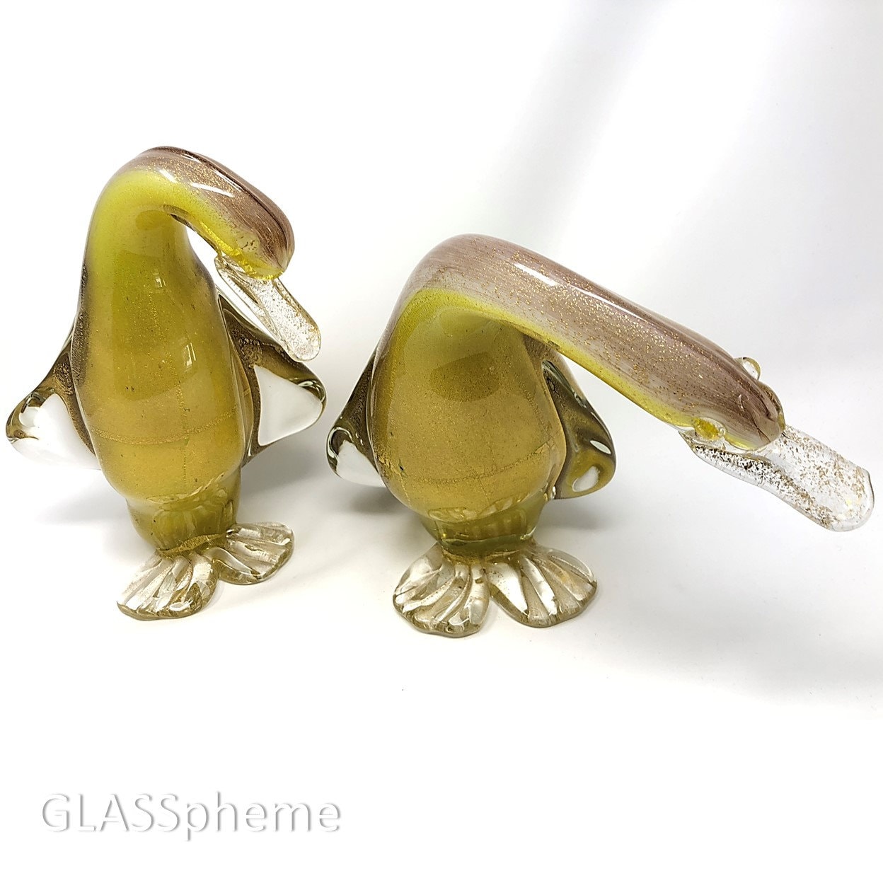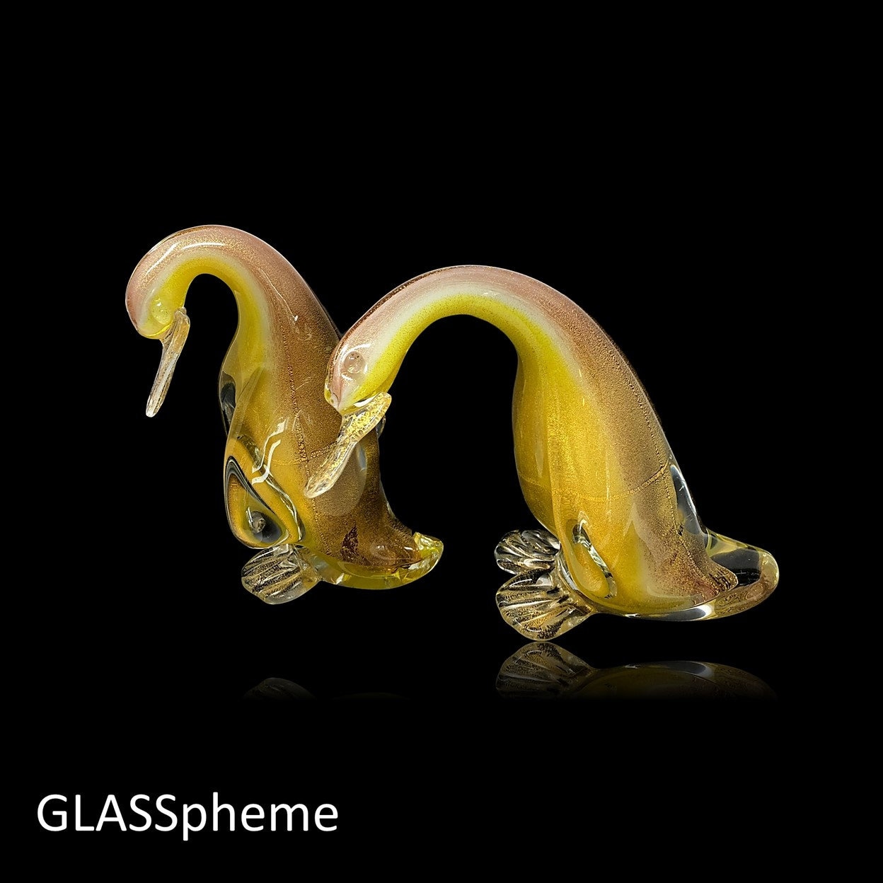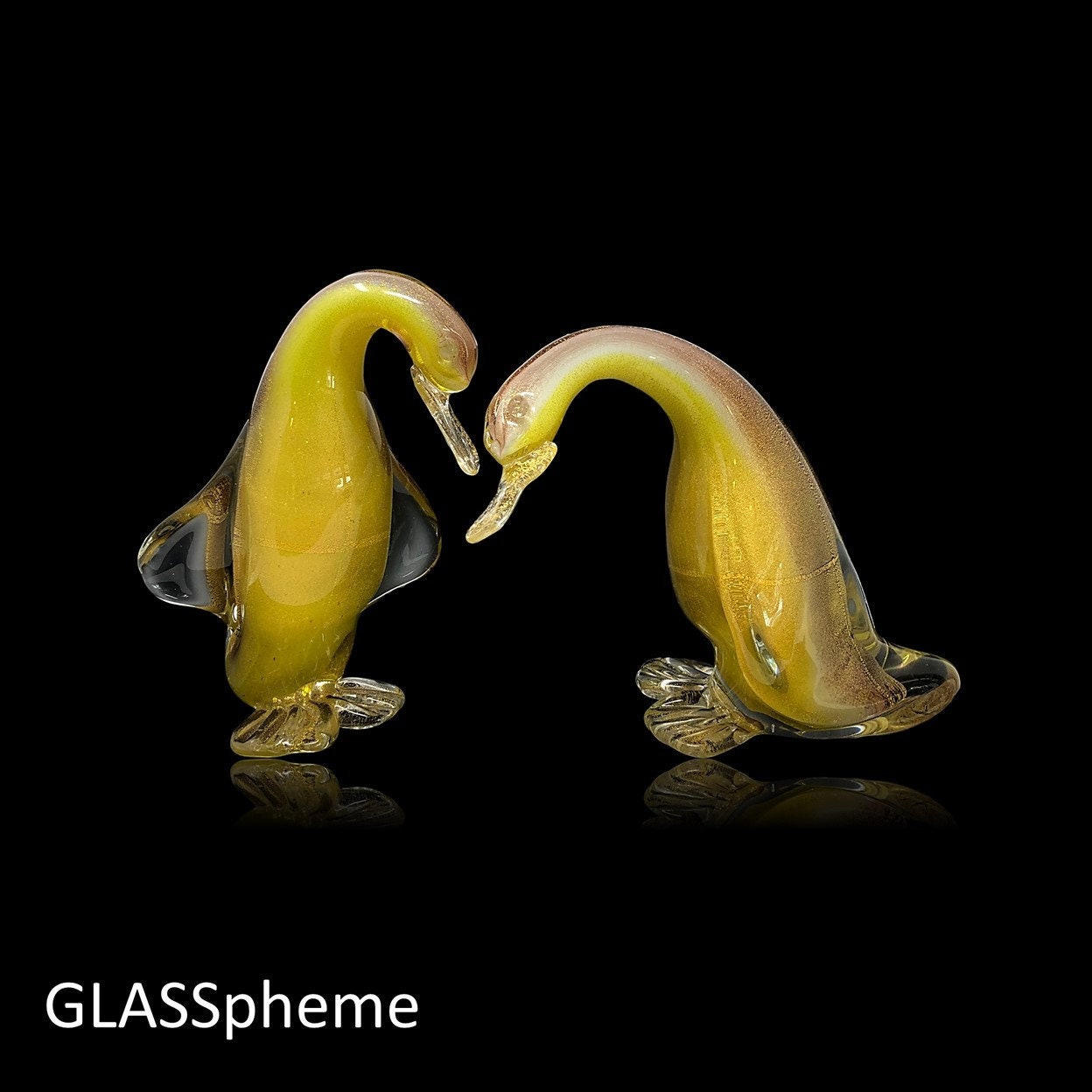 You're looking at some seriously rare (or at least super hard to find!) circa 1950s Murano glass love birds by Ermanno Toso for Fratelli Toso! Take a close look at the intricacy of their construction. Note all that gold and copper aventurine encased in a thick heavy crystal sommerso glass. Crystal glass beaks and feet are also glittering with gold aventurine flecks. These beauties have no markings or labels but I have found one online and it sports the trademark blue on silver Fratelli Toso label. Convo me for the link.