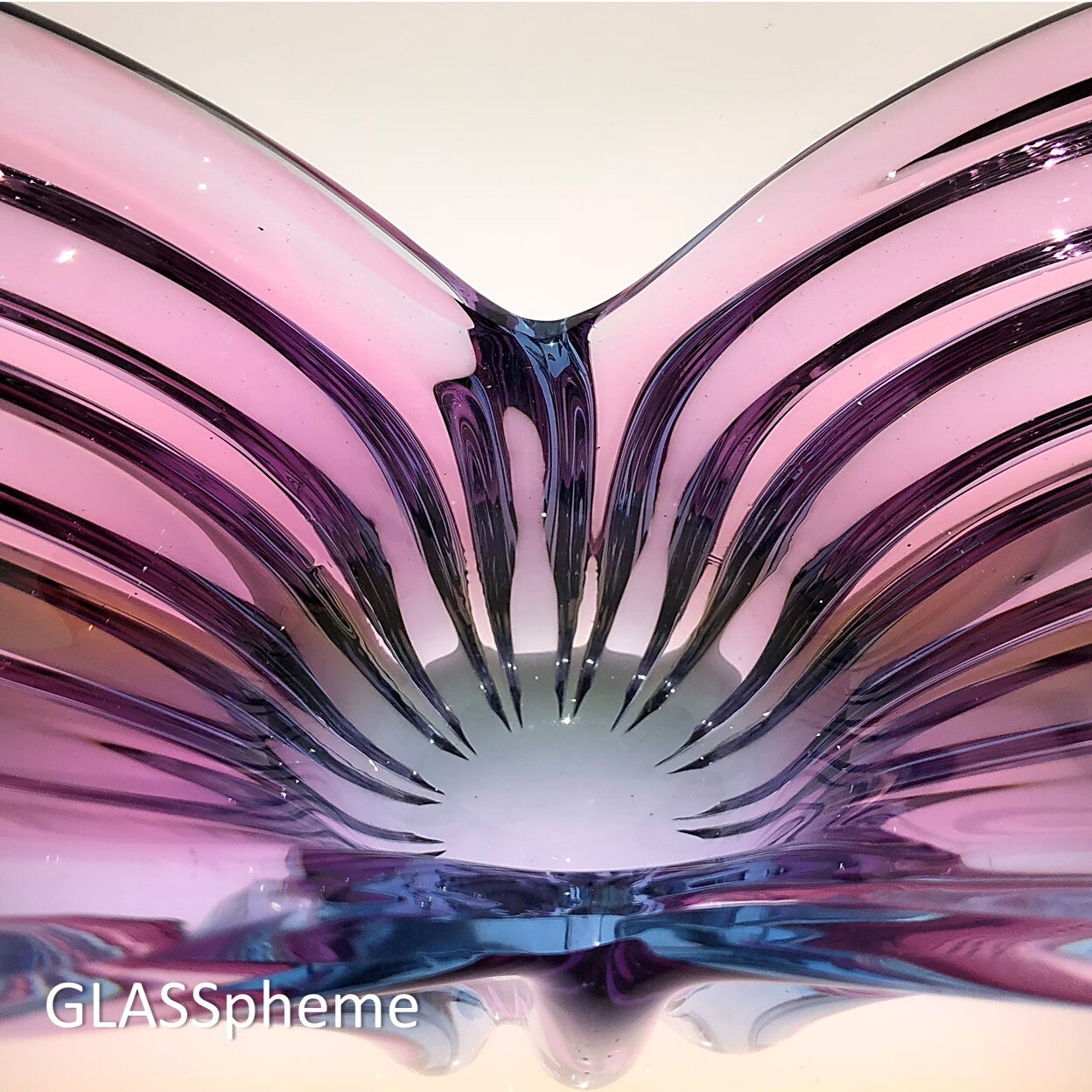 Alfredo Barbini's dramaticly formed winged glass bowl/centerpiece is one of his most famous and sought after designs, with good reason--the grace and movement in this piece will never fail to take your breath away. The cased glass /lattimo versions sparkle with the inlaid gold aventurine, but the sommerso versions--like this spectactular cranberry and blue alexandrite-like glass--capture the light like nothing you've ever seen.