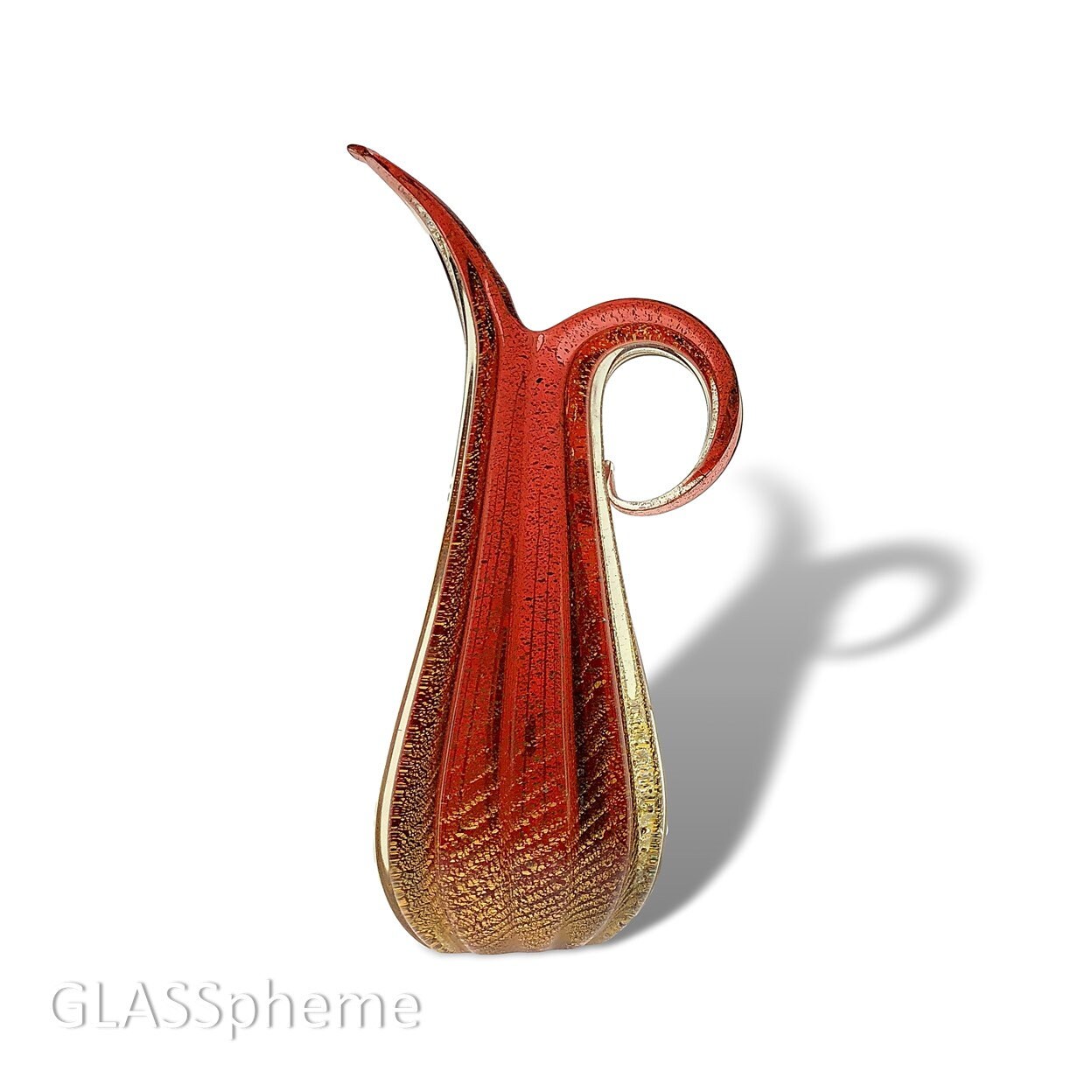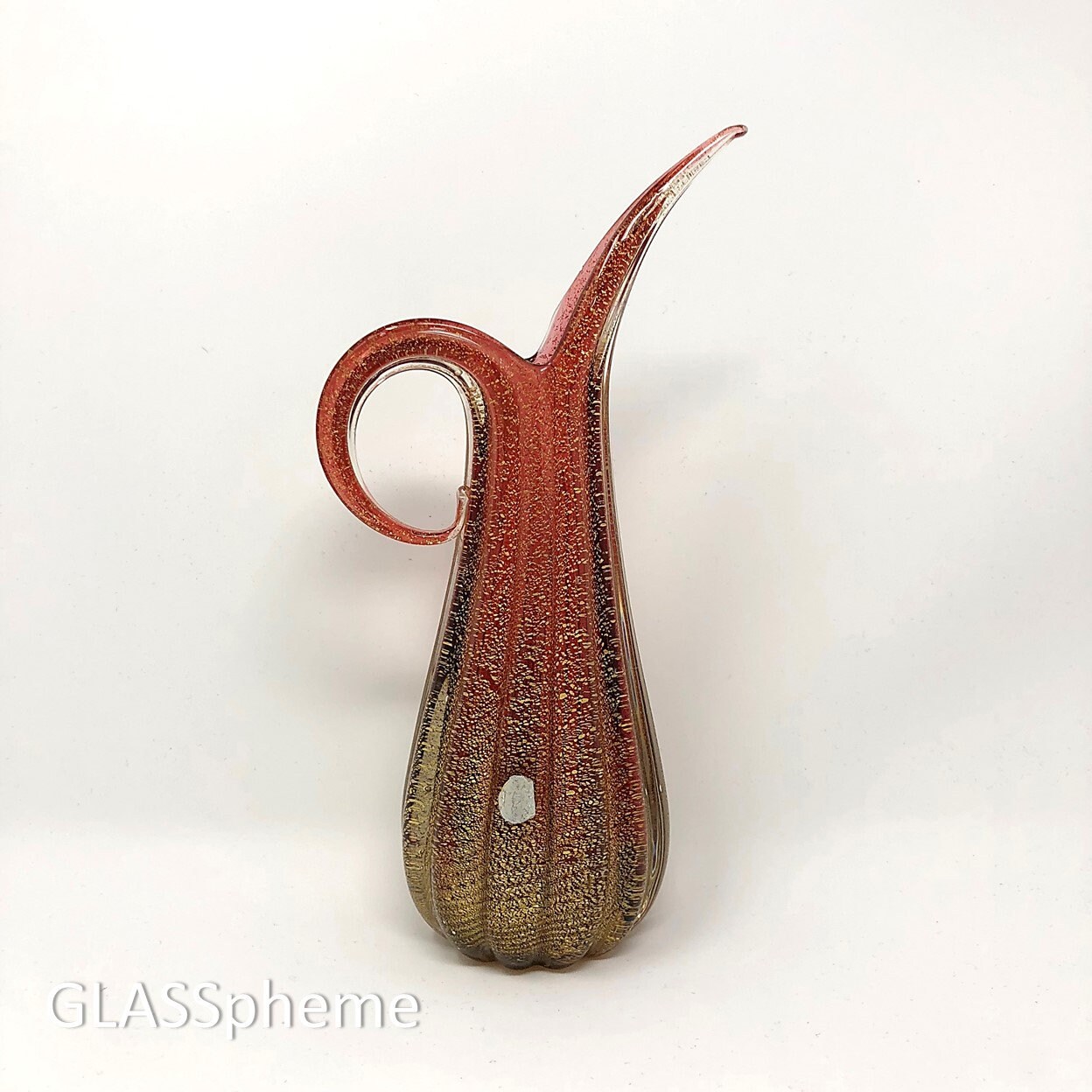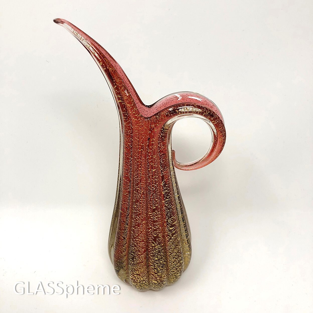 Check out this mid-century Murano wonder--a sublime glass ewer | pitcher | decanter with thick ribbed crystal glass walls over gold aventurine-flecked cranberry glass. It's remniscent of Barovier & Toso's Coronado (gold rope) design, but I'm not confident enough to attribute it to that company. Especially given the tiny foil label remnant that I've been unable to match to a maker. What's NOT uncertain is the absolute beauty of this elegant graceful piece!
