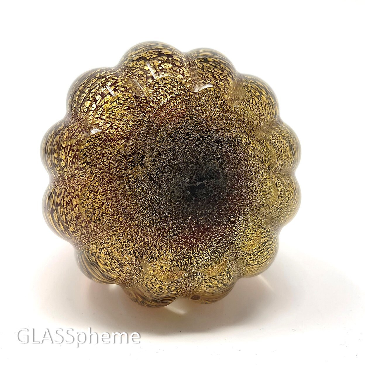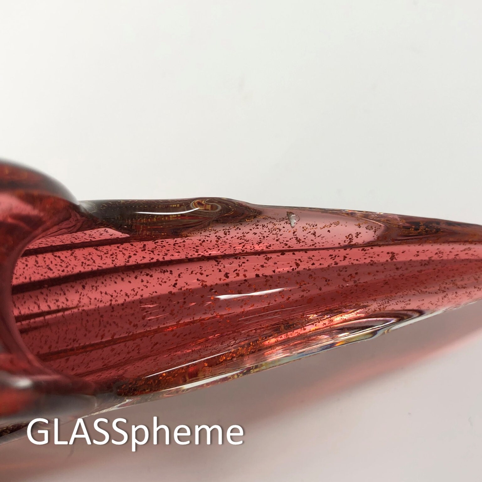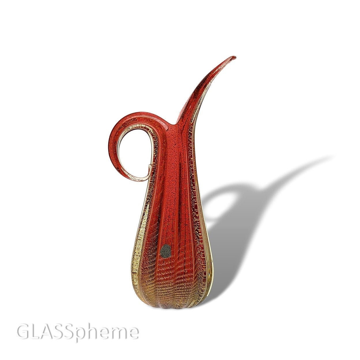 Check out this mid-century Murano wonder--a sublime glass ewer | pitcher | decanter with thick ribbed crystal glass walls over gold aventurine-flecked cranberry glass. It's remniscent of Barovier & Toso's Coronado (gold rope) design, but I'm not confident enough to attribute it to that company. Especially given the tiny foil label remnant that I've been unable to match to a maker. What's NOT uncertain is the absolute beauty of this elegant graceful piece!