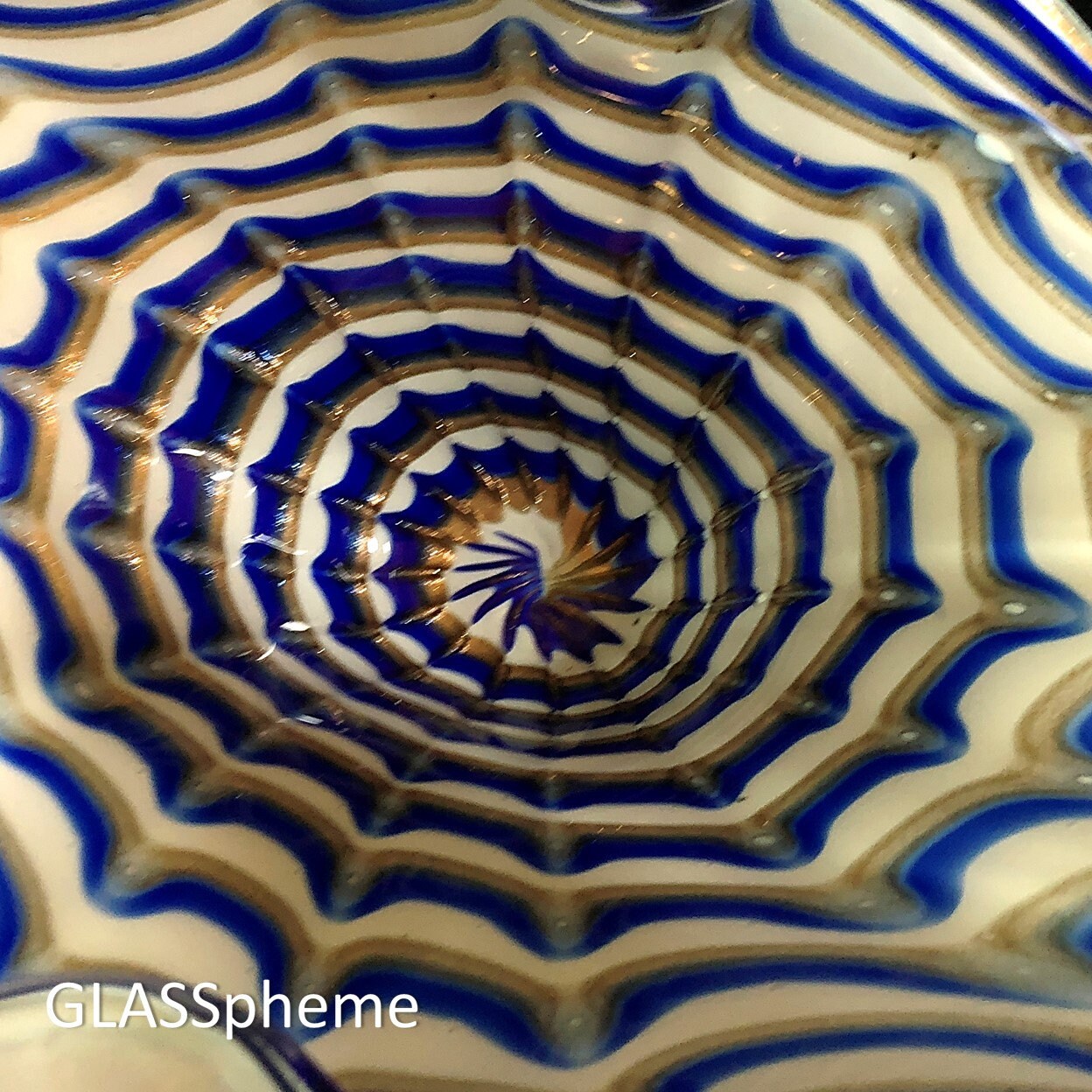 This big bold BODACIOUS mid-century MURANO glass centerpiece (or console, bowl, platter), unlabeled but most definitively a Fratelli Toso creation) will knock way more than your socks off! Done in a deep cobalt blue 'pulled feather' design alternating with tons of gleaming gold aventurine on a white lattimo base, this biomorphic beauty is way more than a centerpiece—it’s a divine piece of modern SCULPTURE that’s also super-functional.