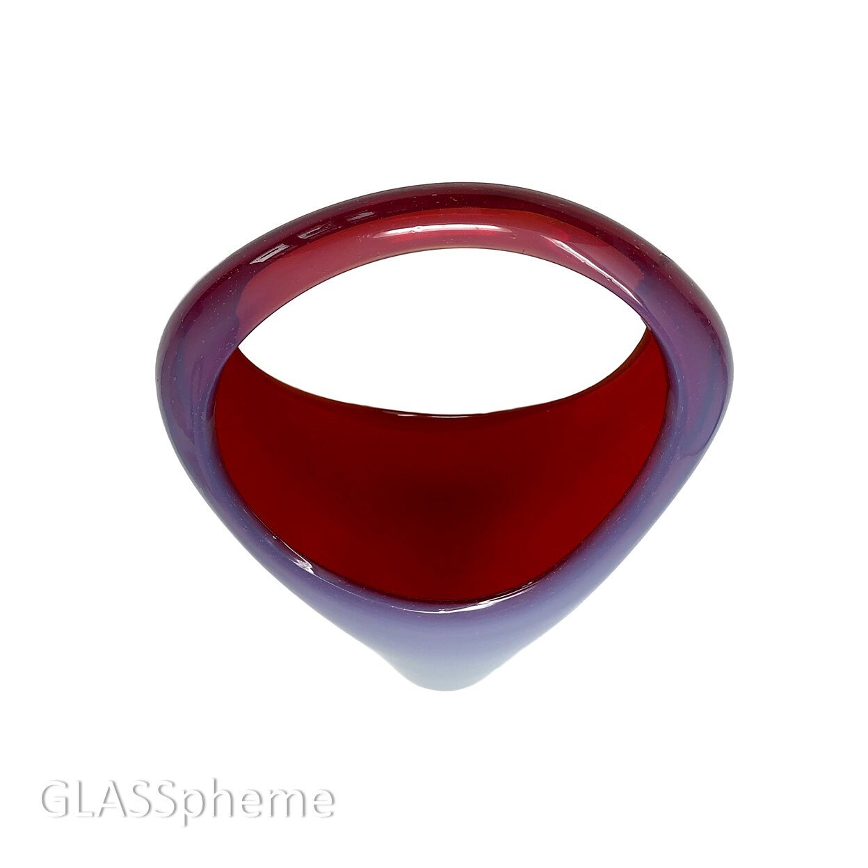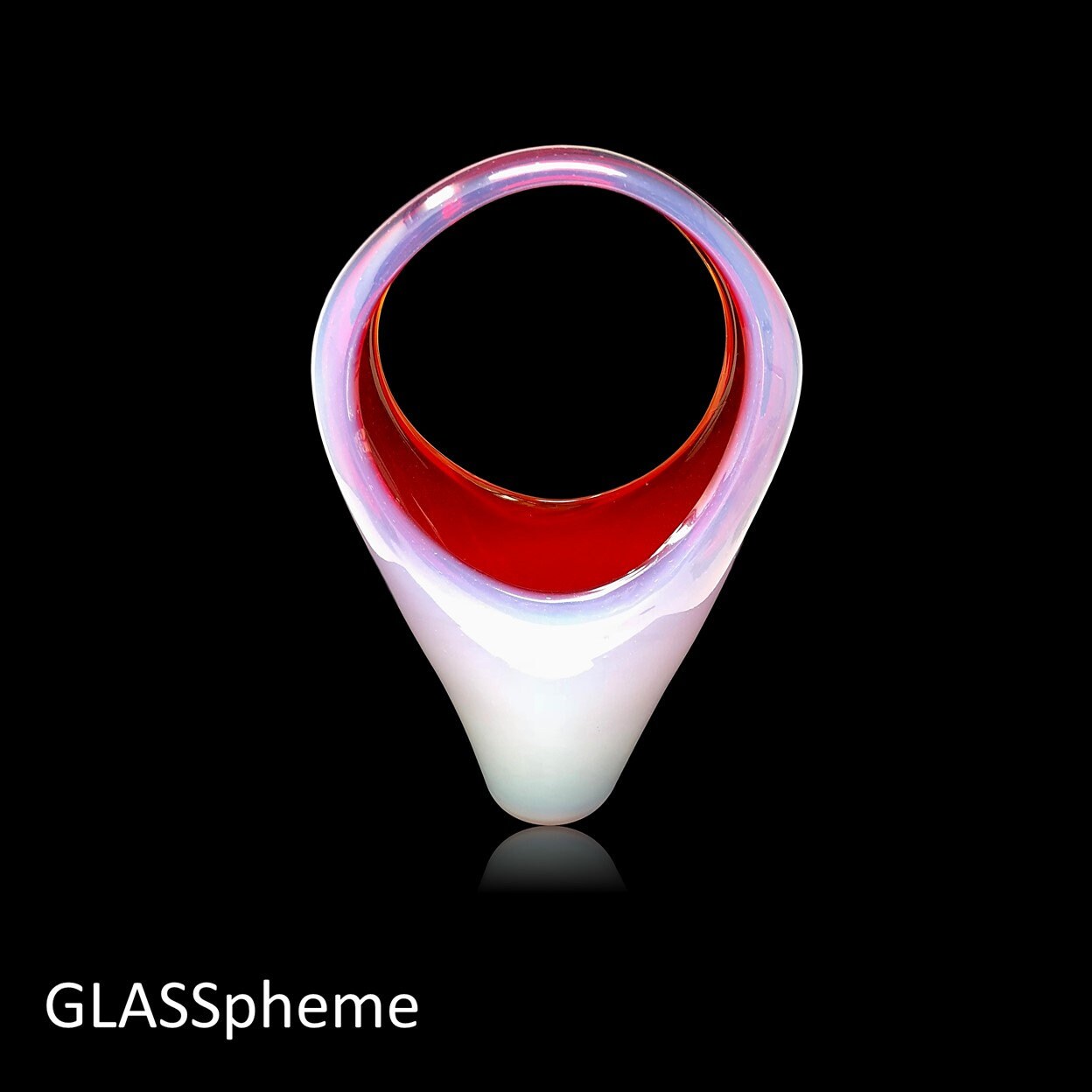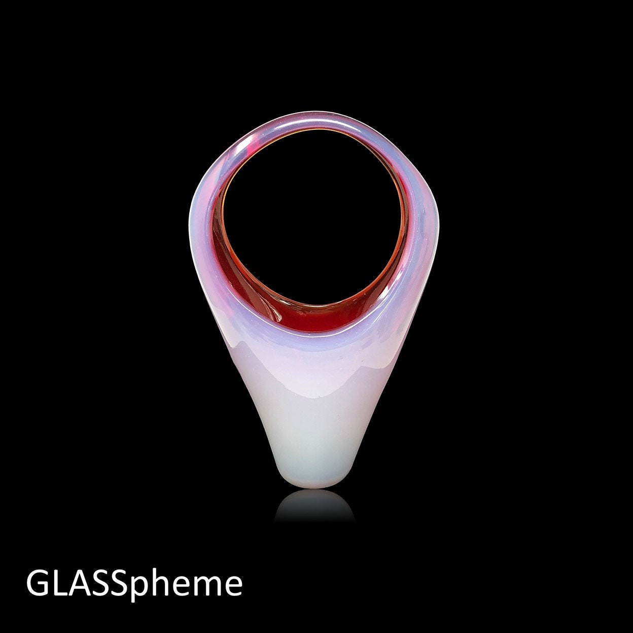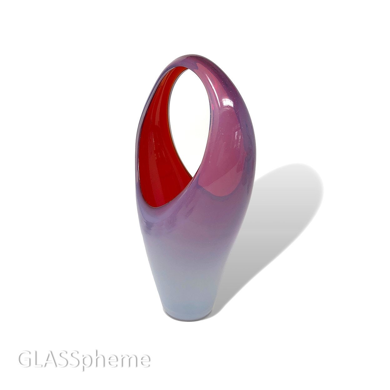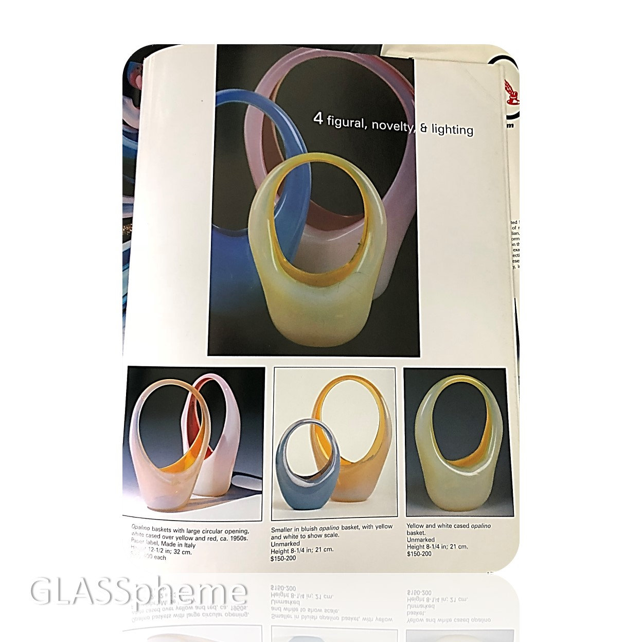 Feast your eyes on this extraordinary piece of mid-century Italian/Murano art glass by Fratelli Toso, variations of which are documented in Leslie Pina's FRATELLI TOSO. This breathtaking vase/basket/sculpture is amazing in its complexity--the opalescent lattimo, pinks, purples and bright red interior glowing and shifting constantly in the light. Aside from the base wear expected on this heavy piece, it is in excellent condition.