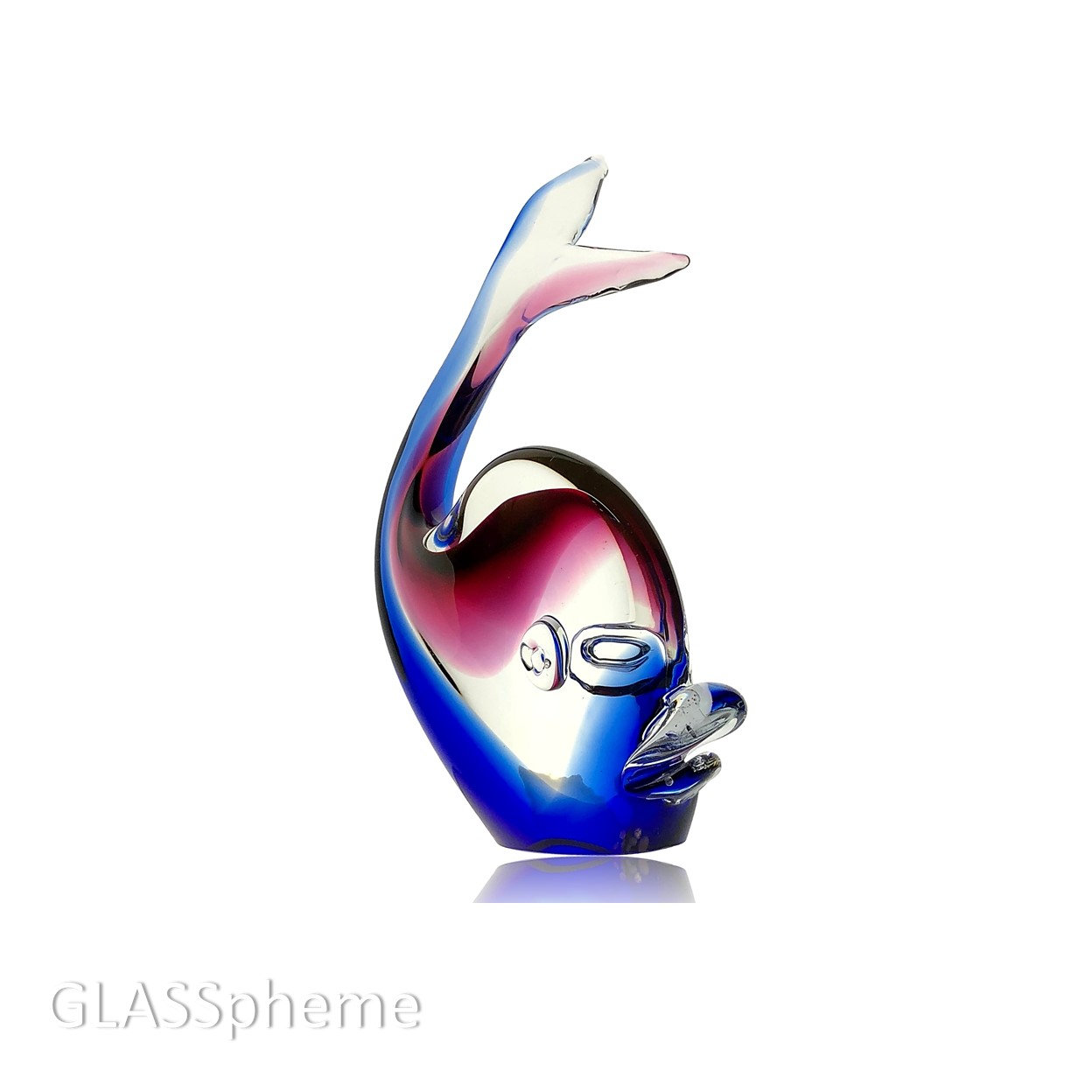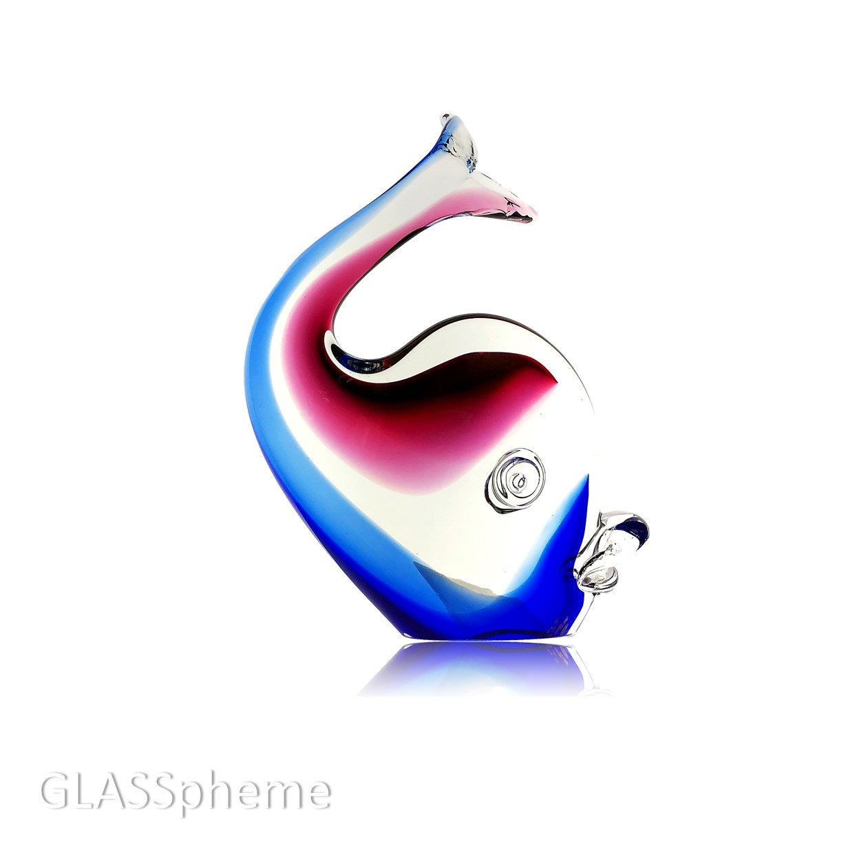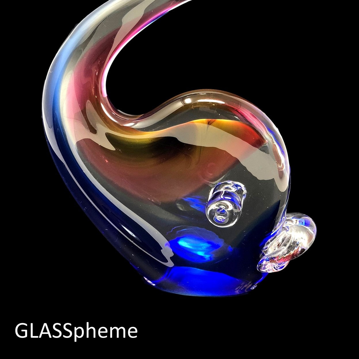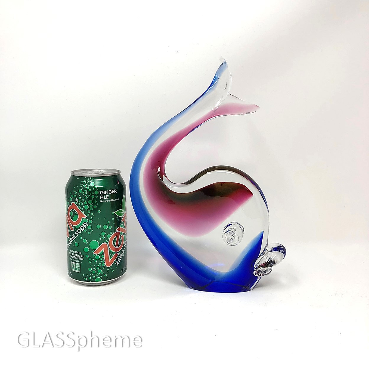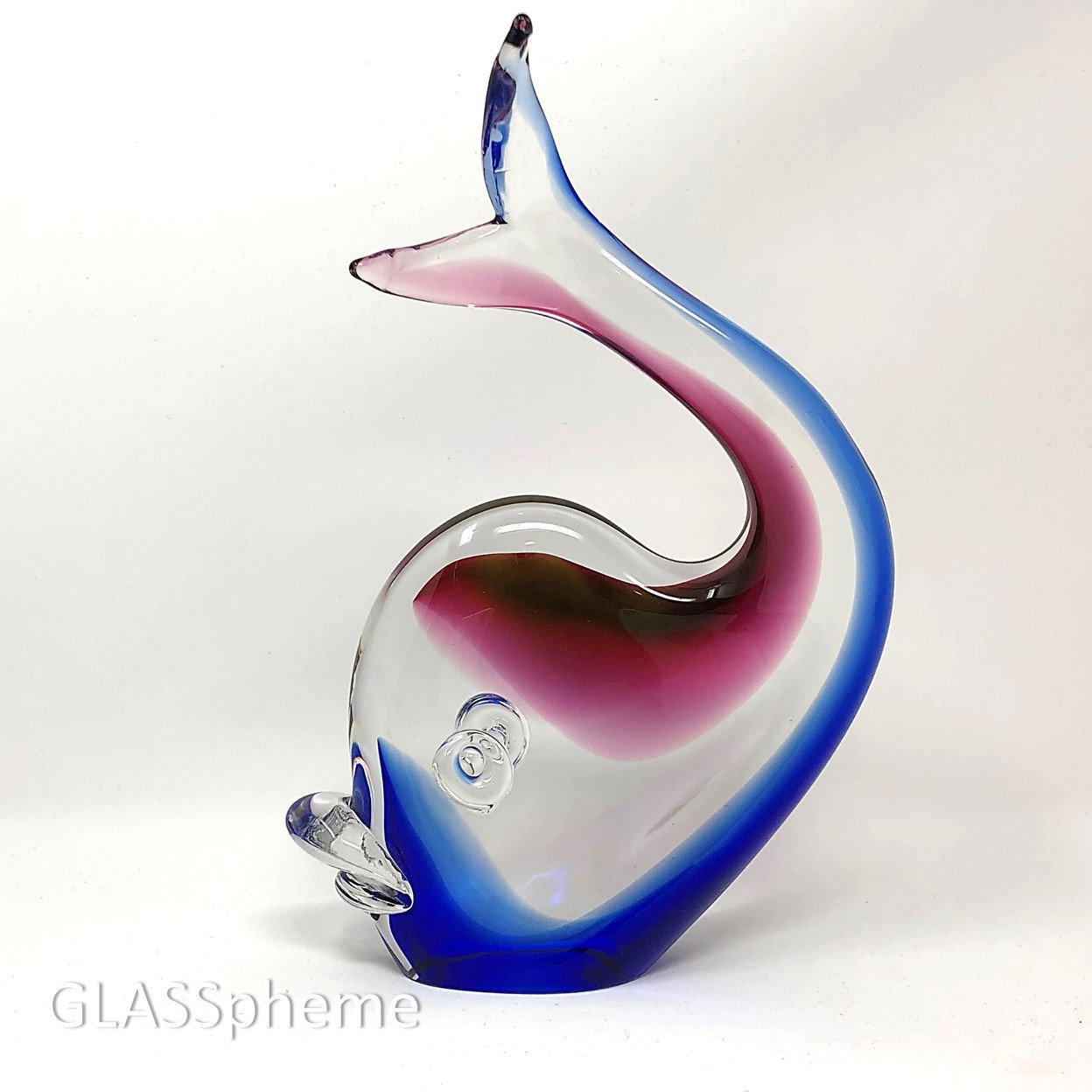 You're looking at a very cool C. 1980s Murano glass whale sculpture that I'm 99.9% sure was produced by Formia Vetri Di Murano (1962-2016). While unsigned and without a label, I have stored photos of similar pieces with the Formia label with the same fins and using the same technique--where the sommerso glass layers aren't solid, but rather incorporated on each side of the piece without touching in the middle creating marvelous optics. The first two photos were done with backlighting to try to accentuate the effect. The third, with a black backdrops, shows the complexity of the glass layers--notice the gold aventurine pattern on top of the cranberry layer. Also note the polished glass base (with age-appropriate signs of wear) -- China-based producers of 'faux Murano glass' more often than not leave their bases unpolished. Oball Glass (Luigi Onesto and then his sons) and Zanetti (Licio, then Oliver) and others have also produced similiar pieces for Oggetti through the years. This beauty just bears the hallmark of other Formia work.