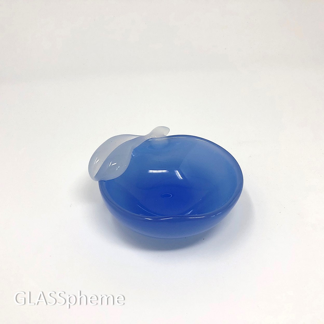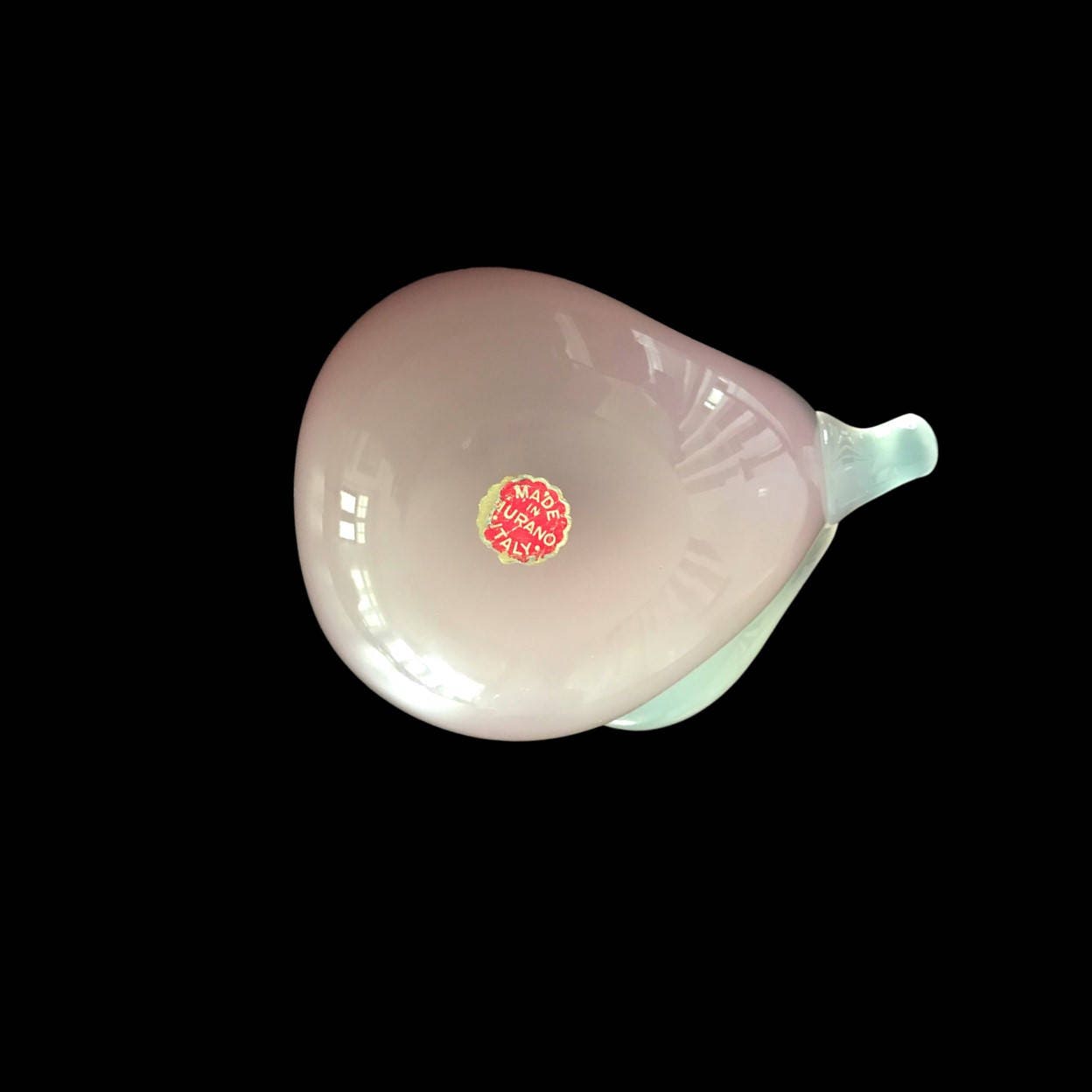 Magnificent mid-century Murano Seguso opaque / alabastro glass apple bowl or trinket dish done in an exquisite and not often seen periwinkle blue alabastro, with a white stylized leaf and stem. This beauty is PRISTINE and while it doesn't still have its label, the last photo is of the bottom of the matching pear piece in pink with the Seguso Made in Murano Italy label.