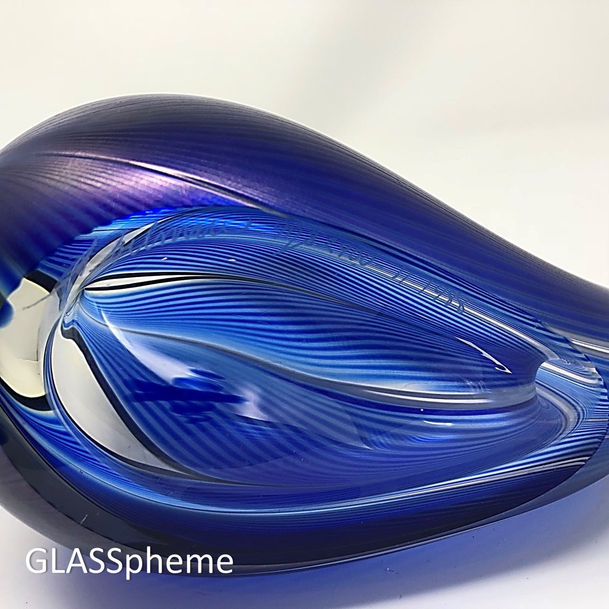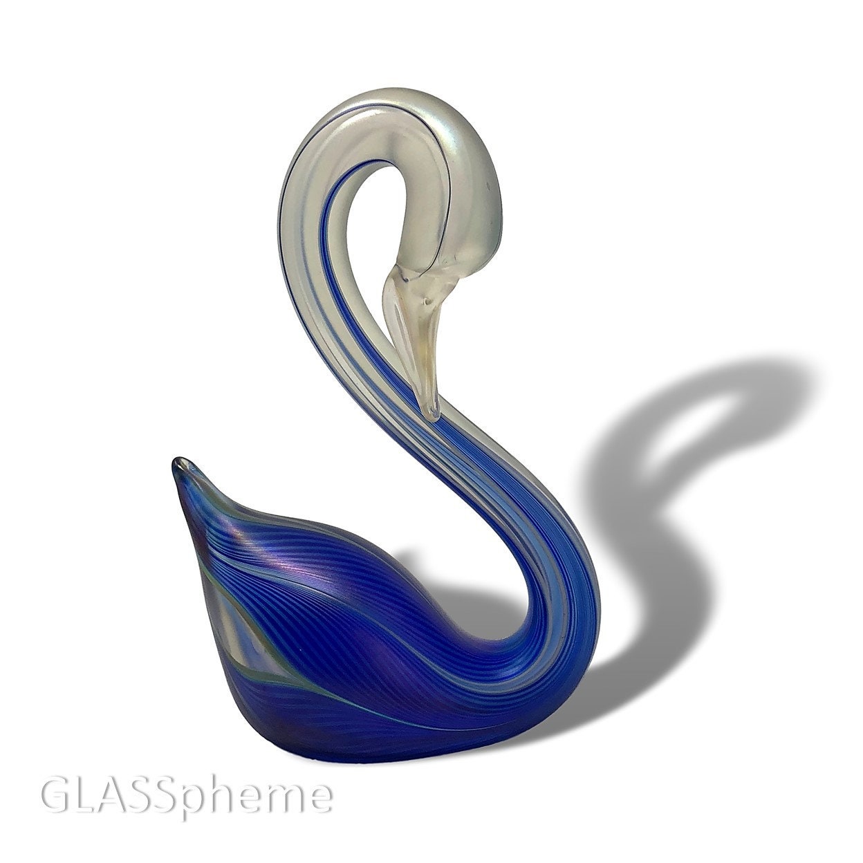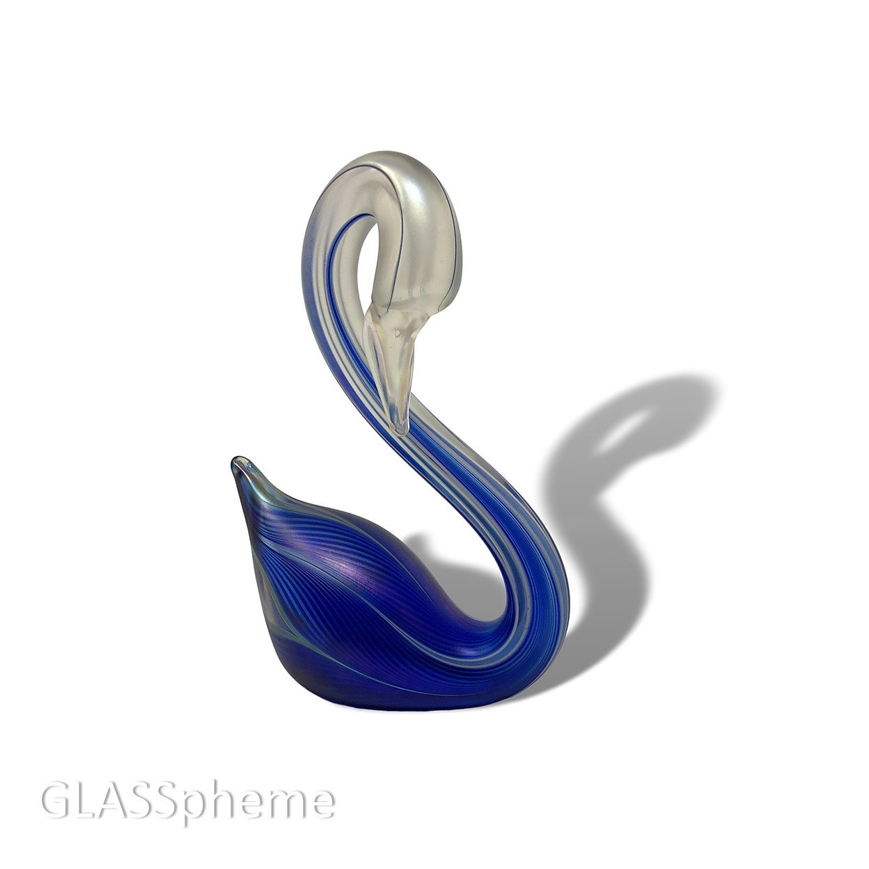 This is one ridiculously large and spectacular vintage iridescent pulled feather blown glass swan by US studio glass artist Stuart Abelman. Signed S Abelman M32900 11/1988, this is one of the older and larger sizes I've come across. Done in a deep cobalt blue pulled feather design with swirls of green, purple, etc. with a silvery iridescent finish, the complexity and beauty of this valuable vintage piece of American-made studio art glass will blow you away!