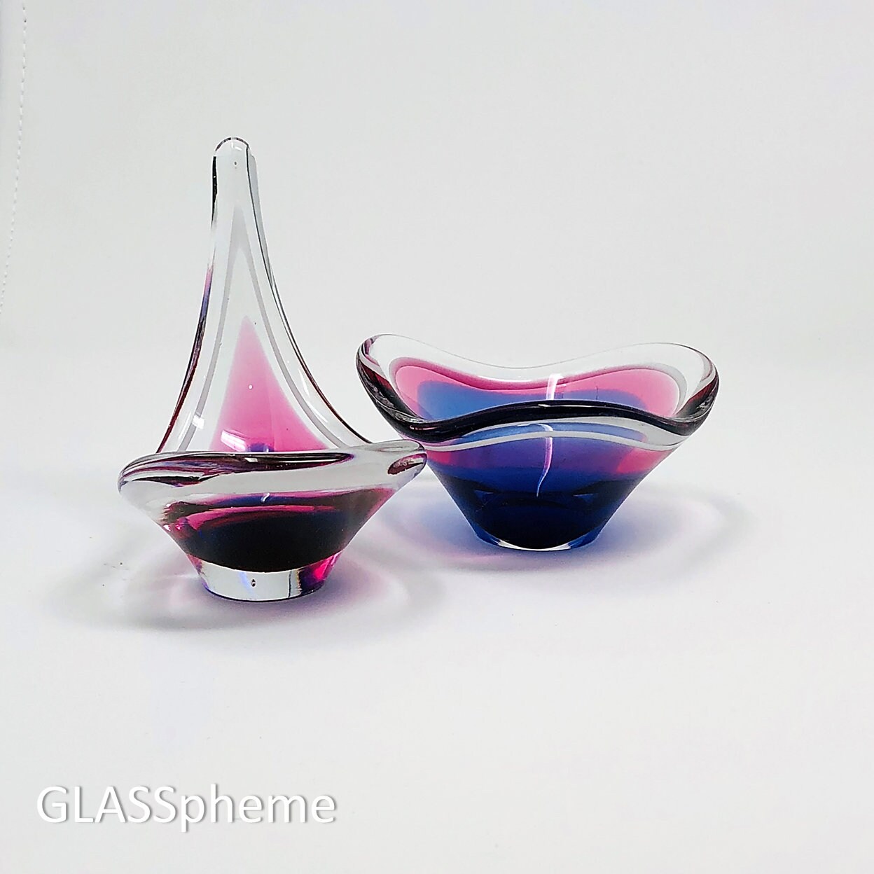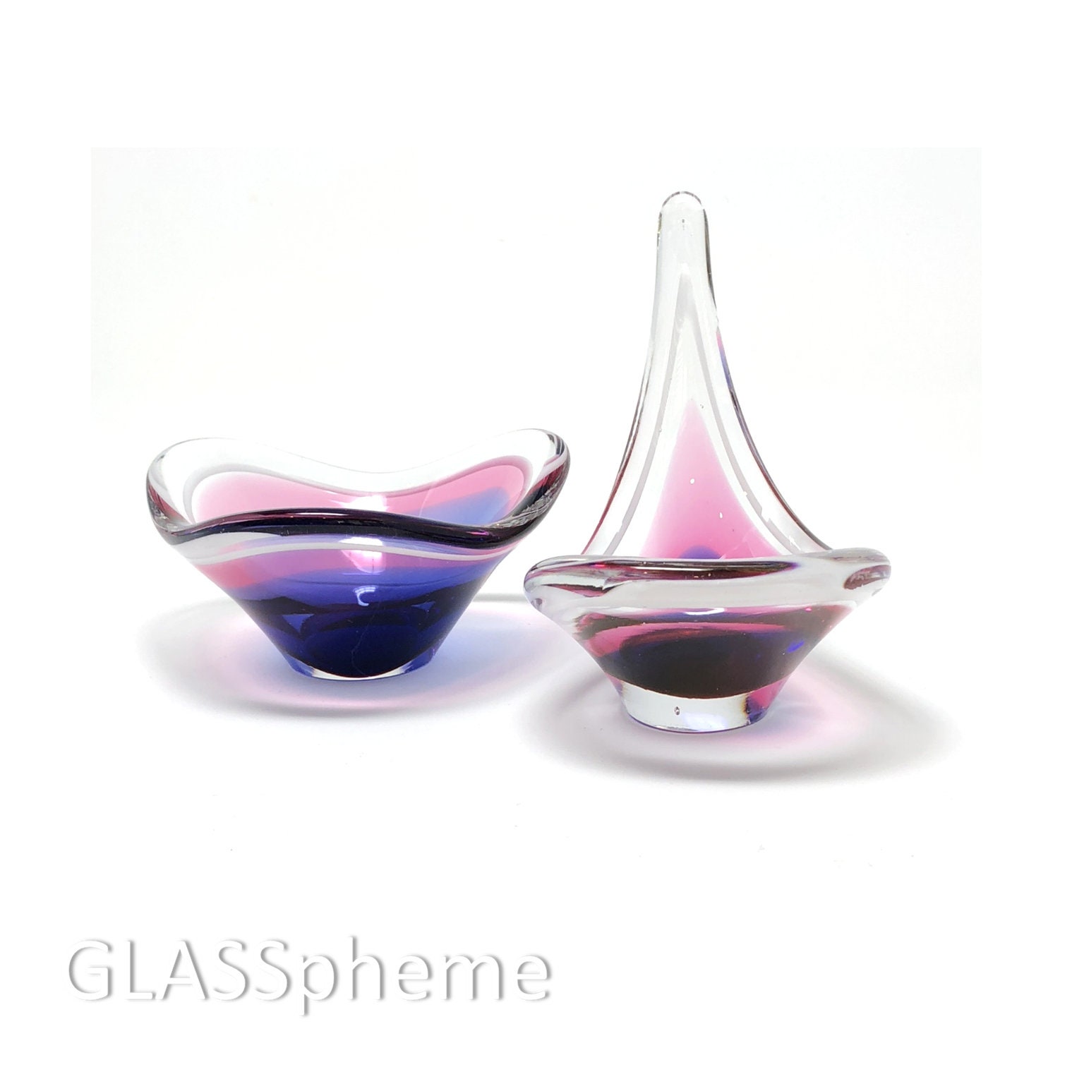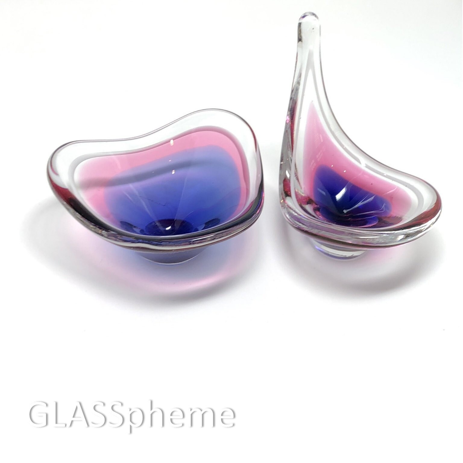 This adorable set of mid-century Flygfors Coquille biomorphic cased/sommerso purple and cranberry crystal pieces by Paul Kedelv are minty, gorgeous, and would make awesome trinket dishes or simply dazzle on display on your sunniest windowsill. Both pieces are signed and dated ('60 & '62) and aside from some base wear, have nary a scratch or a scuff. These would make GREAT stocking stuffers!
