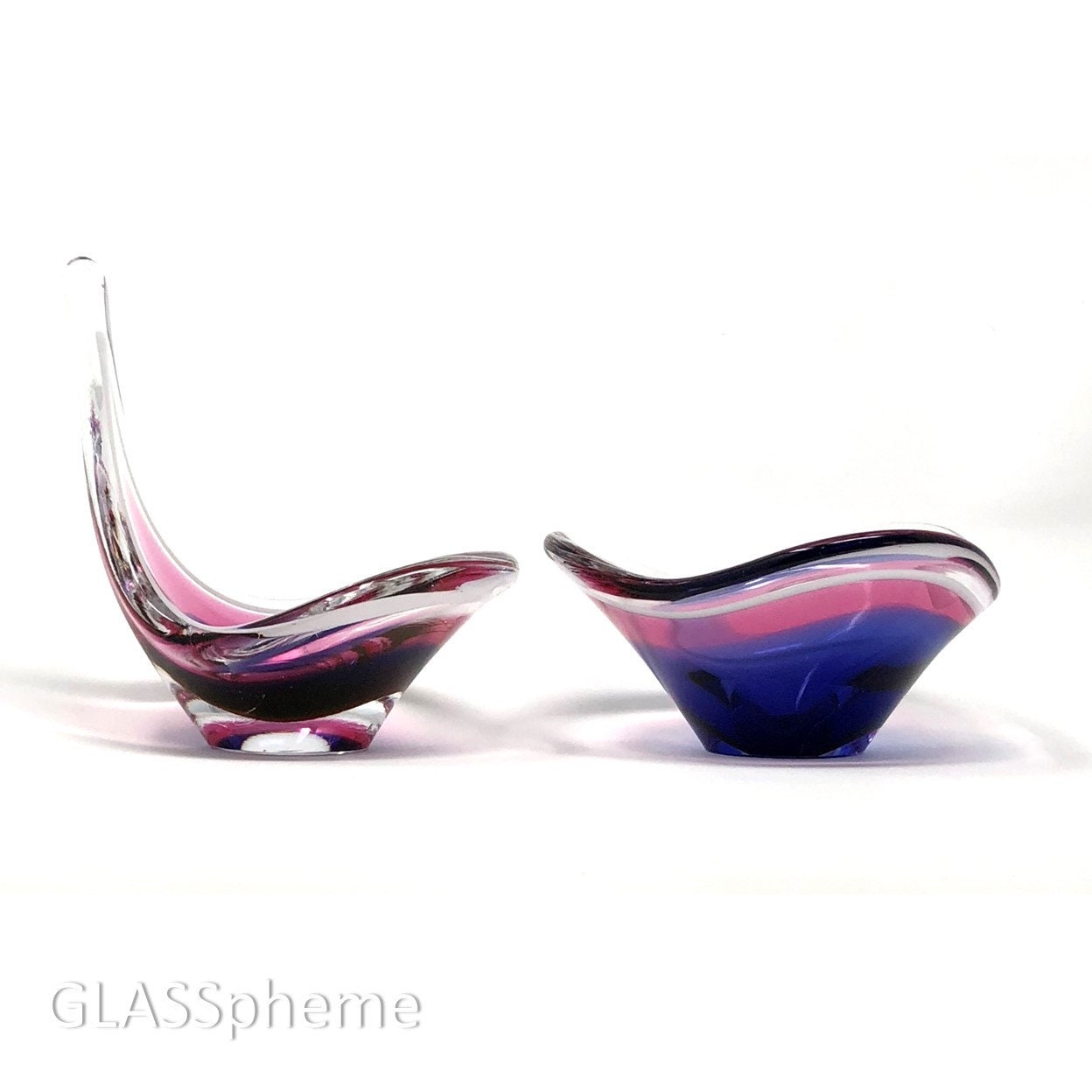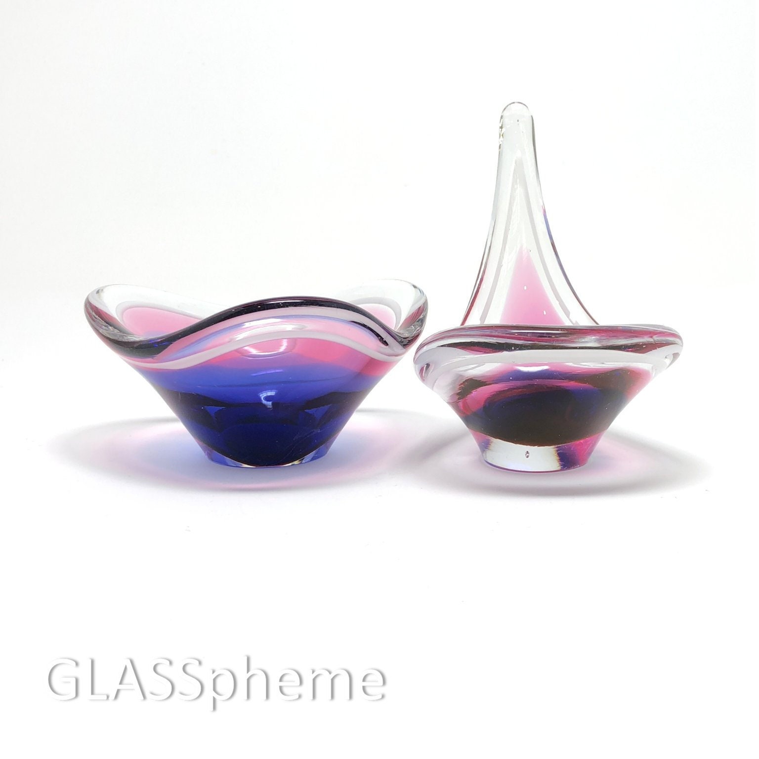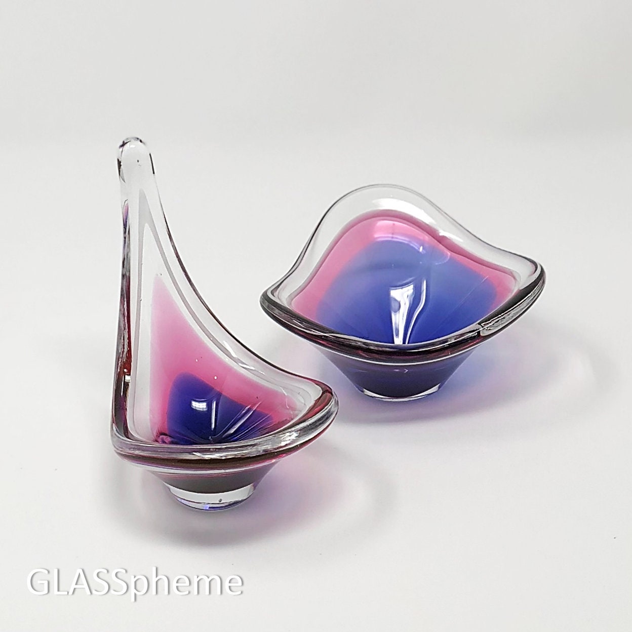 This adorable set of mid-century Flygfors Coquille biomorphic cased/sommerso purple and cranberry crystal pieces by Paul Kedelv are minty, gorgeous, and would make awesome trinket dishes or simply dazzle on display on your sunniest windowsill. Both pieces are signed and dated ('60 & '62) and aside from some base wear, have nary a scratch or a scuff. These would make GREAT stocking stuffers!
