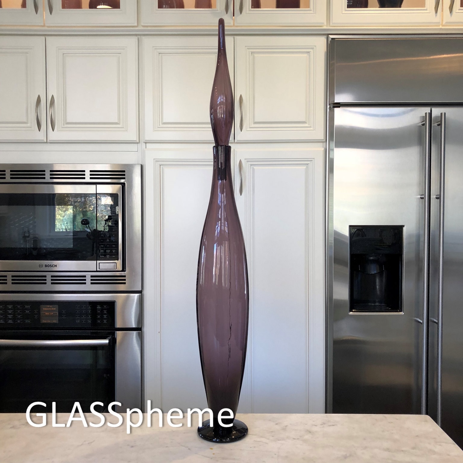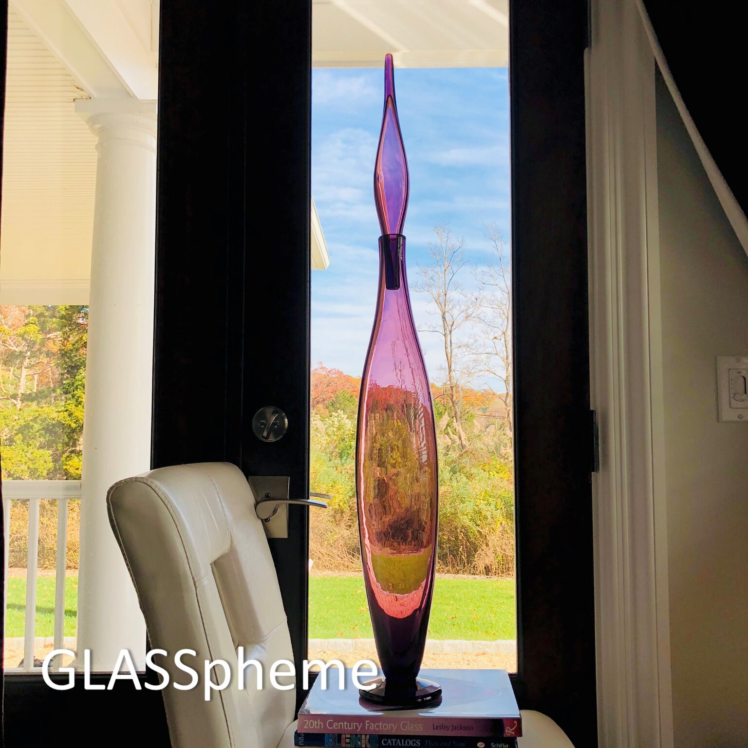 This 37" tall architectural size Blenko #628L glass decanter was designed by Wayne Husted for the 1962 catalog and made for ONE YEAR ONLY, putting it amongst the very rarest Blenkos EVER. In fact, I don't know of any other architectural-sized Blenkos that were made only for one year. Using Worthpoint's historical online auction sales as a proxy metric for rarity, this baby is off the charts! Only SIX of them were sold on eBay (properly attributed, that is) since 2007.