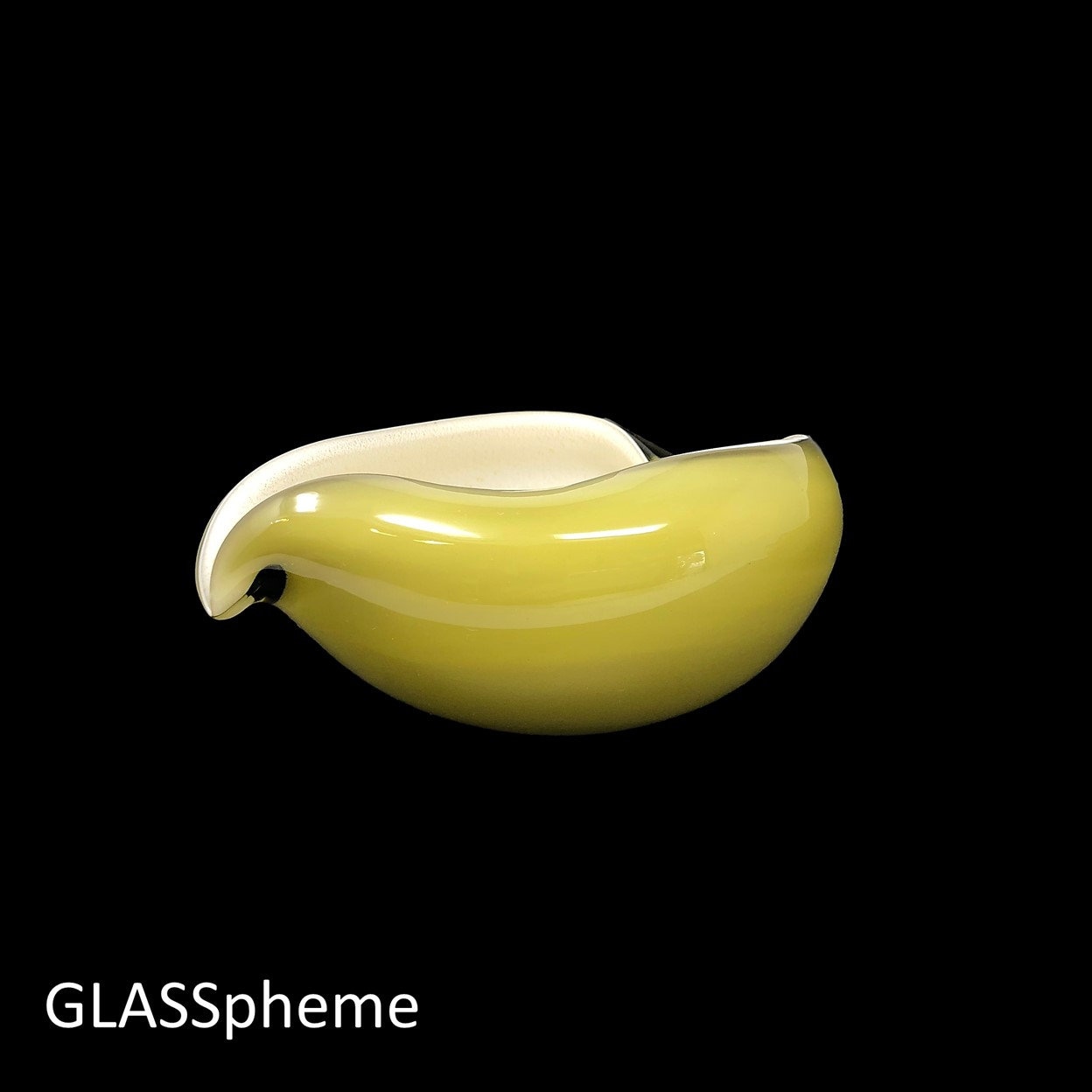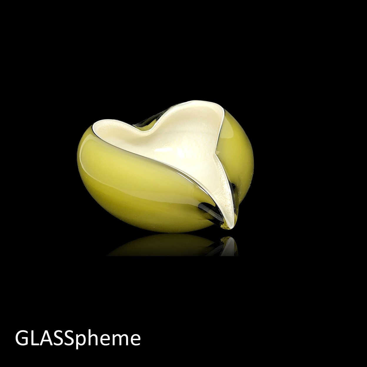 Exquisitely formed and in mint condition, this mid-century Murano bowl | ashtray | trinket dish is most likely by Alfredo Barbini for Weil Ceramics & Glass given nearly identical labeled pieces I've seen. The heavily gold-flecked white lattimo interior seems to be cream colored from a distance, but you'll want to get close to this one or you'll miss the heavenly mist of gold aventurine that makes this piece glitter. The thick exterior glass casing in done in a transparent green/gold, which sets off the gold spectacularly. Biomorphically shaped in a distinctly heart-like design, this precious Murano glass wonder would make an awesome gift! )