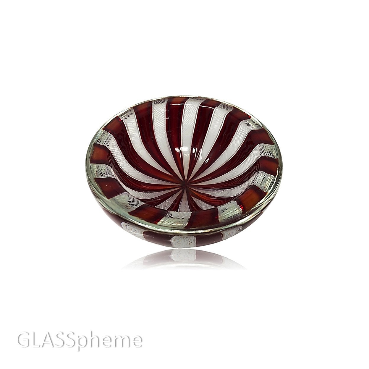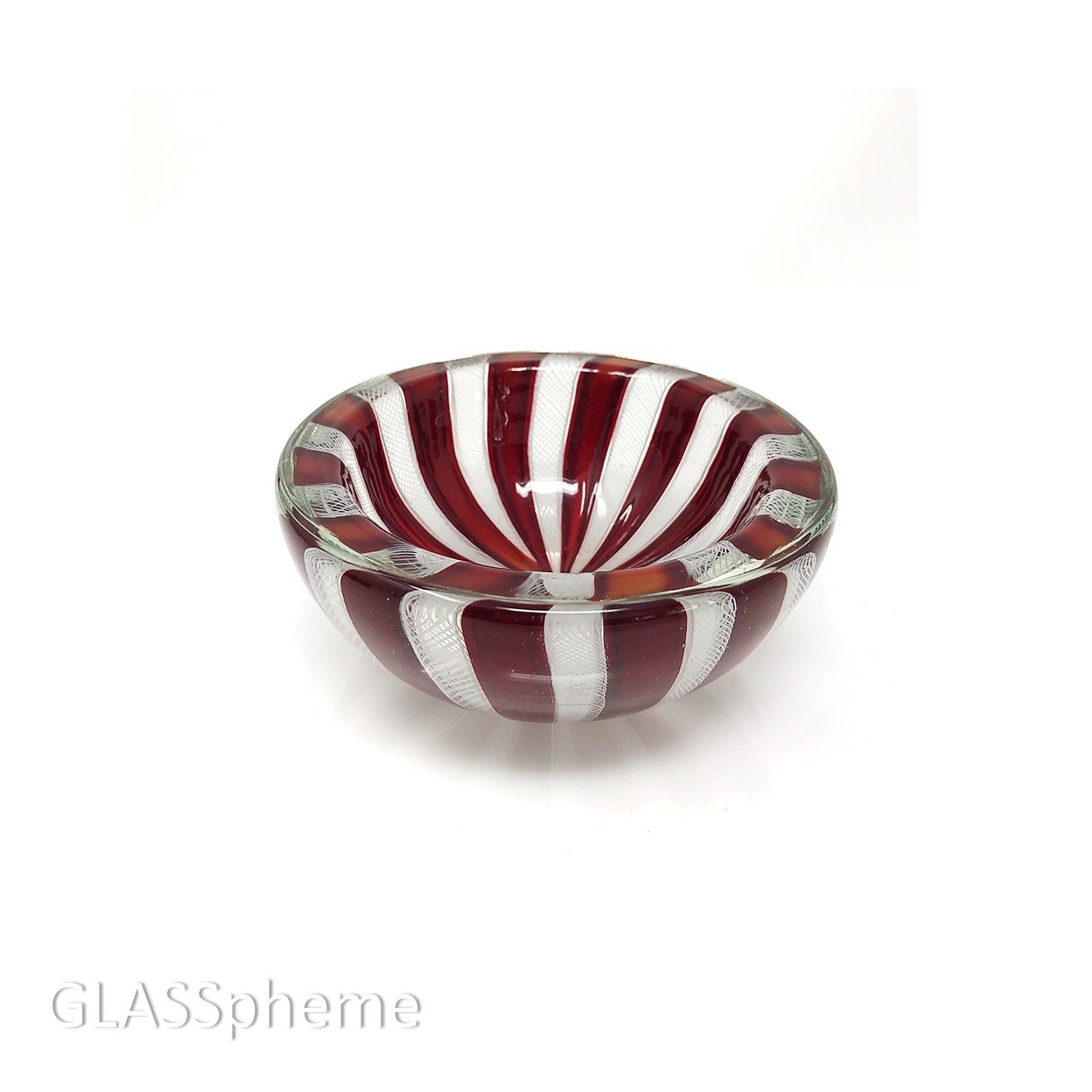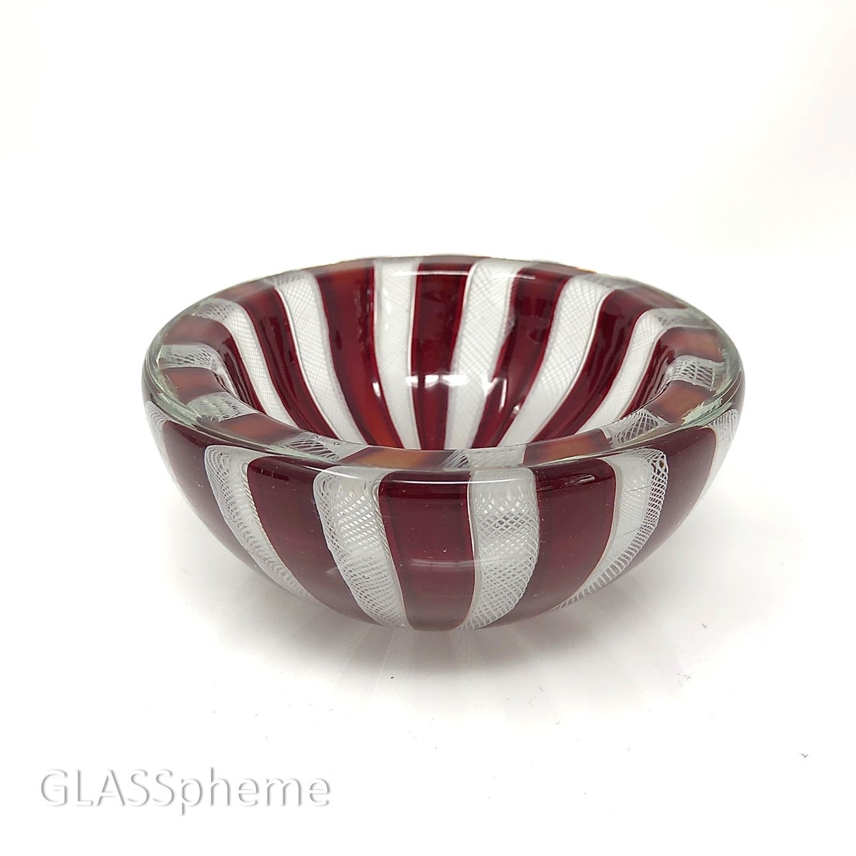 Given this gorgeous bowl's pinwheel design done in ruby red glass canes alternating with filigrana/zanfirico, I was certain that I'd see a Venini signature on the base when I first laid eyes on it, and was surprised to see NONE. As Venini signed virtually all of its pieces, I cannot attribute this beauty to the famous Murano company, but it clearly was done by one of the other mid-century Murano masters. I do wonder if it was perhaps a Venini 'second' -- the base looks to have been grounded twice, the first try a fail. Aside from the expected base wear due to age, there are light tool marks on the bowl's exterior that will need very close examination to find. A tiny bubble in the bowl's interior has been popped, but again, a common production issue so irrelevant to the beauty of this unique piece.