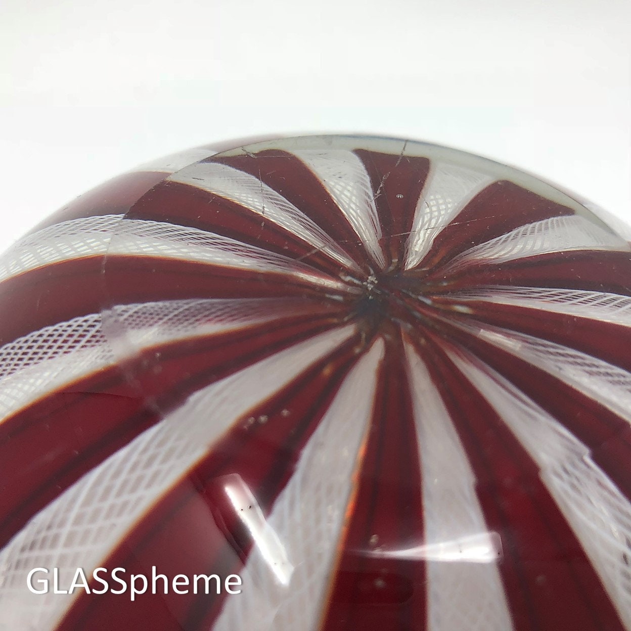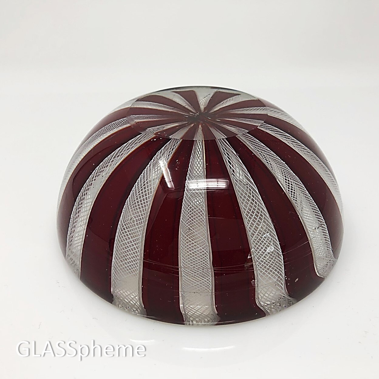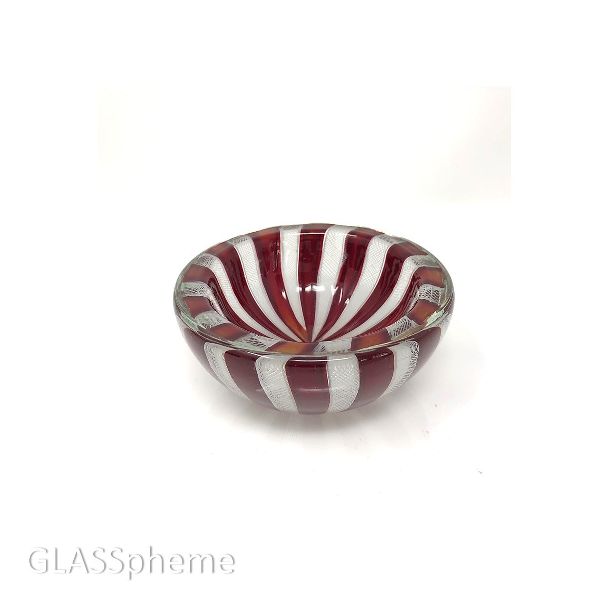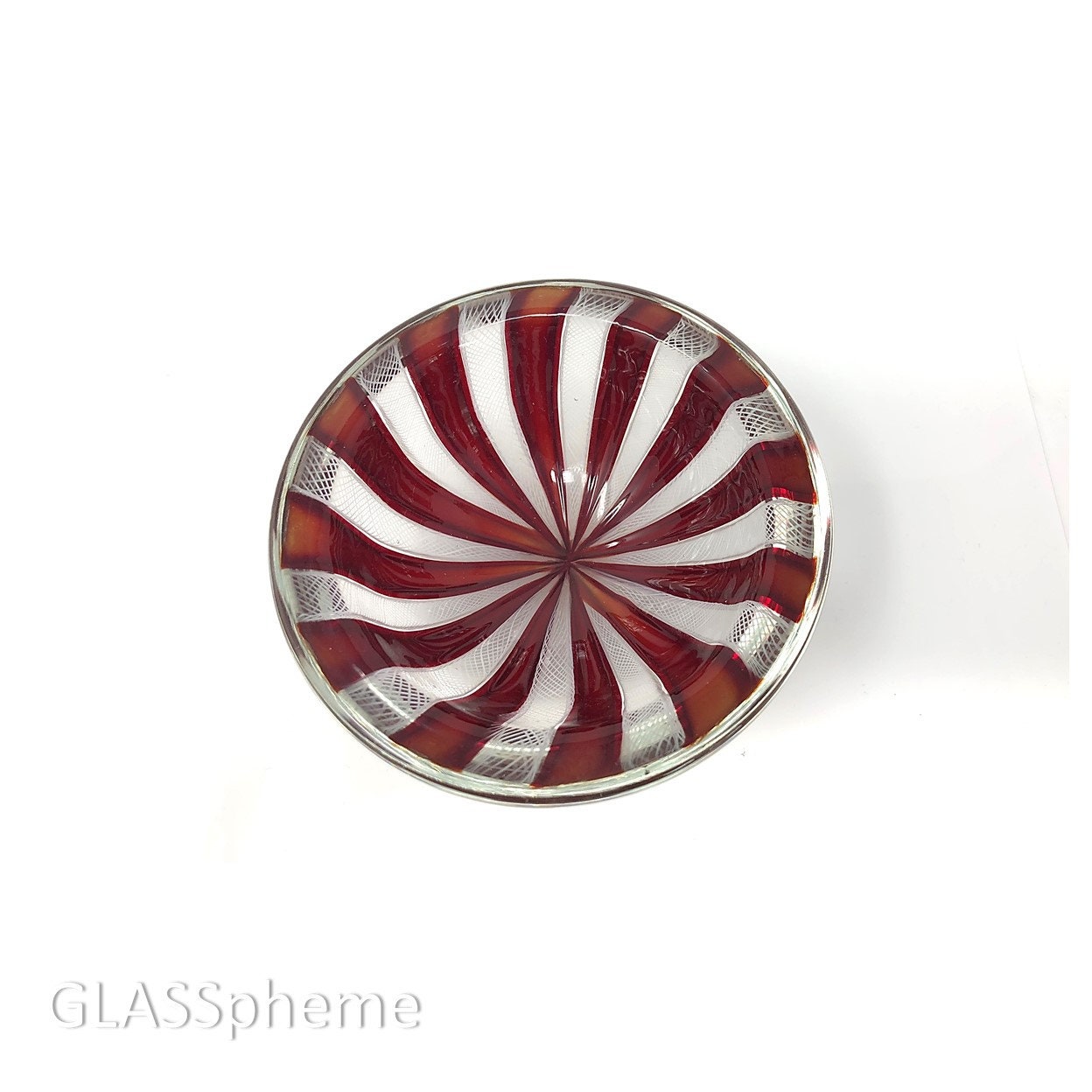 Given this gorgeous bowl's pinwheel design done in ruby red glass canes alternating with filigrana/zanfirico, I was certain that I'd see a Venini signature on the base when I first laid eyes on it, and was surprised to see NONE. As Venini signed virtually all of its pieces, I cannot attribute this beauty to the famous Murano company, but it clearly was done by one of the other mid-century Murano masters. I do wonder if it was perhaps a Venini 'second' -- the base looks to have been grounded twice, the first try a fail. Aside from the expected base wear due to age, there are light tool marks on the bowl's exterior that will need very close examination to find. A tiny bubble in the bowl's interior has been popped, but again, a common production issue so irrelevant to the beauty of this unique piece.