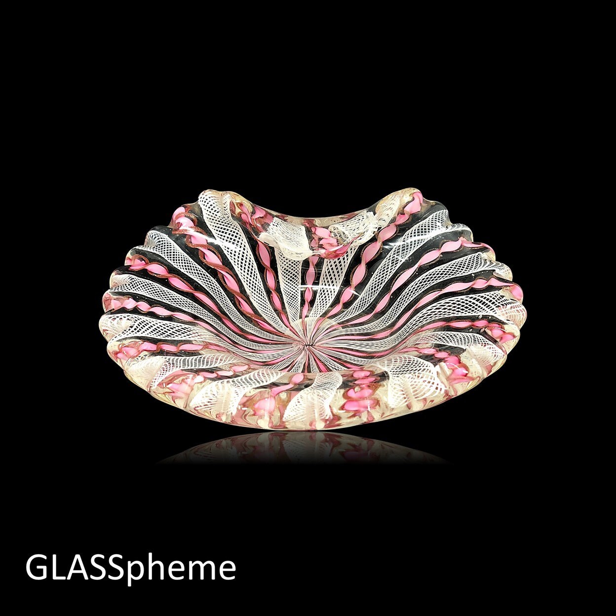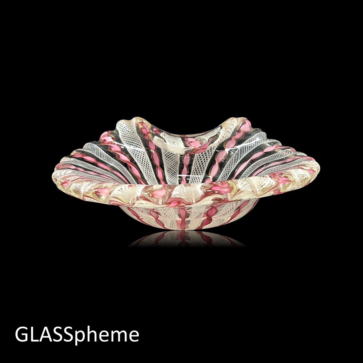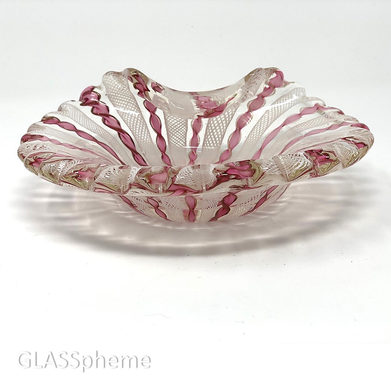 This exquisite twisted ribbon, zanfirico bowl, heavily encased in crystal glass folded with scalloped edges is unmistakably a mid-century Fratelli Toso creation. The pink ribbons, delicately edged in gold aventurine, alternate with white thatched filigrana and with the thick crystal casing and folded rim, the exquisite old Venetian latticino cane work style is suddenly a modern biomorphic beauty. With the exception of the good honest base wear (testimony to its age), this lovely piece is in perfect condition. This would make a perfect gift or use it for yourself! Beautiful old Murano art glass is wonderful on display, but even better for use in everyday life--as a trinket dish for your dresser or vanity, or even a soapdish in your guest bath.