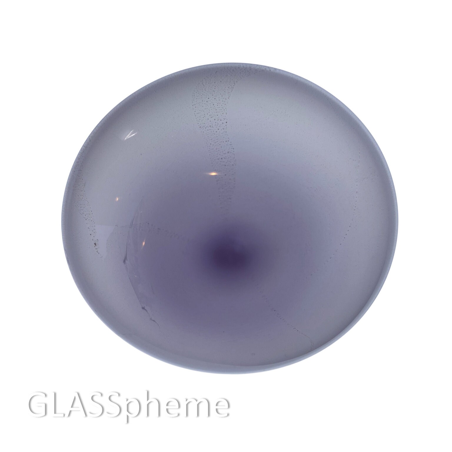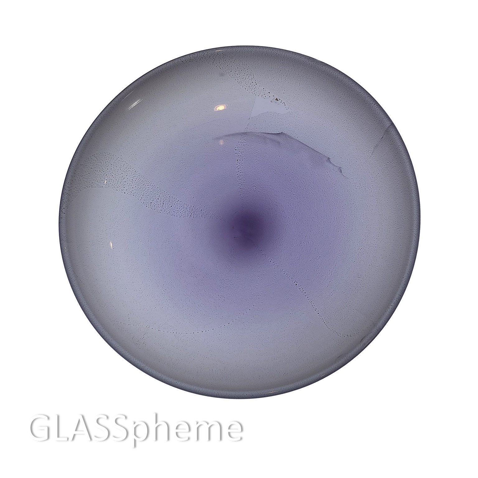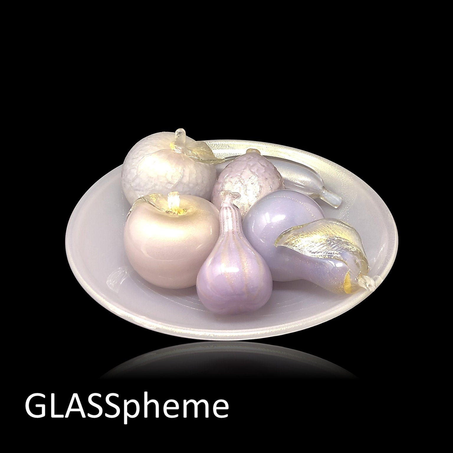 PLATTER: The bowl/platter, roughly 12.75" in diameter and 2" high, is done in a thick and luxurious pale opalescent lavender overlaid in gold aventurine. In itself, weighing in at nearly 5 lbs, this is one of the most magnificent Murano platters I've ever seen. It appears to have suffered an internal fracture in production -- I've included many photos of it, including with backlighting to get a better idea of what I'm trying to describe. Ultimately, neither the structural stability of the piece nor its presentation appears affected. Even without the fruits on it, it looks beautiful and perfect on display. With the fruits, the potential damage is pretty irrelevant to both use and display.