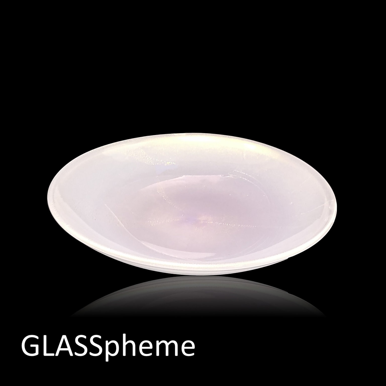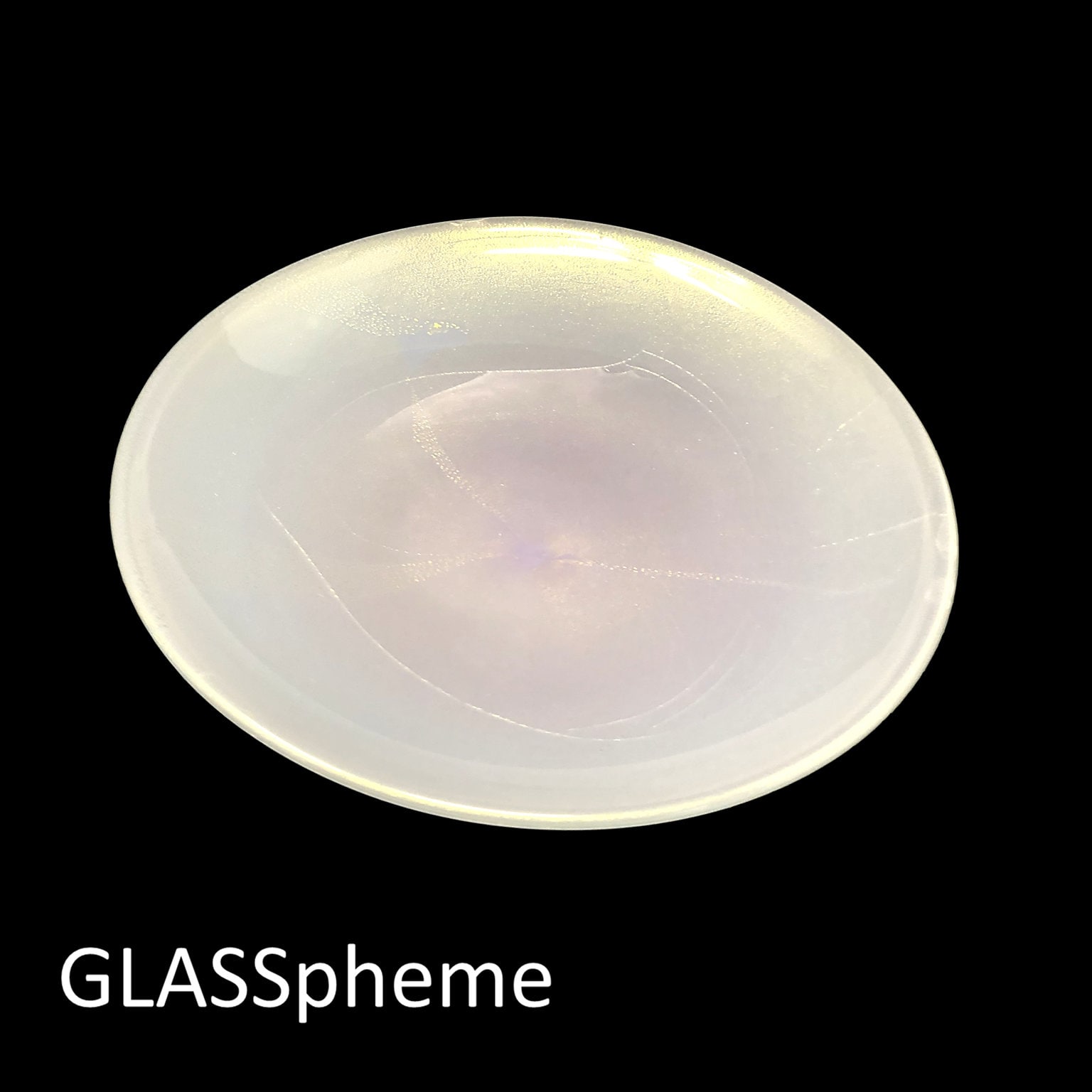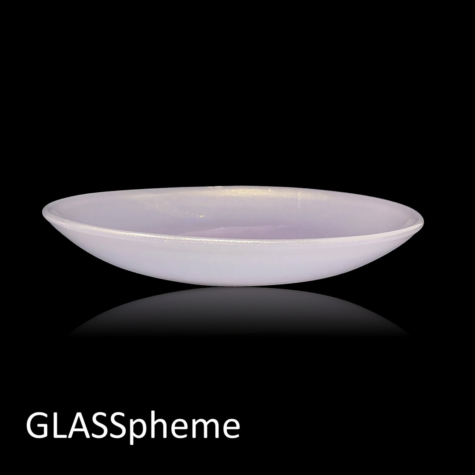 PLATTER: The bowl/platter, roughly 12.75" in diameter and 2" high, is done in a thick and luxurious pale opalescent lavender overlaid in gold aventurine. In itself, weighing in at nearly 5 lbs, this is one of the most magnificent Murano platters I've ever seen. It appears to have suffered an internal fracture in production -- I've included many photos of it, including with backlighting to get a better idea of what I'm trying to describe. Ultimately, neither the structural stability of the piece nor its presentation appears affected. Even without the fruits on it, it looks beautiful and perfect on display. With the fruits, the potential damage is pretty irrelevant to both use and display.
