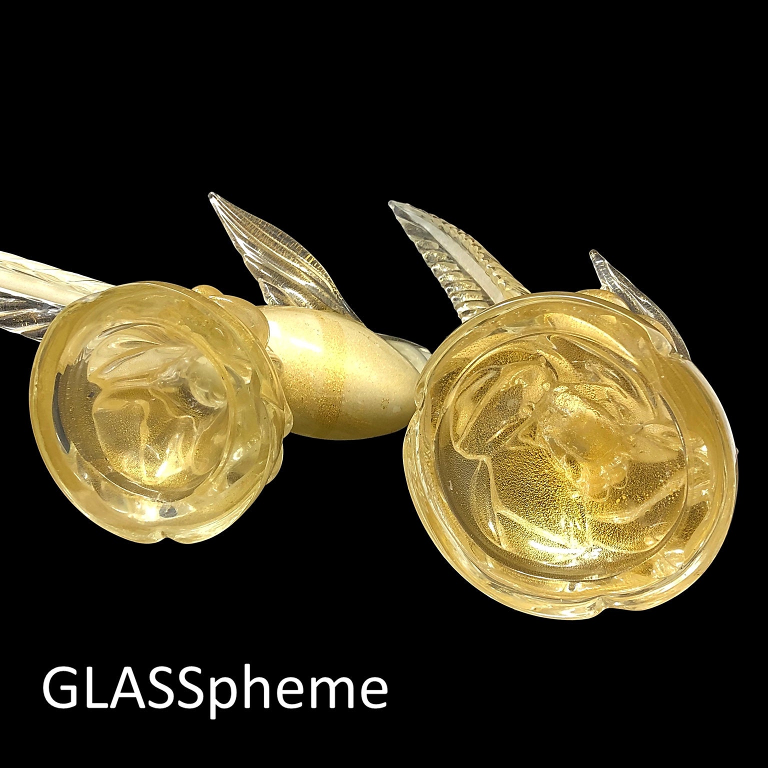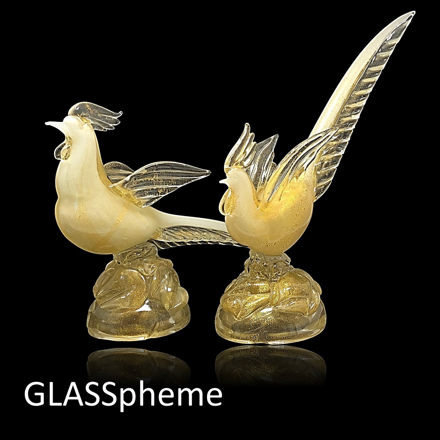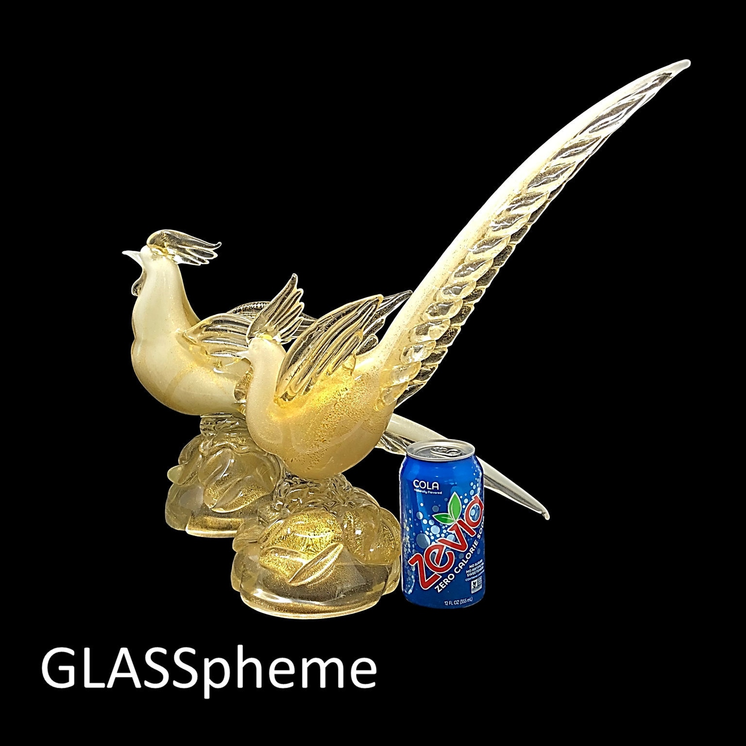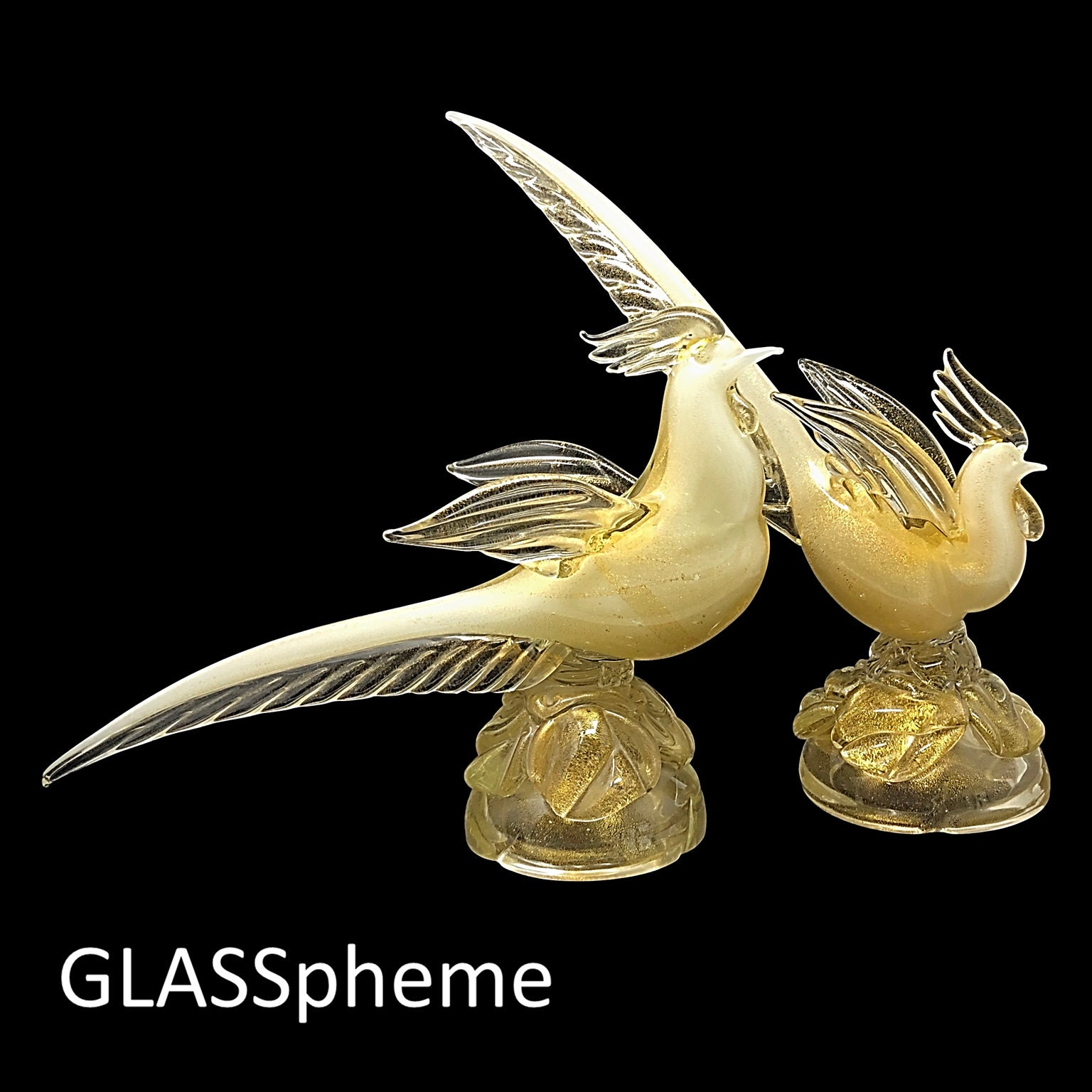 These massive SWOON-WORTHY lovebirds by Archimede Seguso are as opulent and luxurious as top quality vintage Murano glass gets! Heavily flecked with gold aventurine throughout, the birds have creamy white alabastro bodies and clear glass bases, wings and feathers. No labels on these beauties, but I've included a shot of the base of a smaller bird in the same design, which does have the remnants of a label. Moreover, the same design is featured in the Murano Zoo:
