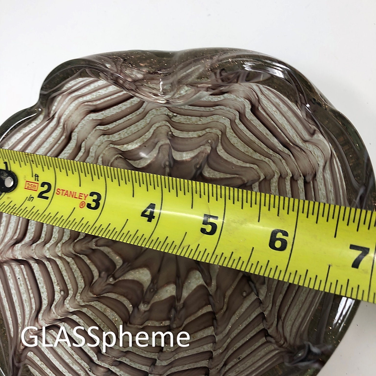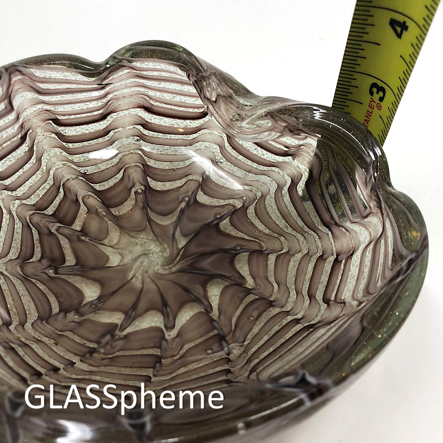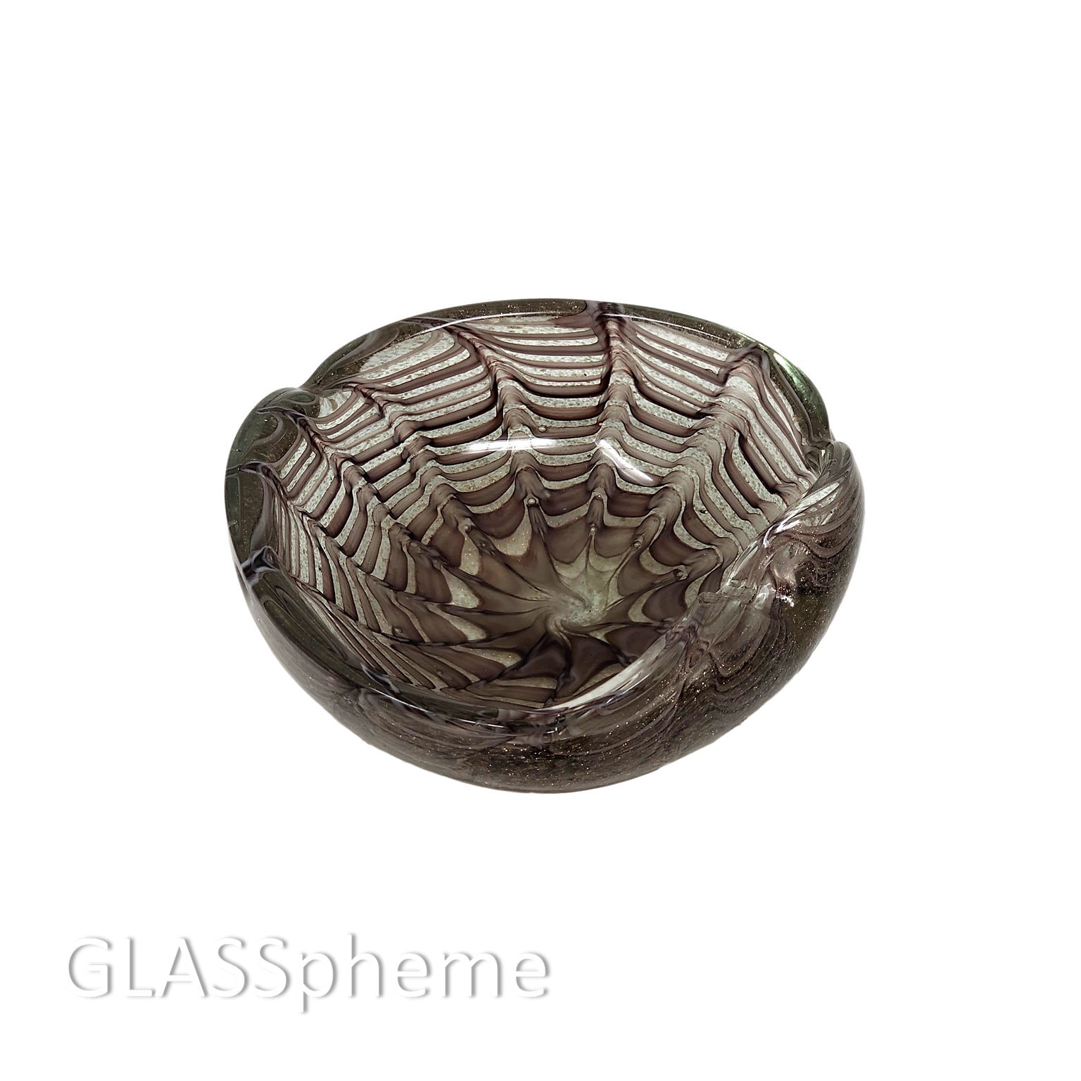 You're looking at an extraordinarily beautiful 'glass bowl or ashtray by Barovier & Toso strewn with EGGPLANT 'grafitto' and copper flecks and encased in thick crystal glass. The copper make the bowl glitter from every vantage point! The thickness and heft of this stunner (it weights in at 3.3 lbs!) and its warm coppery/brown hues make it a perfect holiday gift for your favorite guy. The design is well documented, but this particular form is quite uncommon.