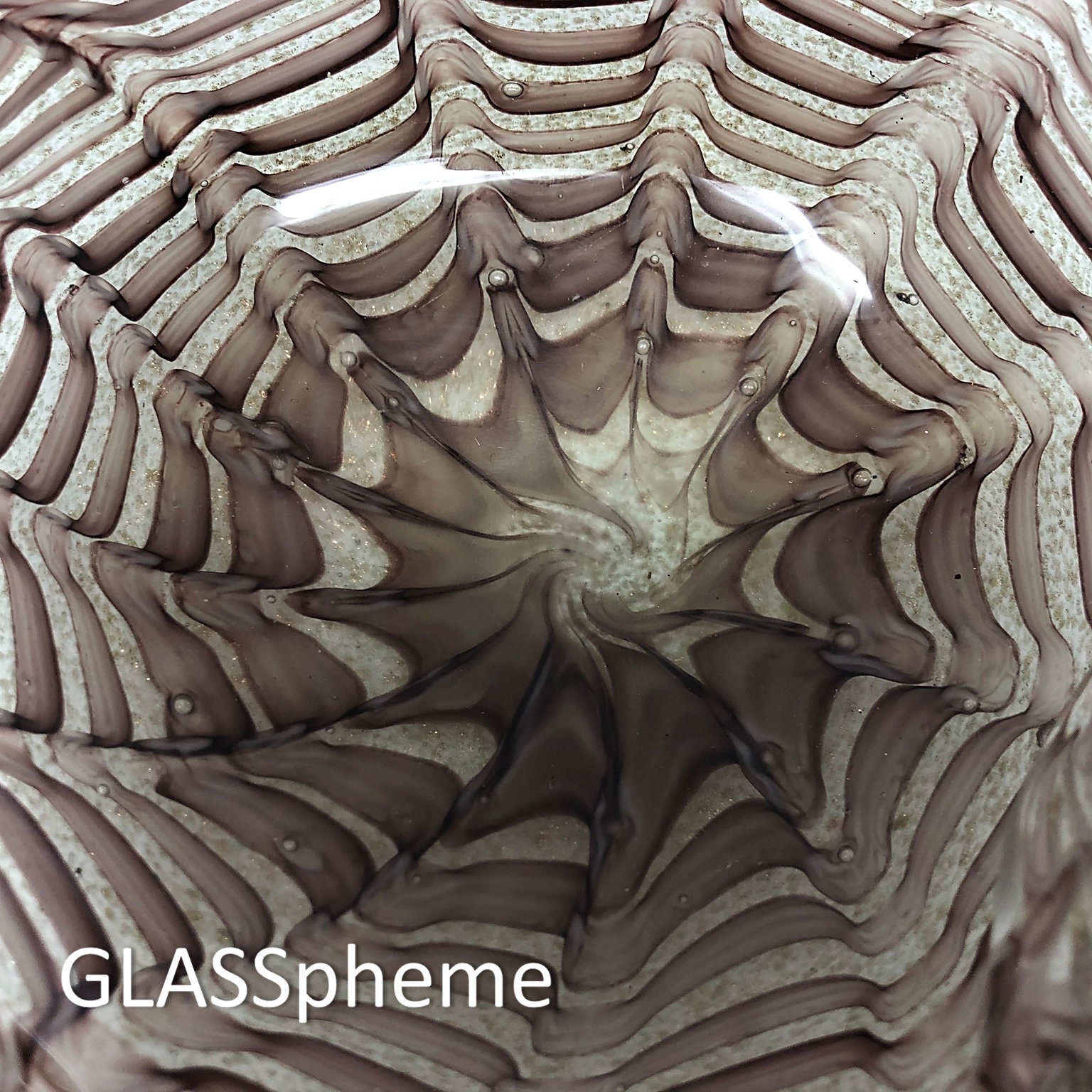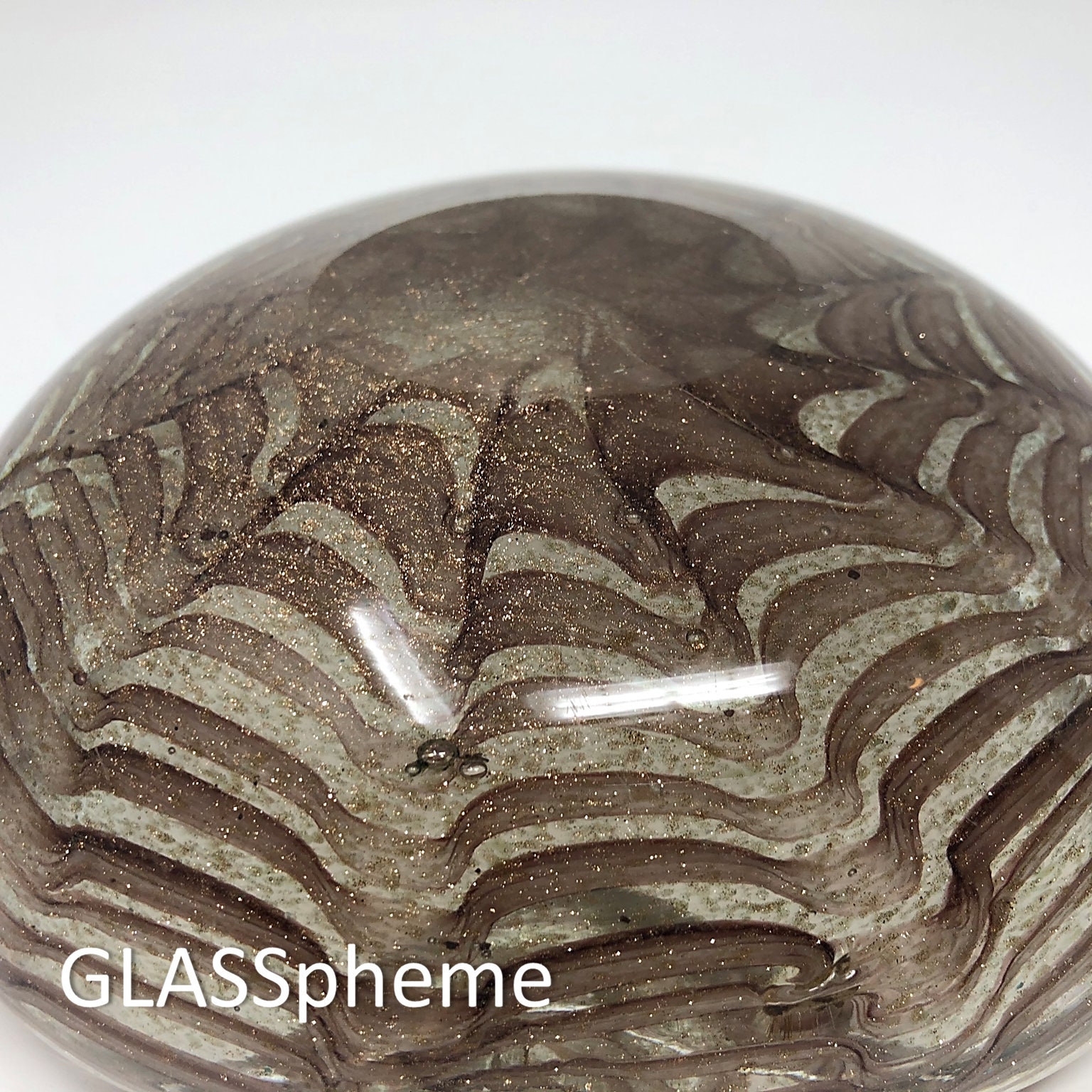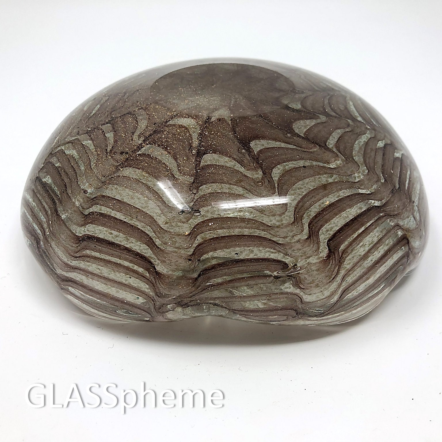 You're looking at an extraordinarily beautiful 'glass bowl or ashtray by Barovier & Toso strewn with EGGPLANT 'grafitto' and copper flecks and encased in thick crystal glass. The copper make the bowl glitter from every vantage point! The thickness and heft of this stunner (it weights in at 3.3 lbs!) and its warm coppery/brown hues make it a perfect holiday gift for your favorite guy. The design is well documented, but this particular form is quite uncommon.