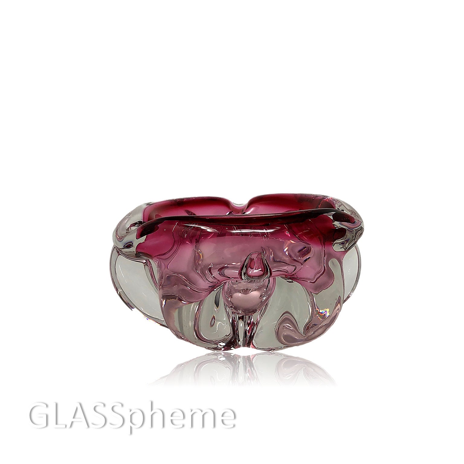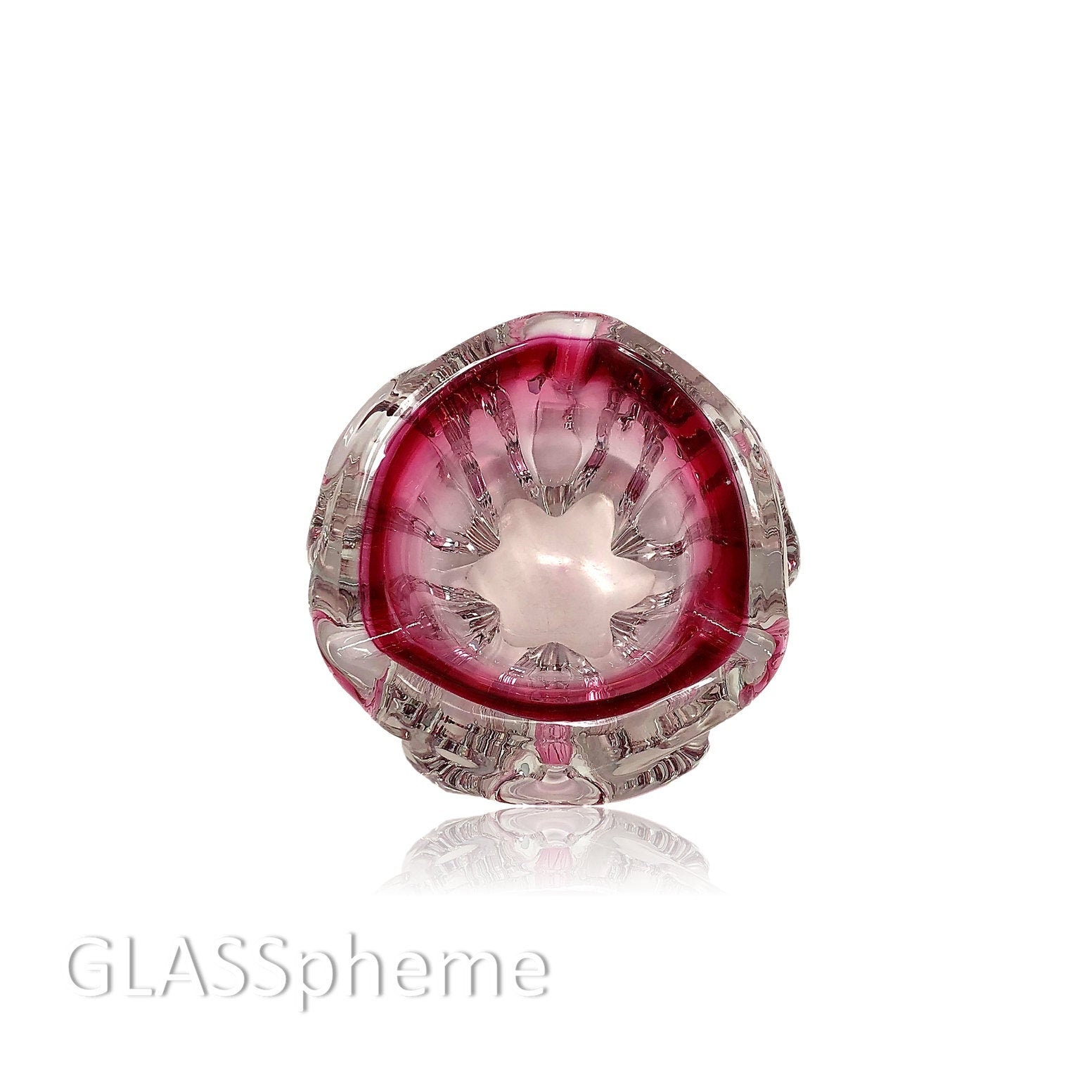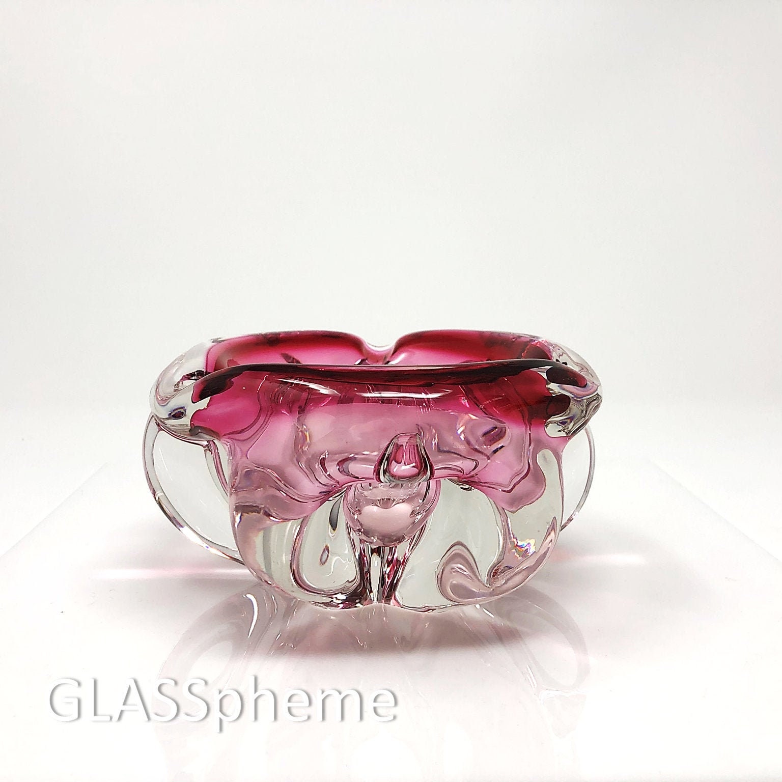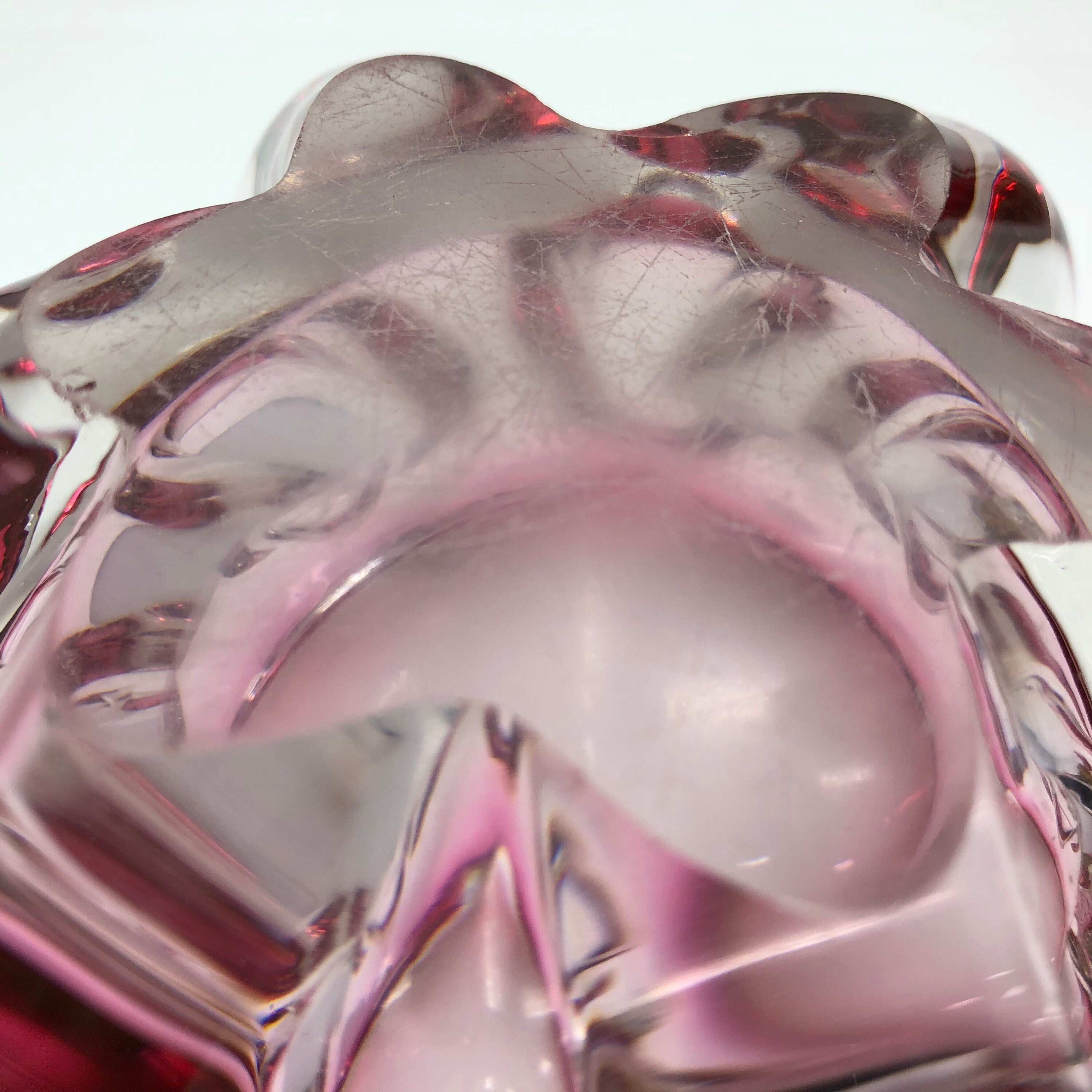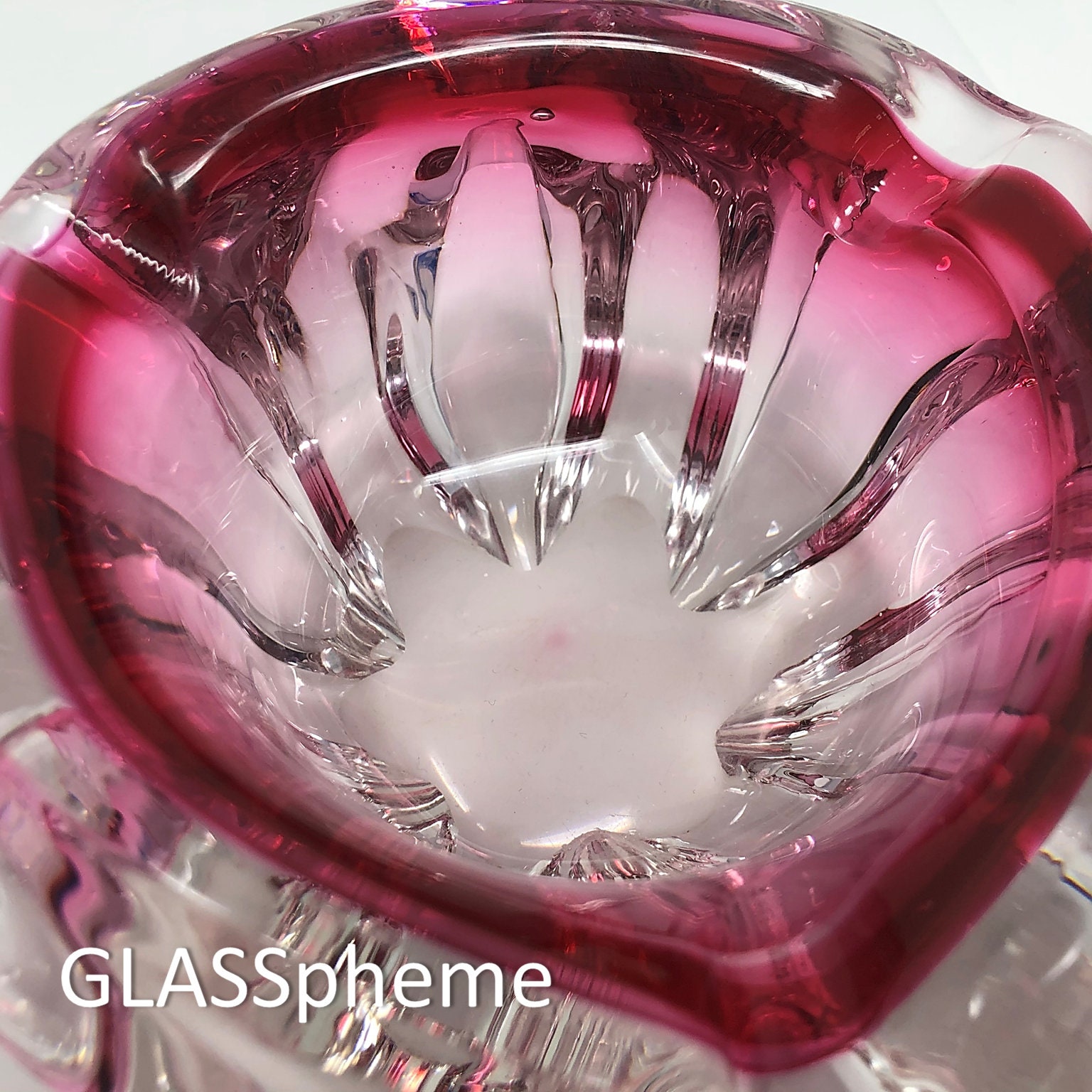 You're looking at a serious piece of mid-century art glass--a 7" wide thick and heavy (nearly 4.5 lbs!) sommerso bowl or ashtray in seriously hot pink blending to clear glass. You'd be forgiven for mistaking this chunky marvel as a Murano masterpiece, but this massive biomorphic bad boy is most likely by Josef Hospodka for SKLO Union Chribska Glassworks, once a reknowned Bohemian glass producer in continuous production for centuries.