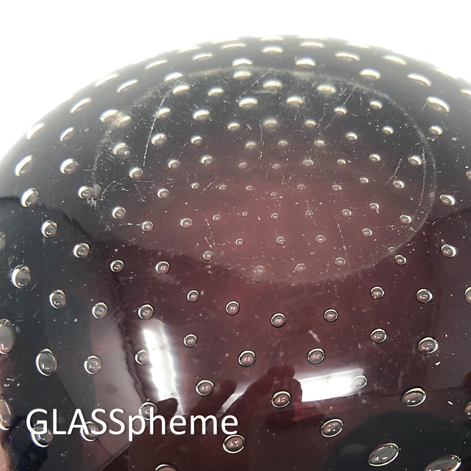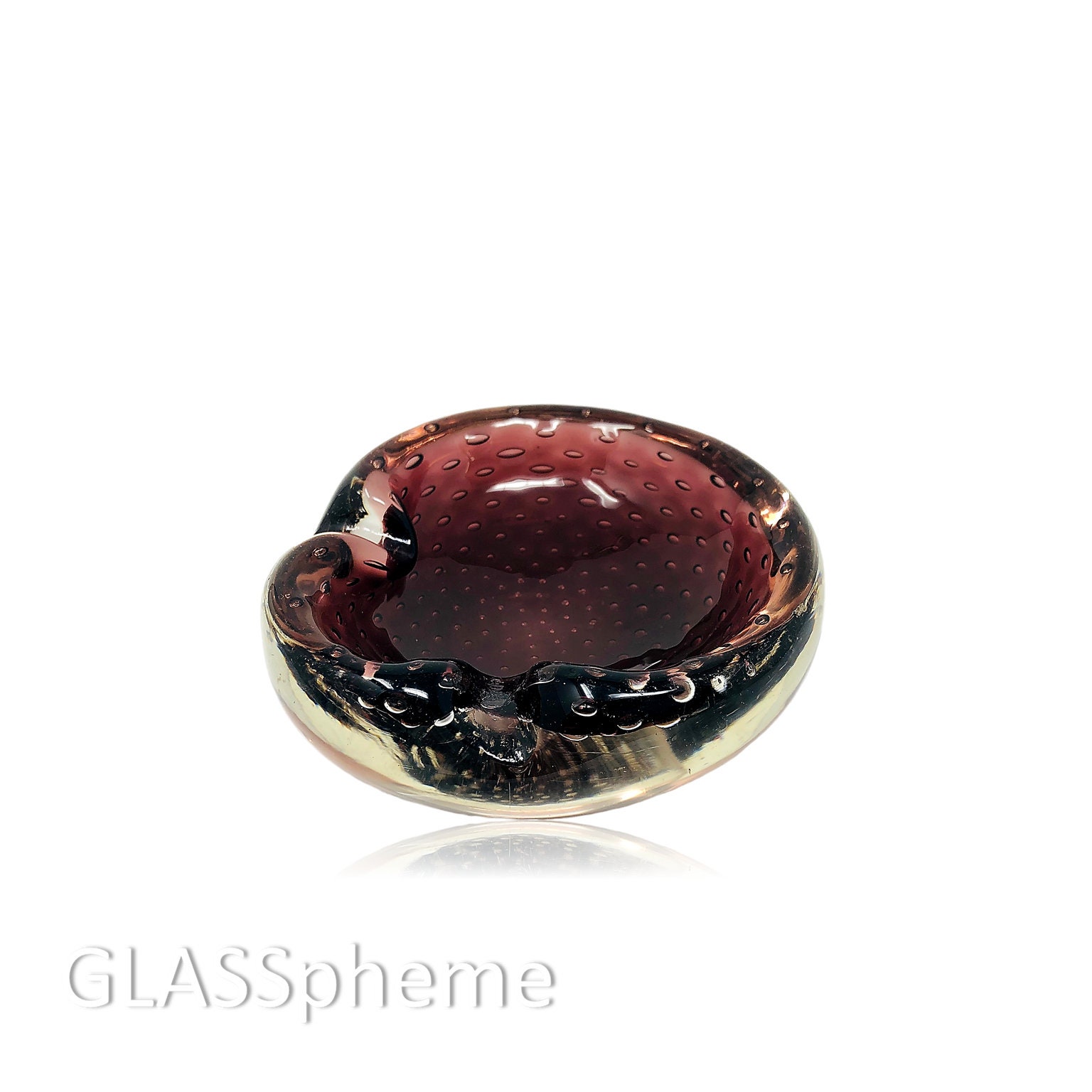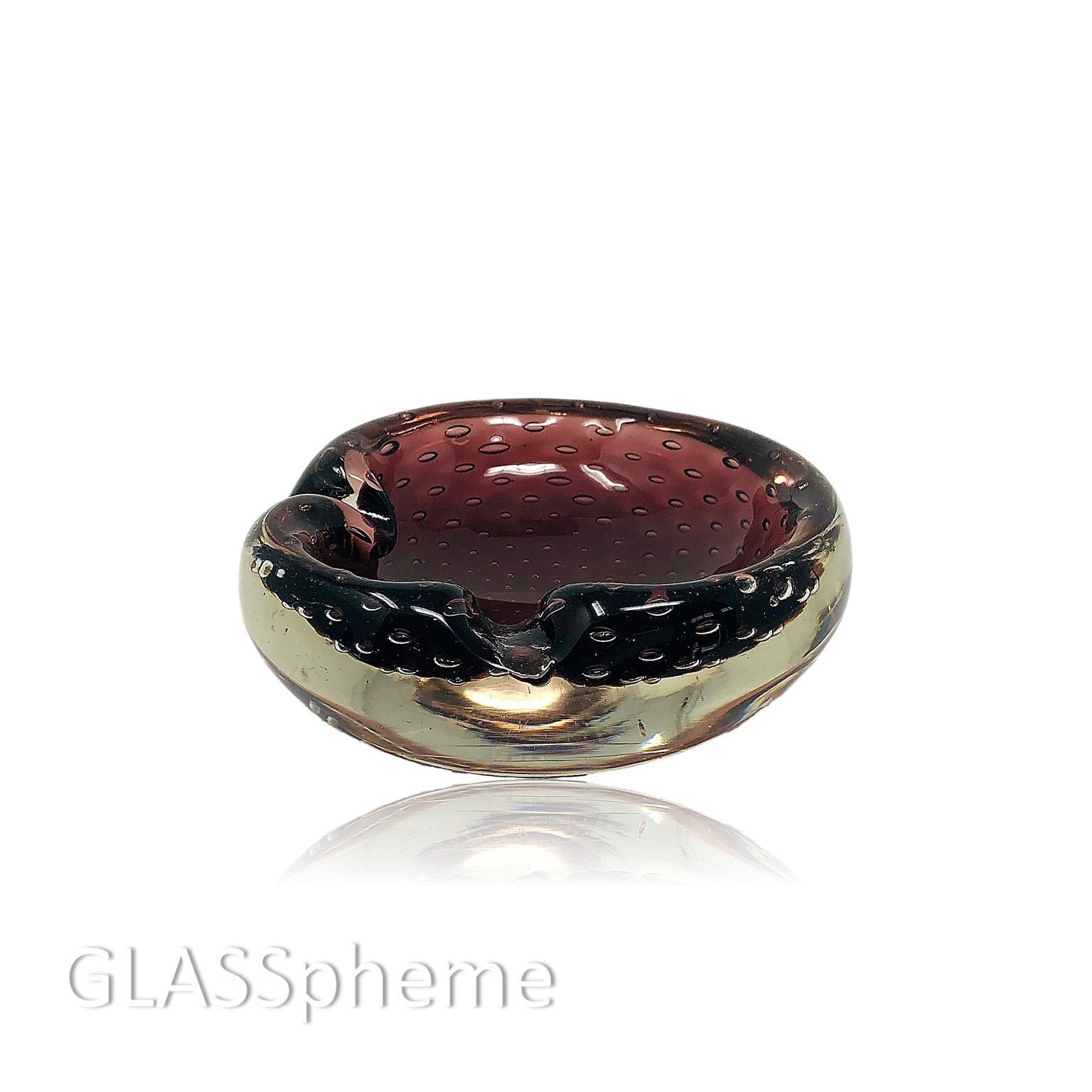 This brilliant mid-century Murano biomorphic bullicante (controlled bubbles) bowl or ashtray in a super dark purple is encased in crystal sommerso glass to a very cool effect! Although diminutive in size, this small beauty weighs over 1.5 lbs. This is a lovely minty-condition vintage piece that would make an awesome gift!