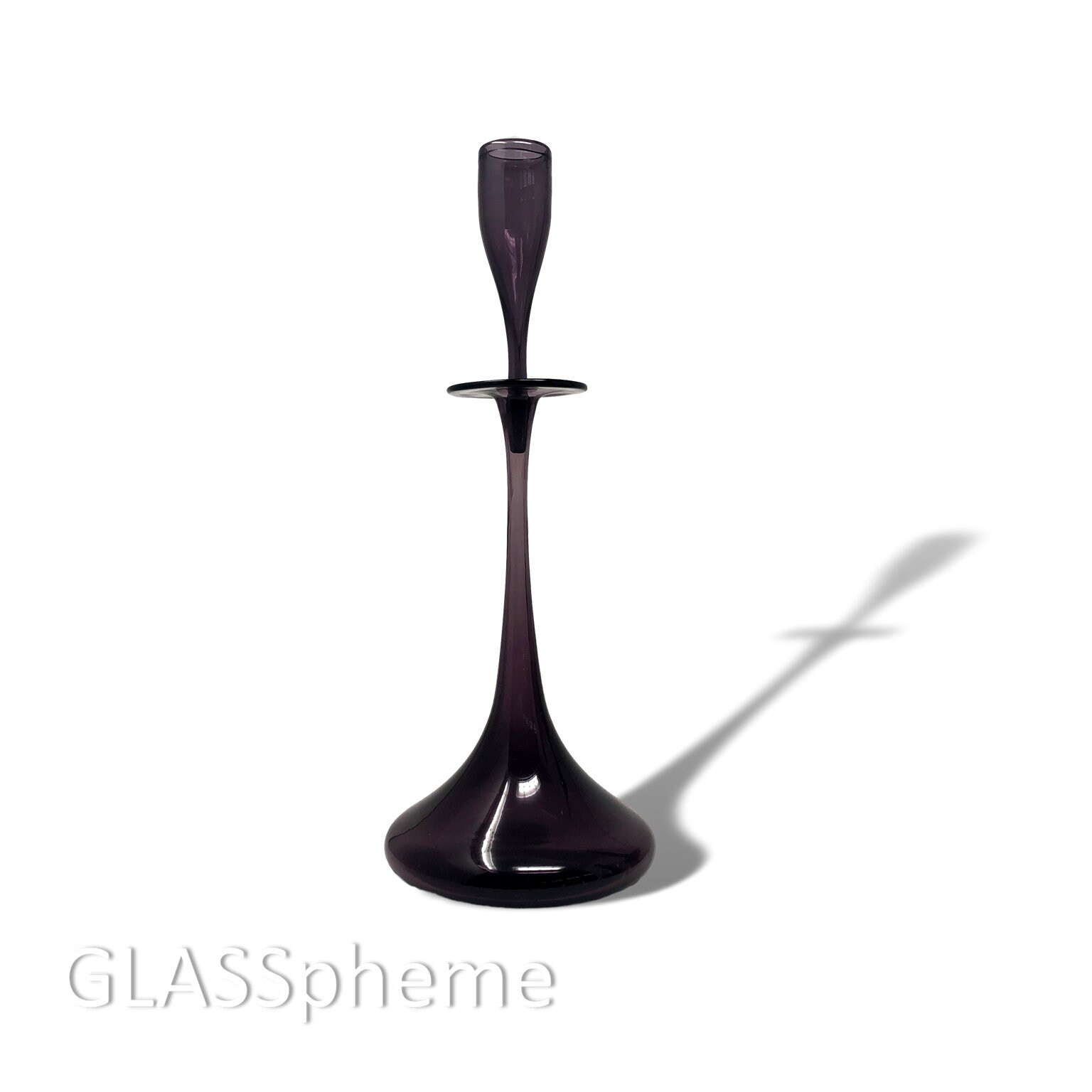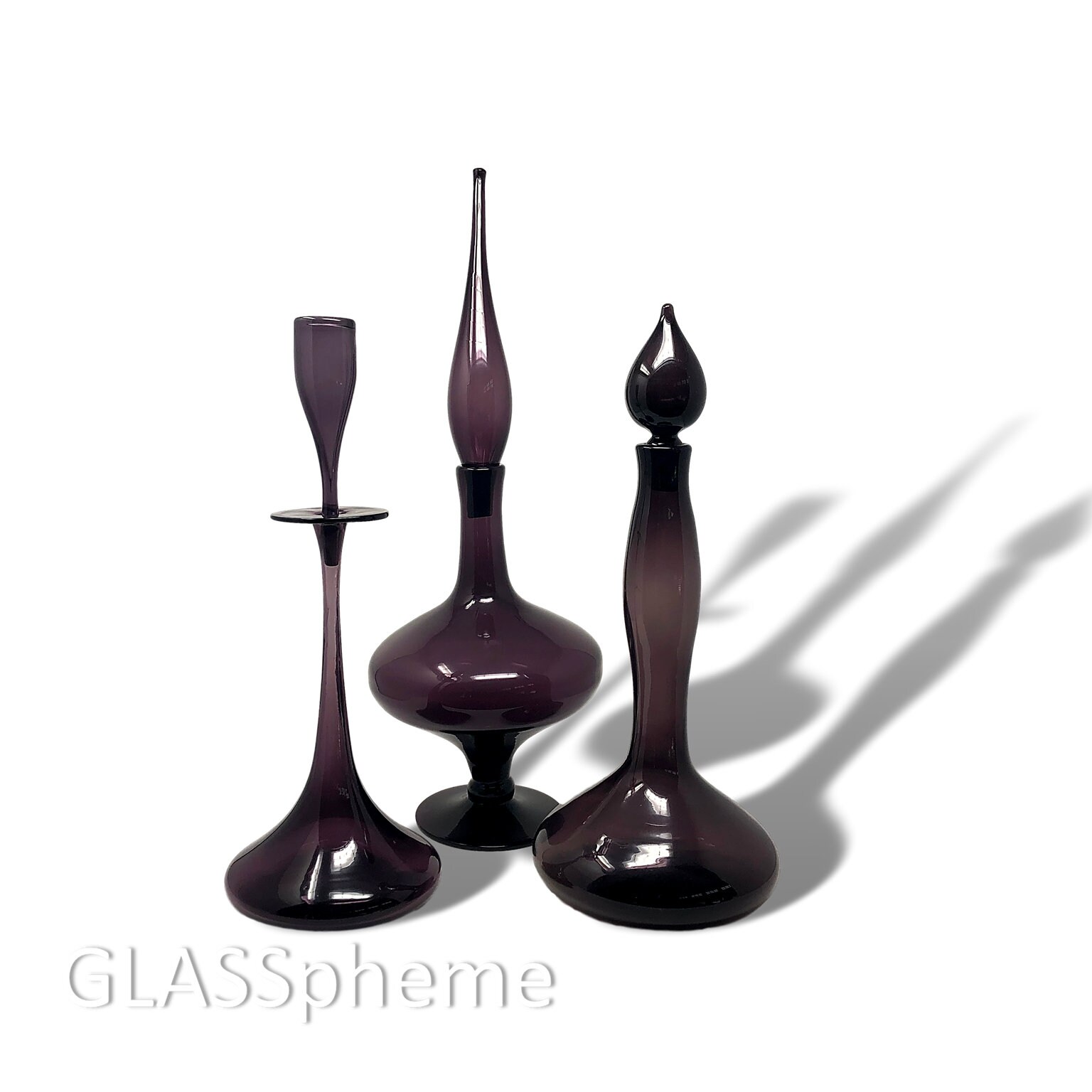 Blenko's super mid mod 1960 'shot glass' decanter, Blenko catalog #6027 by Wayne Husted, is one of Blenko's most iconic, beloved and highly coveted designs. As such, they were produced for most of the 1960s and Worthpoint documents over 100 that have changed hands over the last decade in online auctions. But guess how many of those 100+ decanters were in 1967-only PLUM (one of Blenko's most killer colors ever)? ONE. That's how rare this popular design is in PLUM! I've found exactly one in nearly 1.5 decades of collecting...