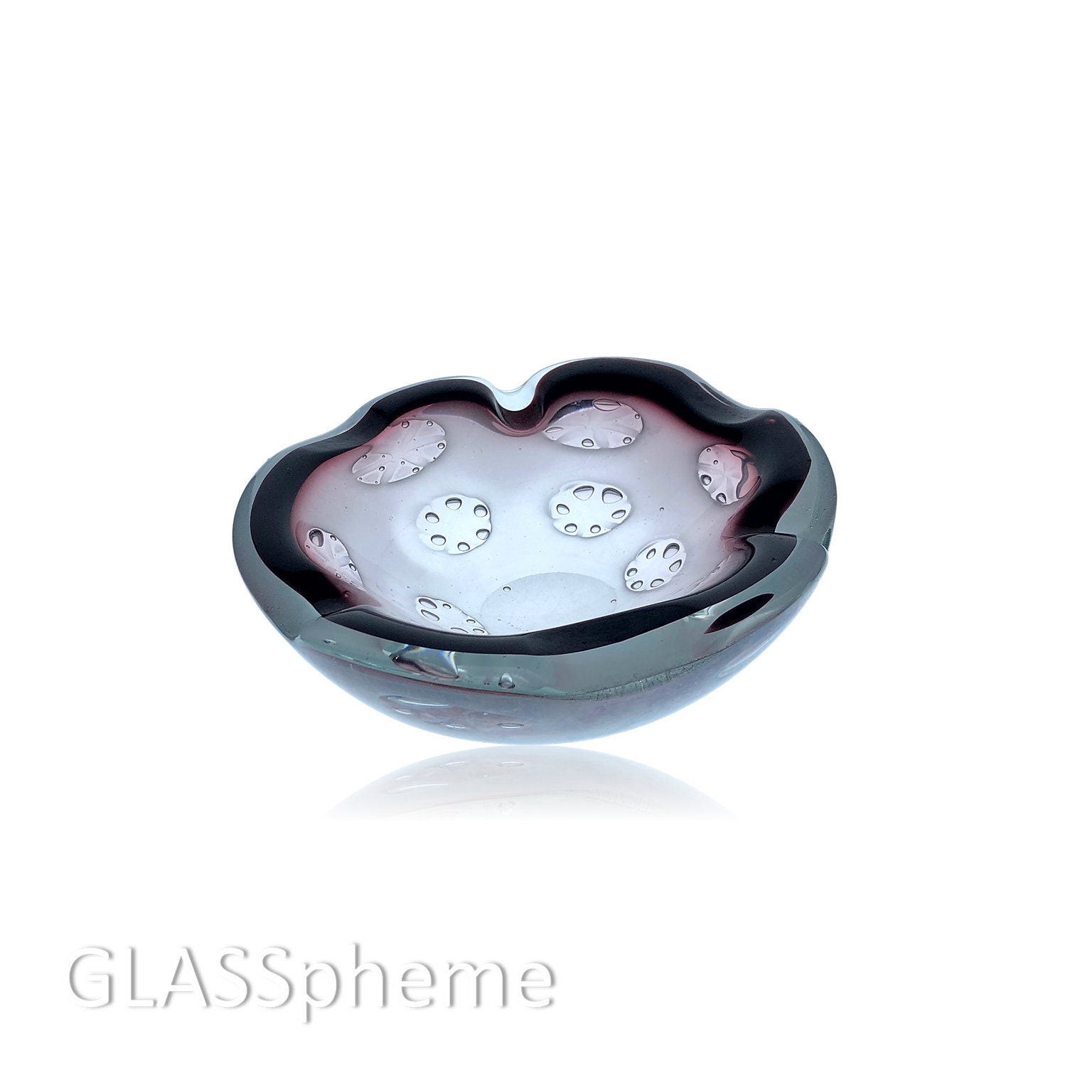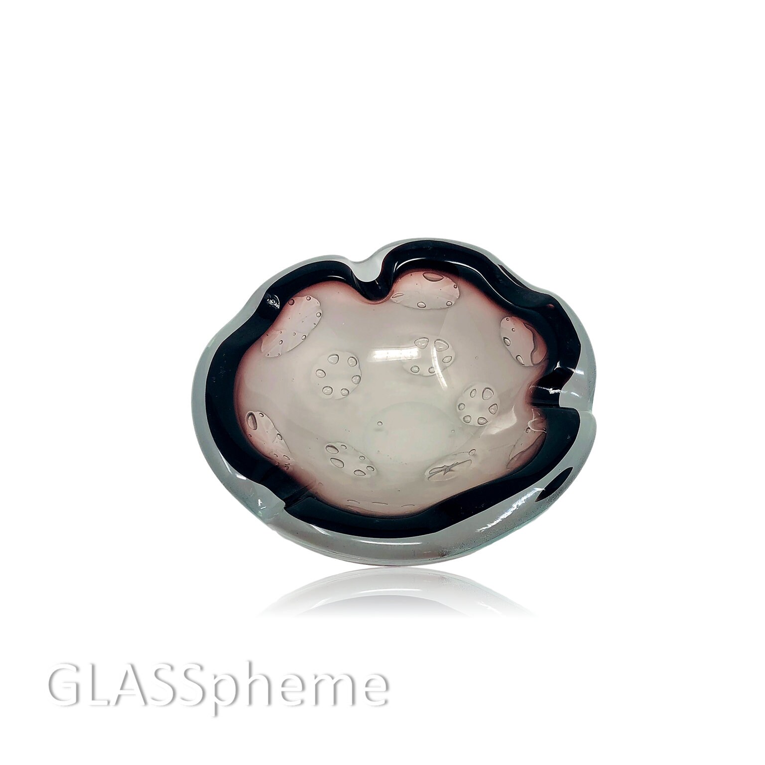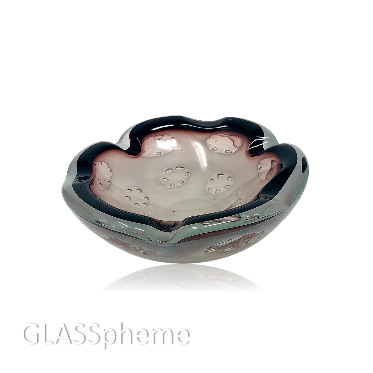 You're looking at a mystifyingly beautiful Murano glass bowl (or ashtray) by Barbini/VAMSA. From around 1936 to 1944, Alfredo Barbini was partner and master glassblower in Vetri Artistici Muranesi Società per Azioni [V.A.M.S.A.] and his work from that time is extremely rare and highly coveted. Alfredo Barbini is generally known for his extravagantly gorgeous designs and superb craftmanship, but based on the pieces available today, it seems that his VAMSA production was more uniformly focused on higher-end/more highly complex pieces. This magical bowl is a perfect example--you've probably never seen anything like it. The opaque cloudy wisps throughout the thick glass casing are in fact BUBBLES--gazillions of tiny ones that manifest as a froth (Puleogso), and they float around large flower-shaped bubbles that are decorated with bubbles of their own. The deep purple glass at the rim brings an amethyst hue to the entire piece. The photos done with backlighting show the contrast between elements and the features of the glass itself. The other photos were taken in studio light and more faithfully reflect how this amazing treasure will look on display (without backlighting).