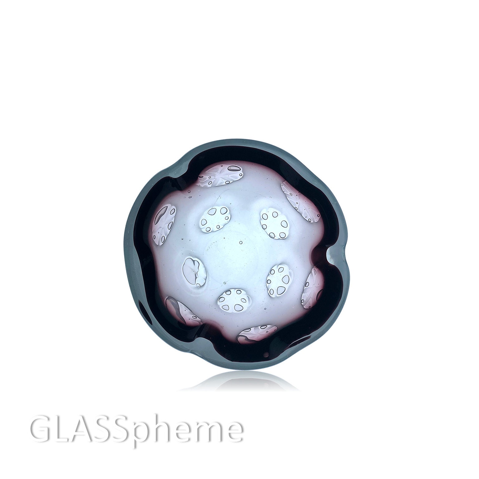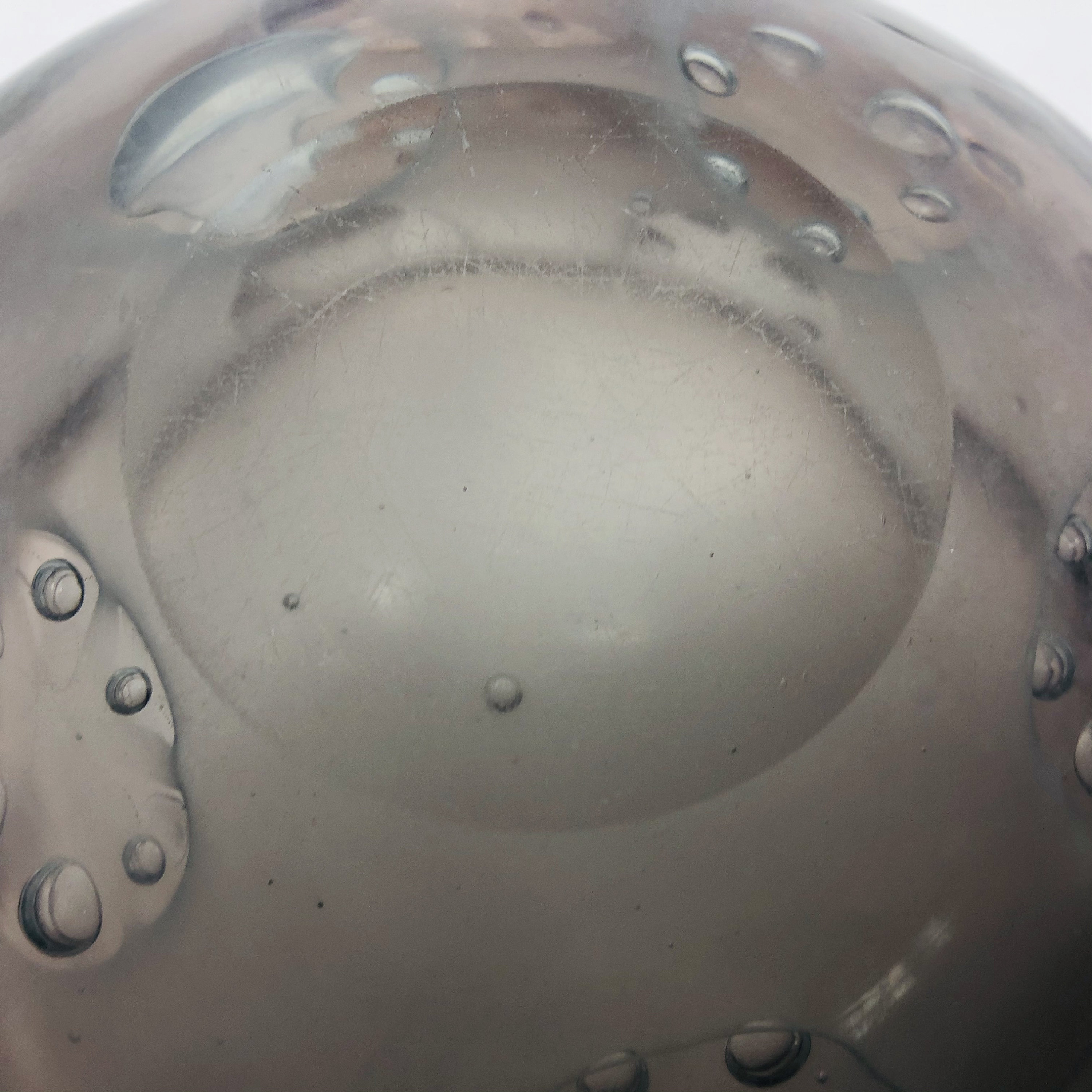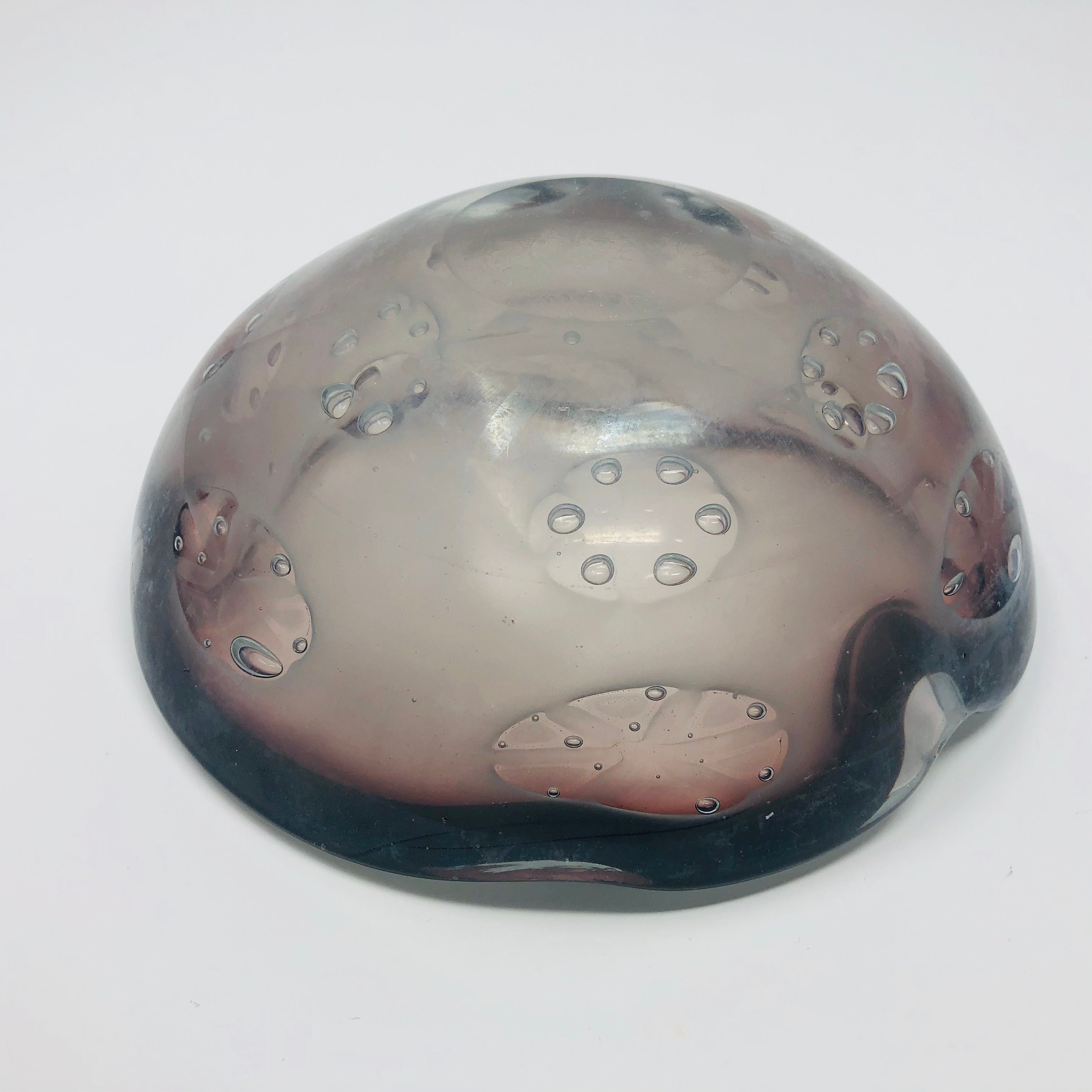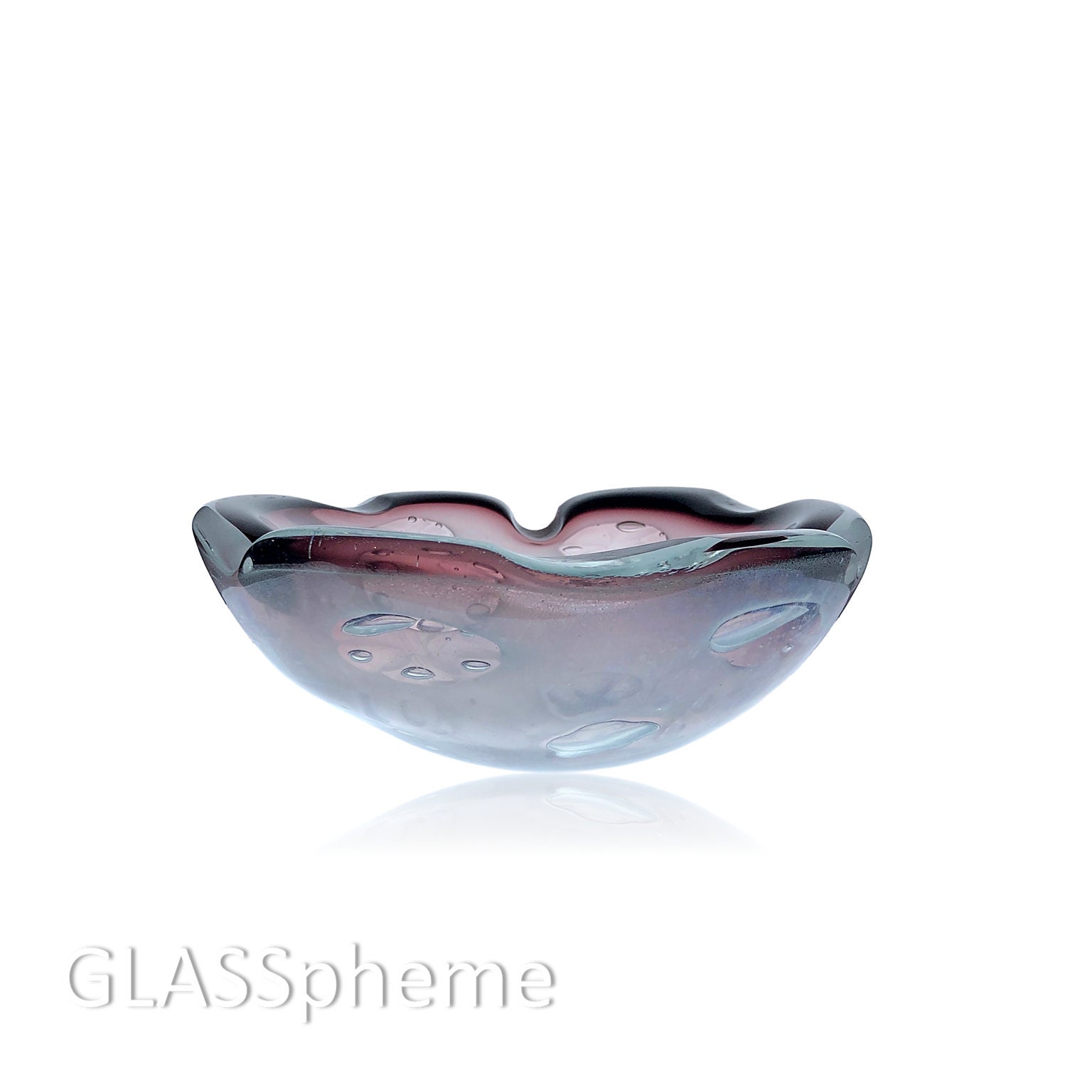 You're looking at a mystifyingly beautiful Murano glass bowl (or ashtray) by Barbini/VAMSA. From around 1936 to 1944, Alfredo Barbini was partner and master glassblower in Vetri Artistici Muranesi Società per Azioni [V.A.M.S.A.] and his work from that time is extremely rare and highly coveted. Alfredo Barbini is generally known for his extravagantly gorgeous designs and superb craftmanship, but based on the pieces available today, it seems that his VAMSA production was more uniformly focused on higher-end/more highly complex pieces. This magical bowl is a perfect example--you've probably never seen anything like it. The opaque cloudy wisps throughout the thick glass casing are in fact BUBBLES--gazillions of tiny ones that manifest as a froth (Puleogso), and they float around large flower-shaped bubbles that are decorated with bubbles of their own. The deep purple glass at the rim brings an amethyst hue to the entire piece. The photos done with backlighting show the contrast between elements and the features of the glass itself. The other photos were taken in studio light and more faithfully reflect how this amazing treasure will look on display (without backlighting).
