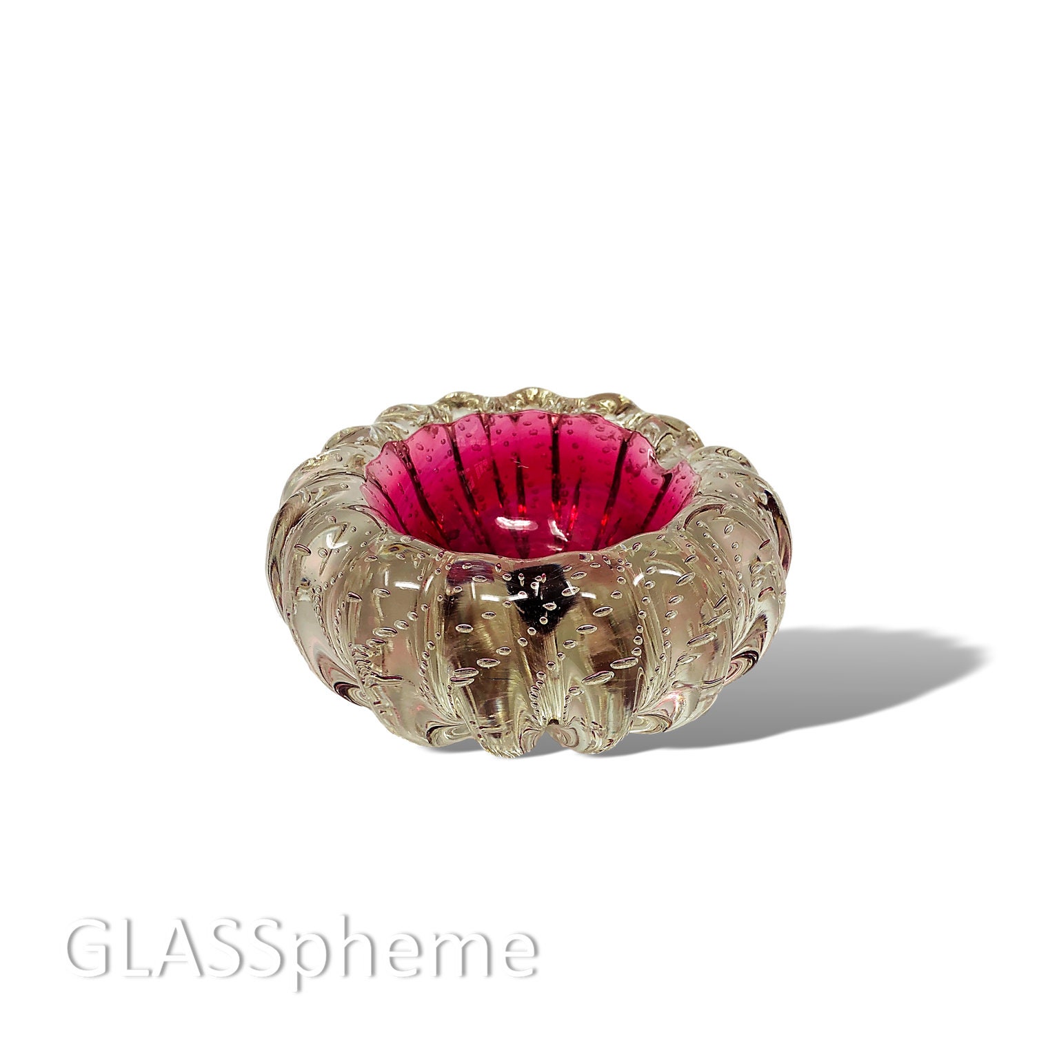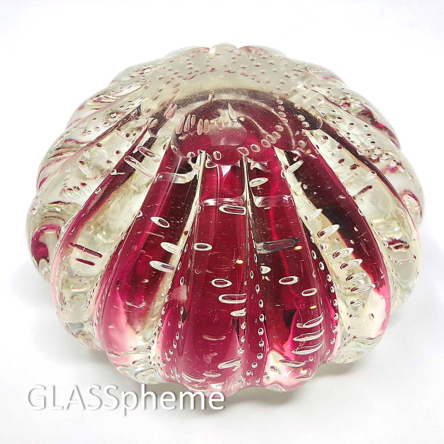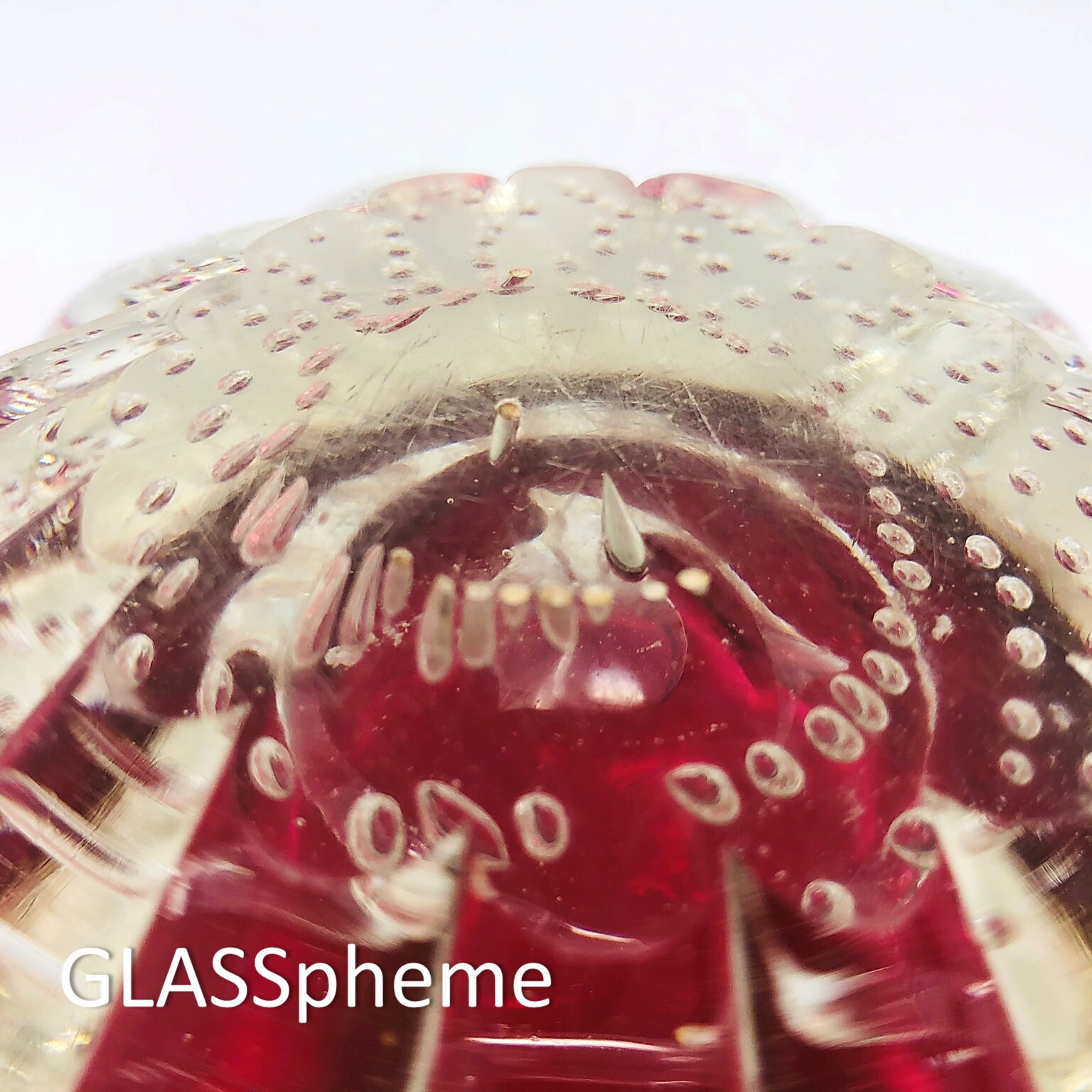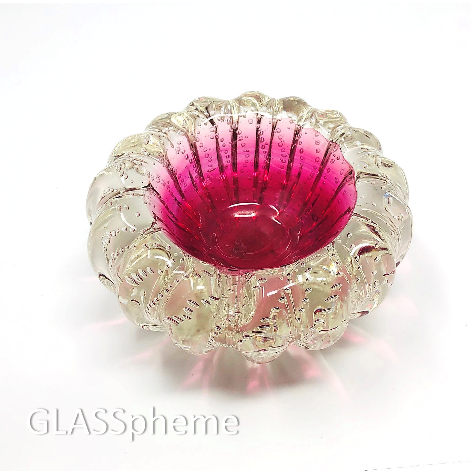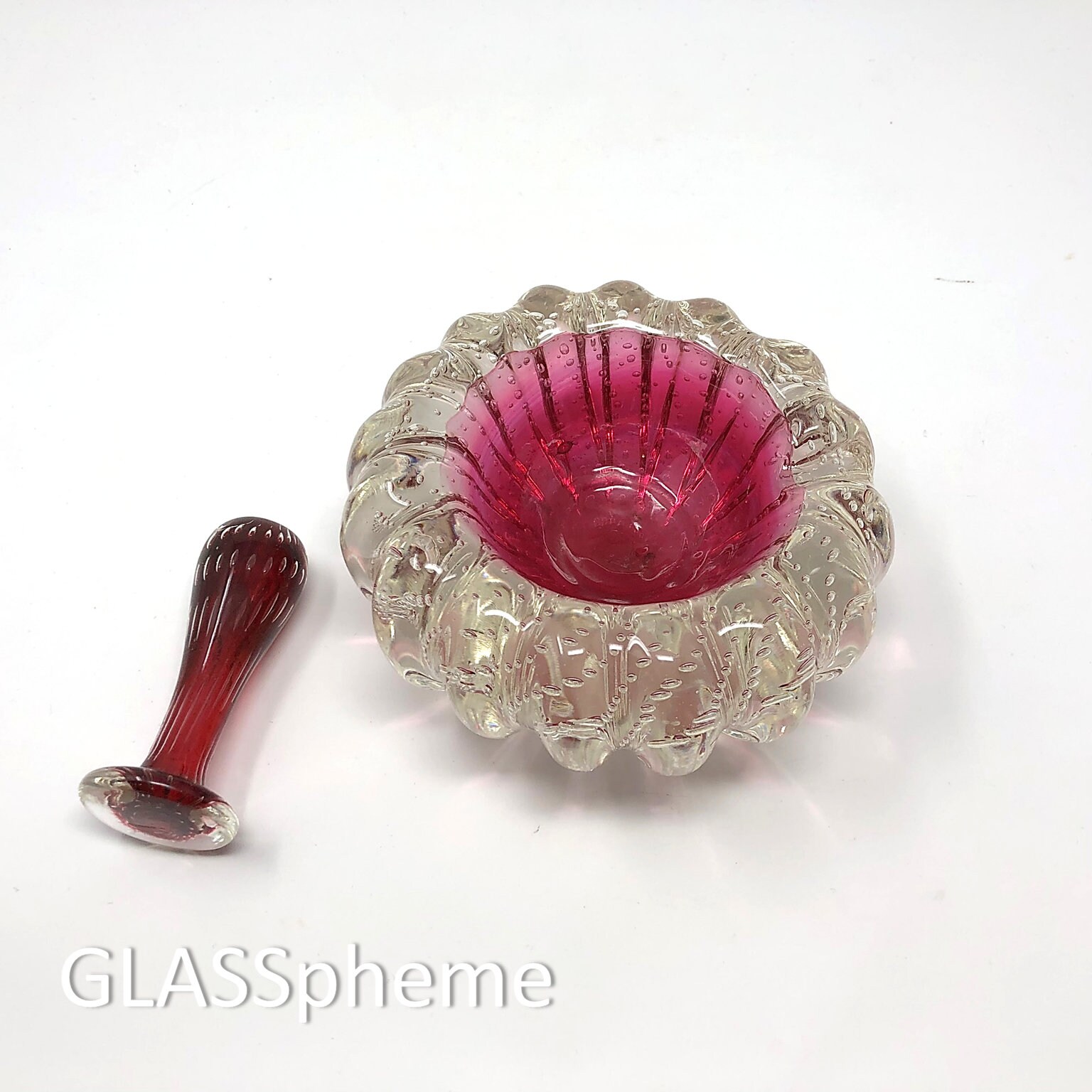 You're looking at a ridiculously spectacular mid-century Murano crystal and hot pink/cranberry glass bowl (or ashtray or trinket dish) with matching pestle, probably made by Archimede Seguso. Look closely at the magic that is this piece! Imagine a thick ribbed sparkling crystal glass bowl with diagnonal lines of bubbles cascading down the sides (adding even more sparkle) and then a BRIGHT PINK layer of transparent glass in the bowl area itself. This pristine jewel of a bowl would make an incredible stocking stuffer!