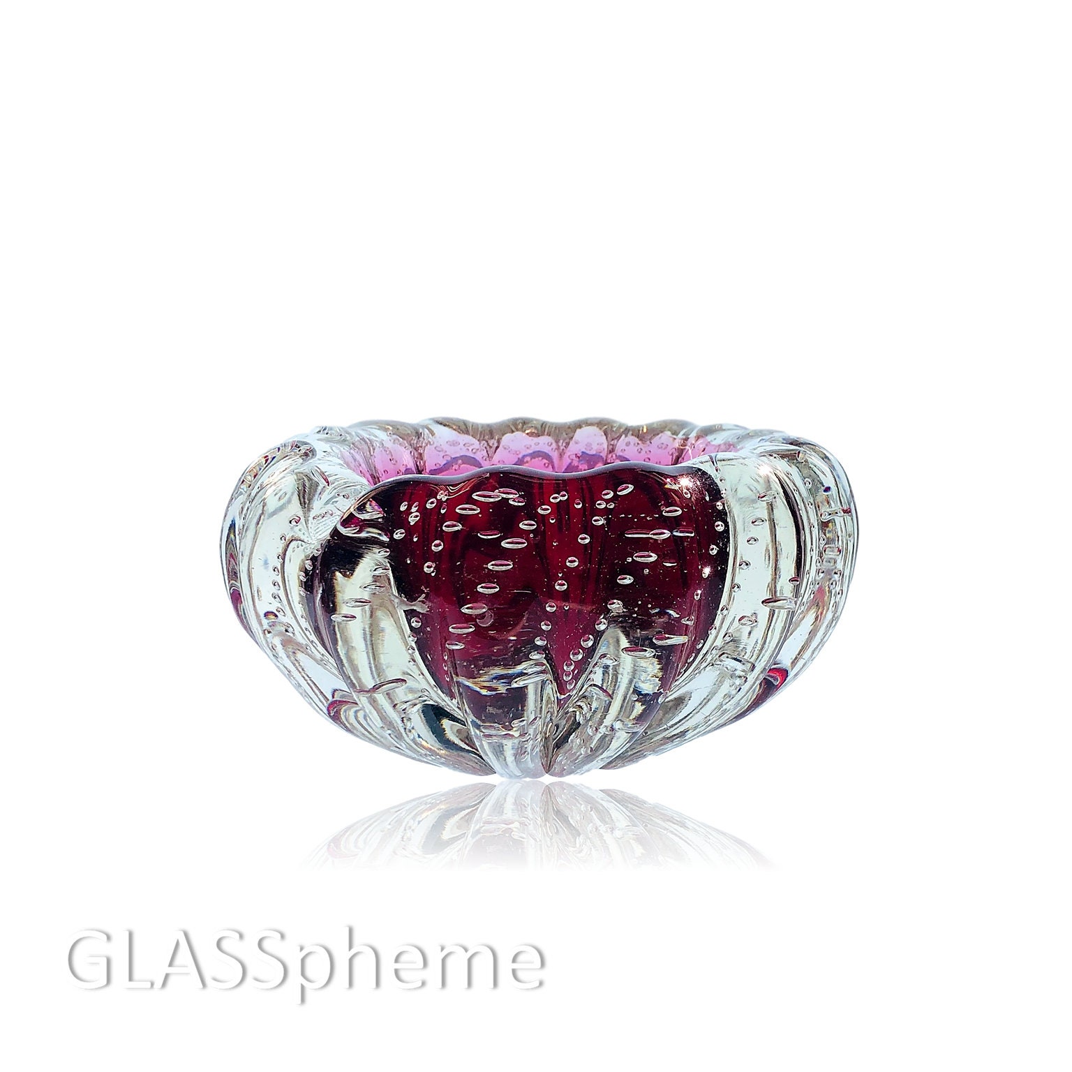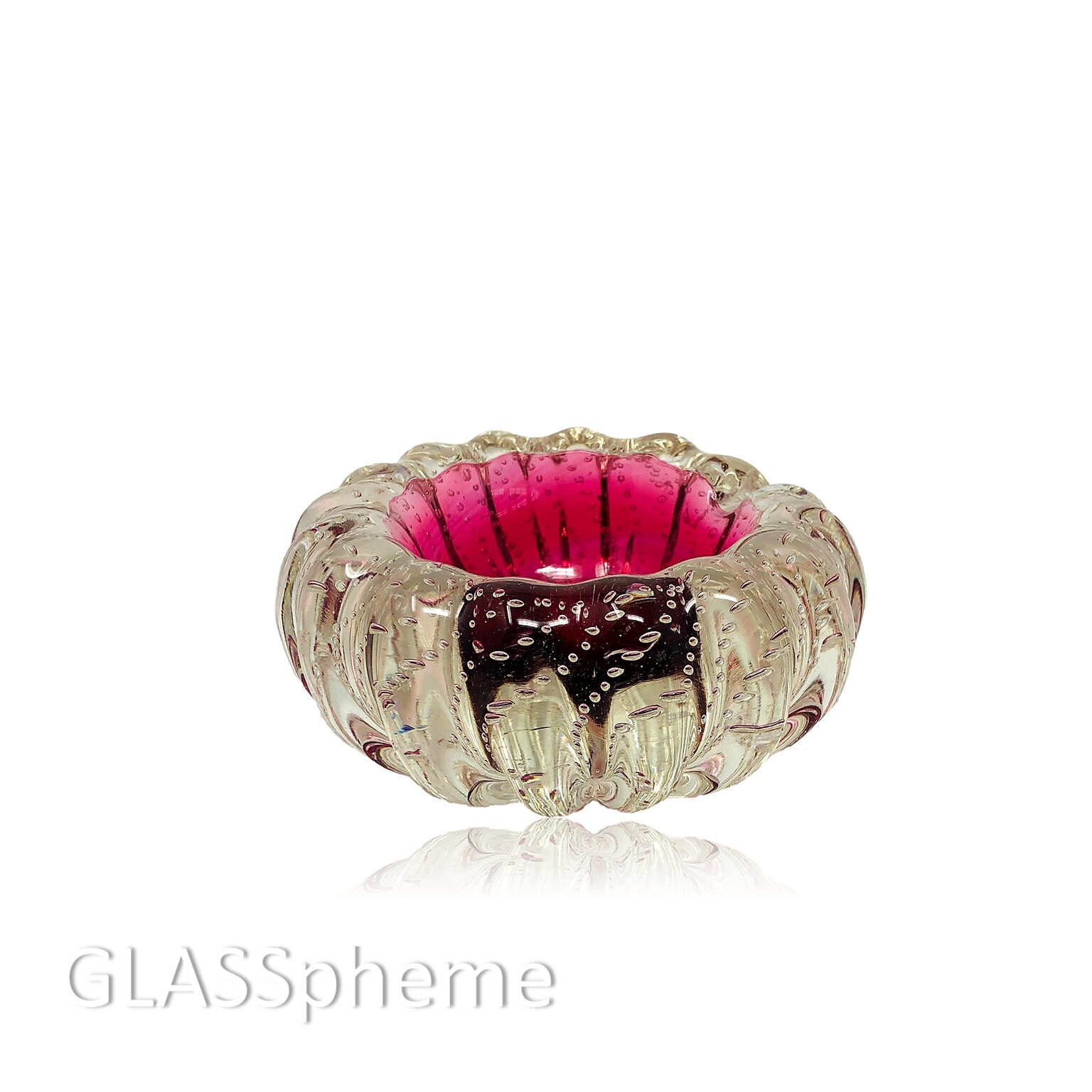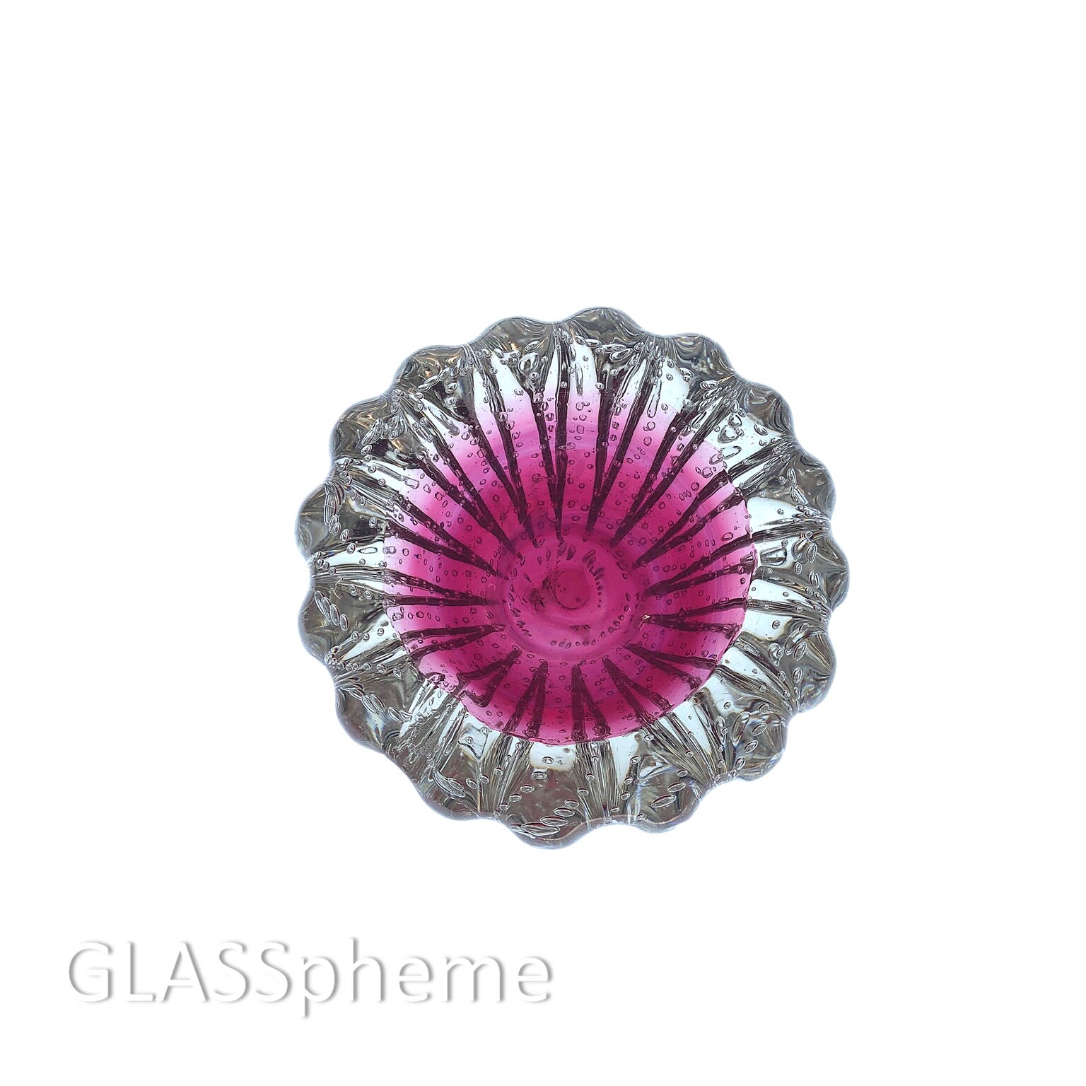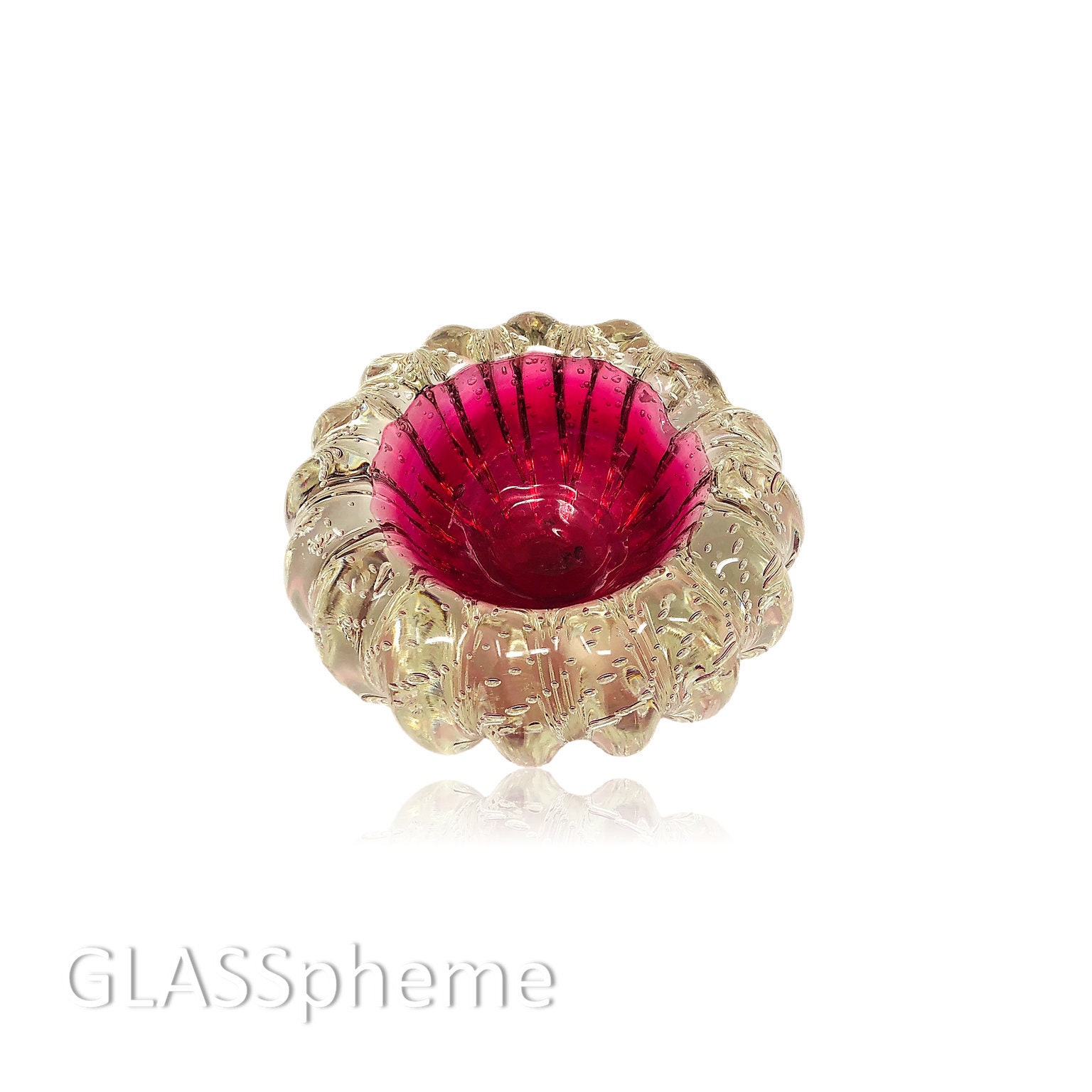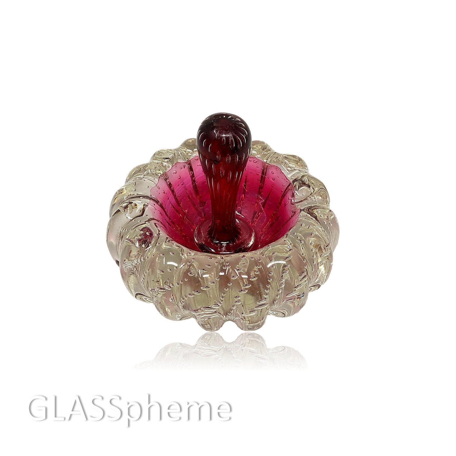 You're looking at a ridiculously spectacular mid-century Murano crystal and hot pink/cranberry glass bowl (or ashtray or trinket dish) with matching pestle, probably made by Archimede Seguso. Look closely at the magic that is this piece! Imagine a thick ribbed sparkling crystal glass bowl with diagnonal lines of bubbles cascading down the sides (adding even more sparkle) and then a BRIGHT PINK layer of transparent glass in the bowl area itself. This pristine jewel of a bowl would make an incredible stocking stuffer!