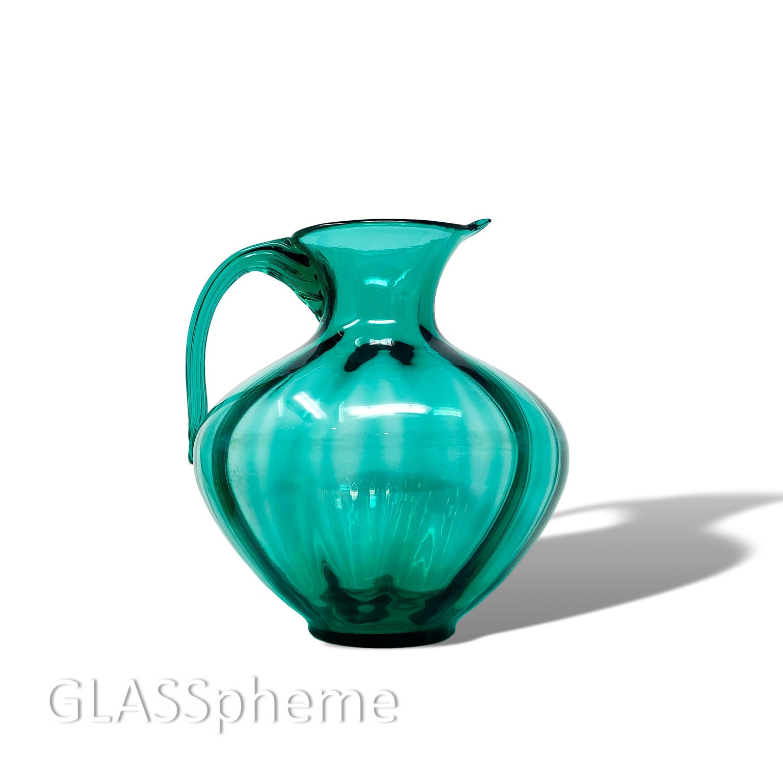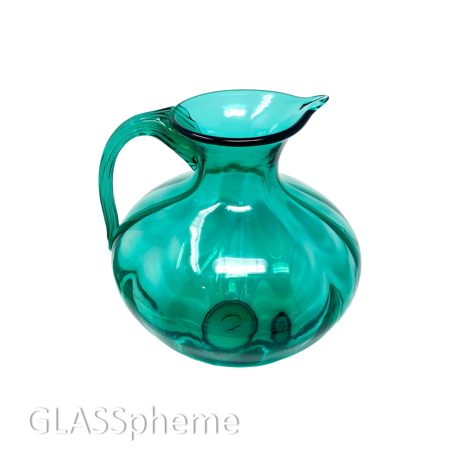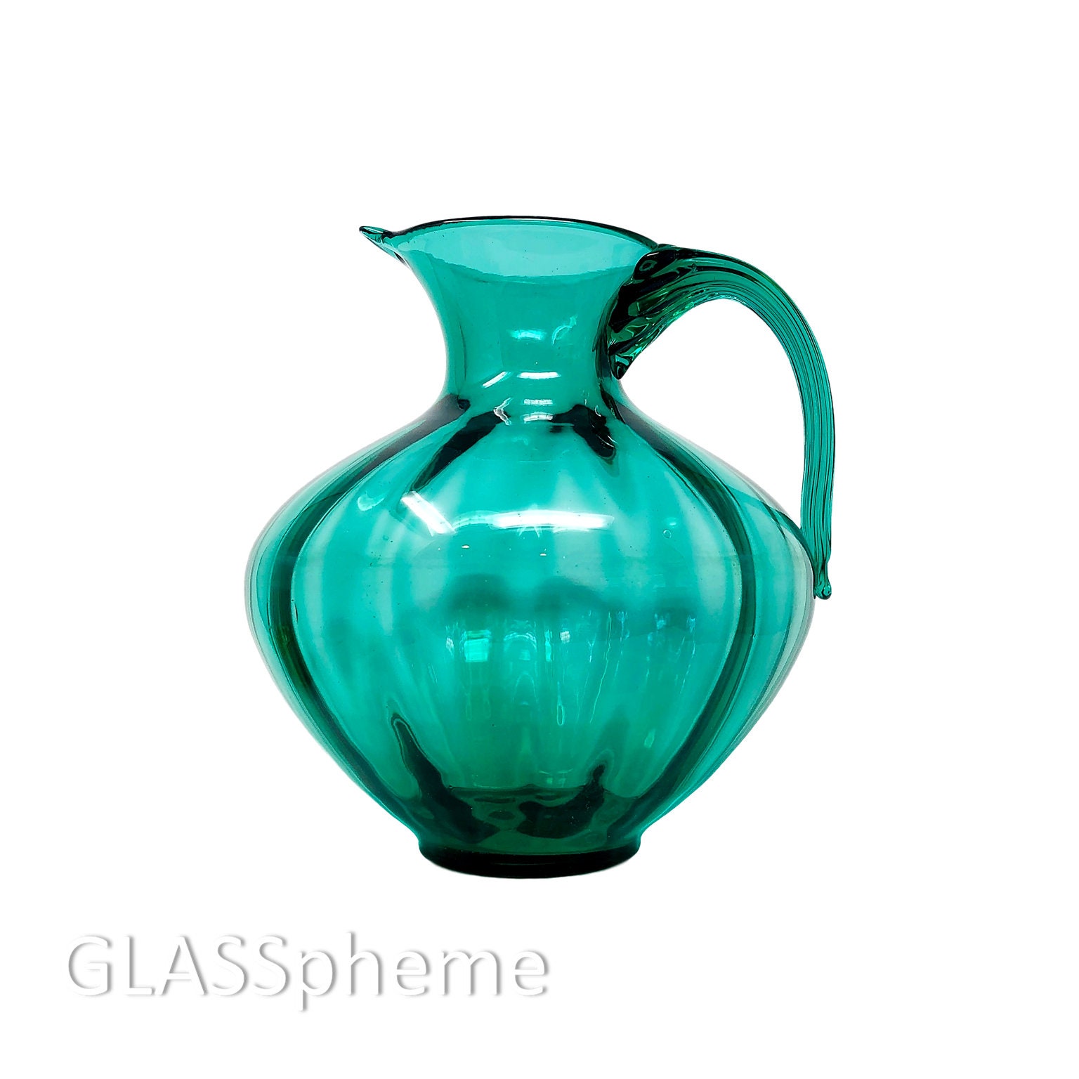 Make room for the mother of all Blenko pitchers--the massive 14" x 12" highly coveted #963 optic glass pitcher designed by Winslow Anderson and produced from about 1953 through 1957. Ours, in sea green, is a bright sparkling beauty albeit with a couple of large bubbles and a water ring around the inside of the pitcher midway through. (You'll have to look closely for it in the photos as the blinding optics obscure it easily.) Not all of these massive pieces have survived over the years given their size, heft, and difficulty shipping properly. My obsession with this massive glass miracle has led to much disappointment as at least HALF of the ones I managed to get my hands on over the years arrived in in shards! Of course, you'll receive this one in perfect condition as I'm a packaging whiz--but give me an extra day or two to hunt down a big enough box.