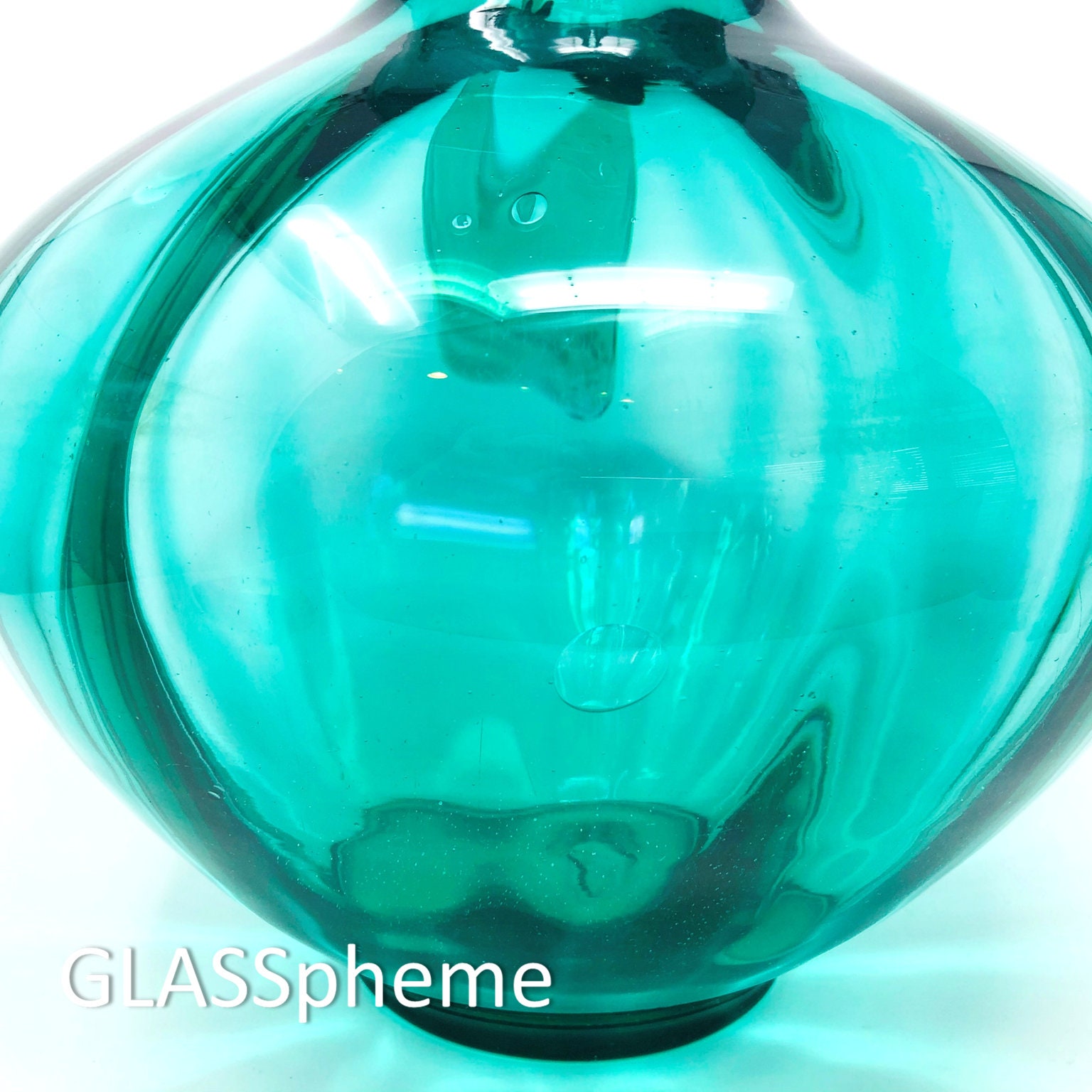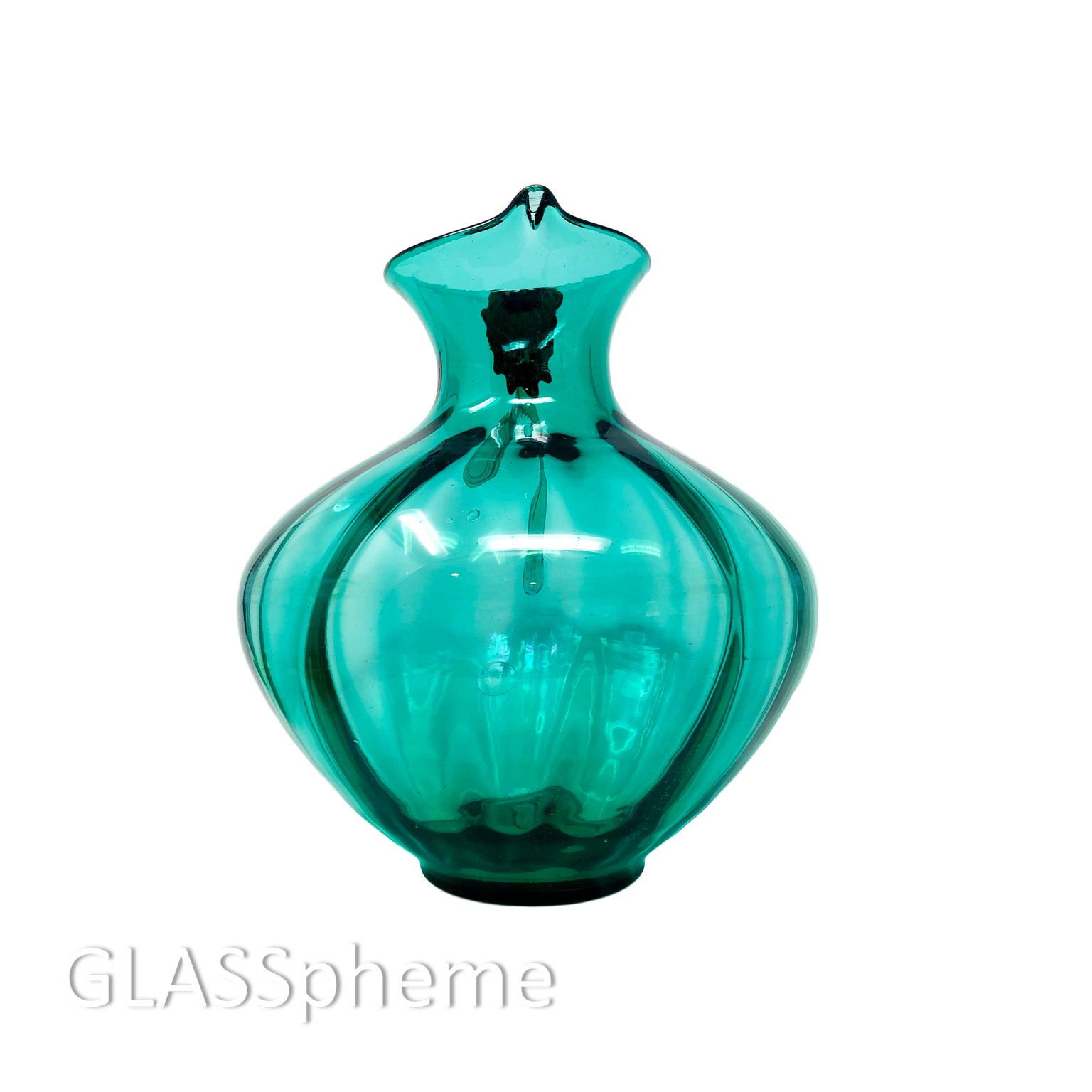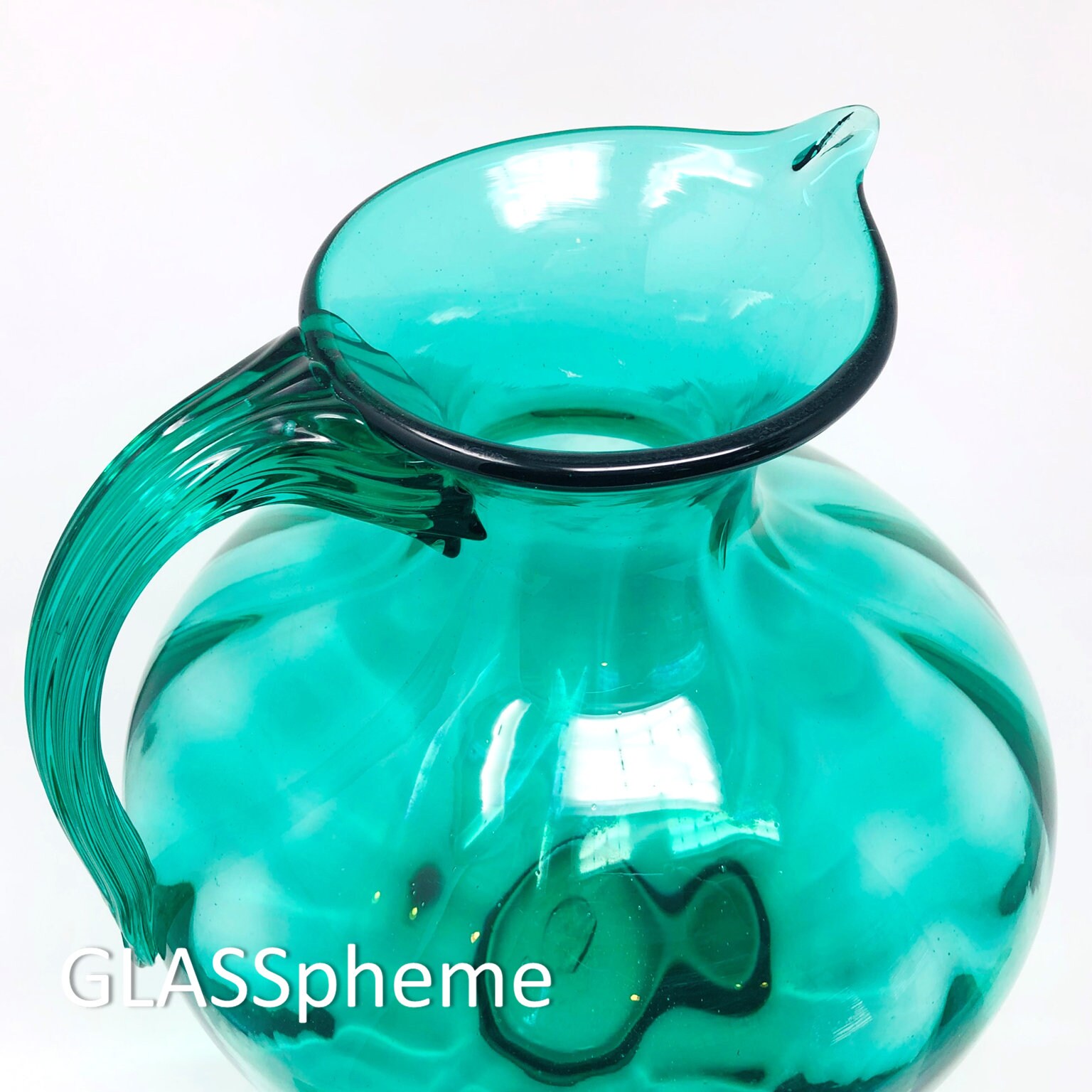 Make room for the mother of all Blenko pitchers--the massive 14" x 12" highly coveted #963 optic glass pitcher designed by Winslow Anderson and produced from about 1953 through 1957. Ours, in sea green, is a bright sparkling beauty albeit with a couple of large bubbles and a water ring around the inside of the pitcher midway through. (You'll have to look closely for it in the photos as the blinding optics obscure it easily.) Not all of these massive pieces have survived over the years given their size, heft, and difficulty shipping properly. My obsession with this massive glass miracle has led to much disappointment as at least HALF of the ones I managed to get my hands on over the years arrived in in shards! Of course, you'll receive this one in perfect condition as I'm a packaging whiz--but give me an extra day or two to hunt down a big enough box.