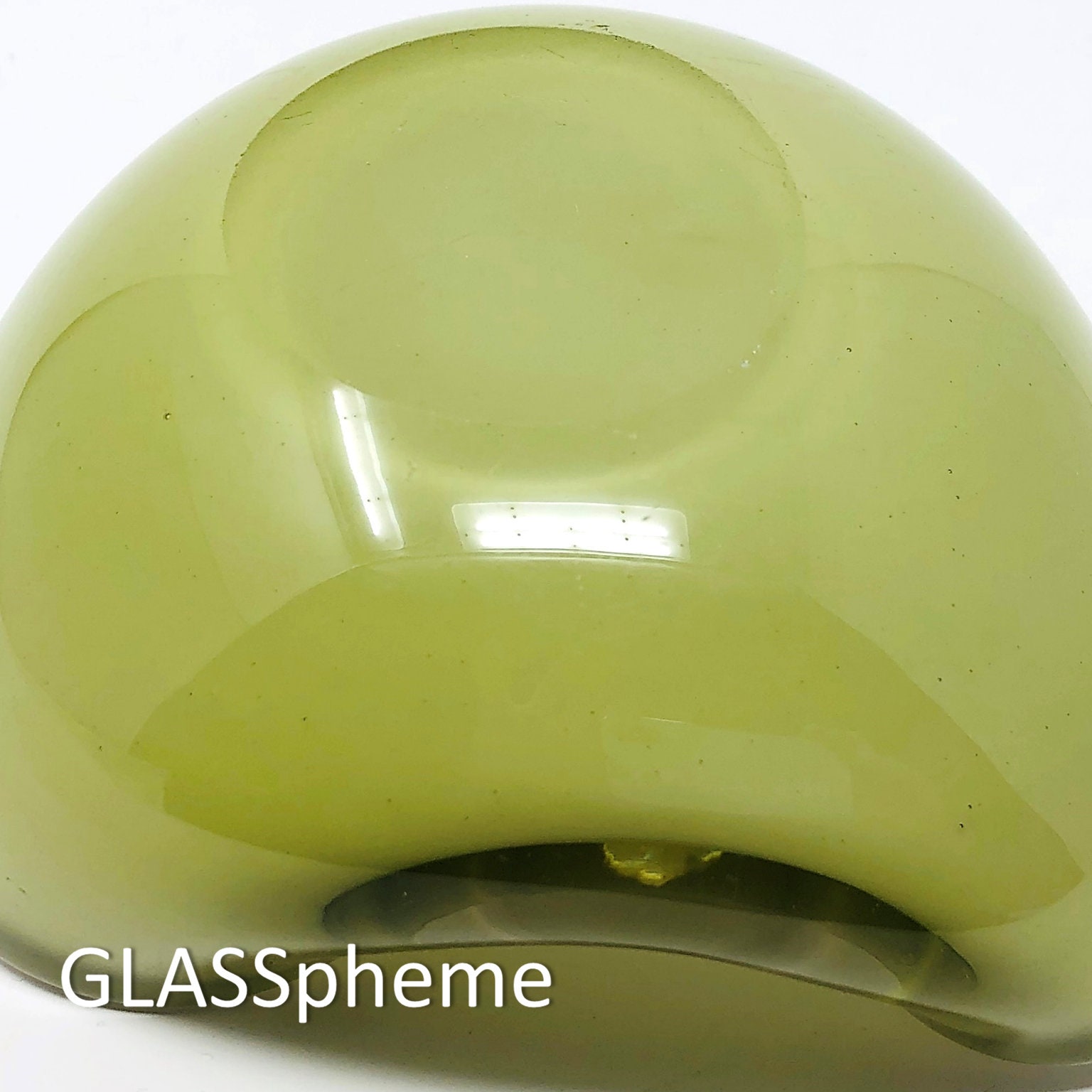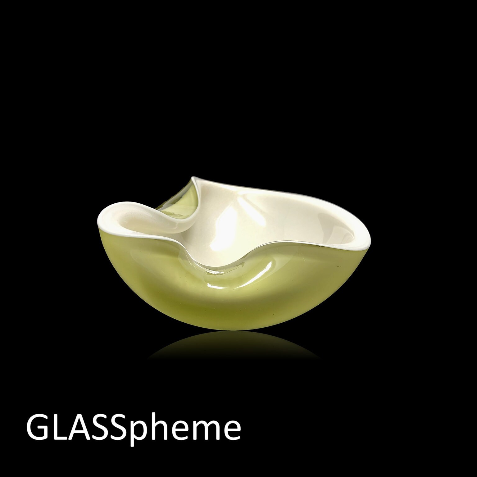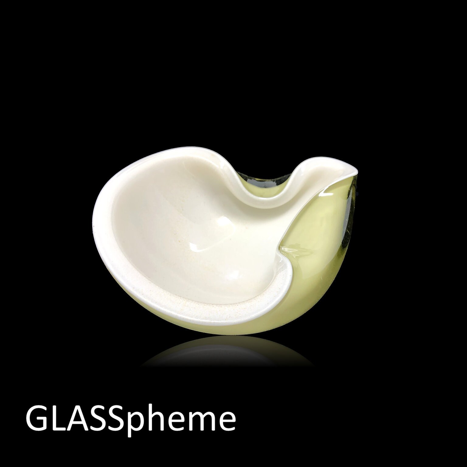 You're looking at an exquisitely formed mid-century Murano bowl | ashtray | trinket dish most likely by Alfredo Barbini for Weil Ceramics & Glass given nearly identical labeled pieces I've seen. Done with a bright white lattimo glass base encased in a pale gold/green transparent glass, this beauty's interior seems to be cream colored from a distance, but you'll want to get close or you'll miss the heavenly mist of gold aventurine that makes this piece glitter. This precious C.1950s Murano glass wonder would make an awesome gift!