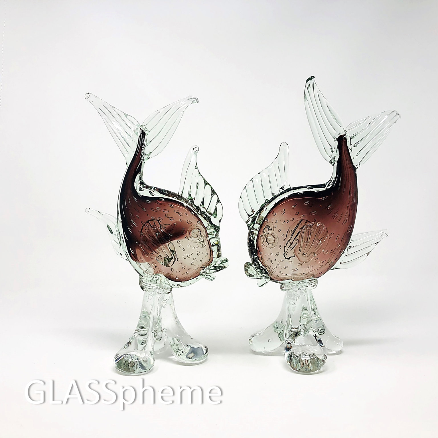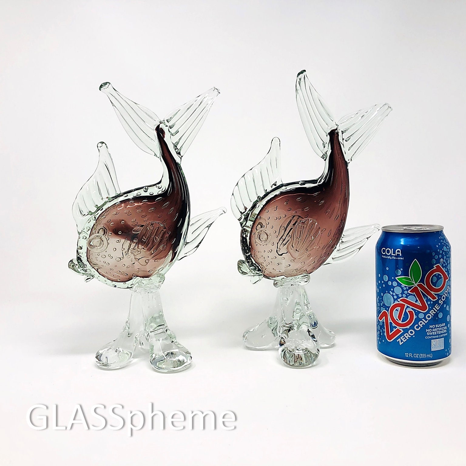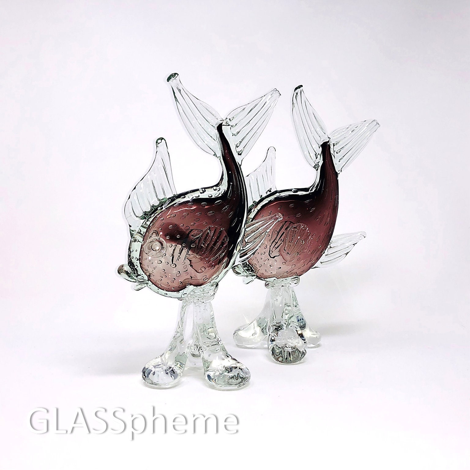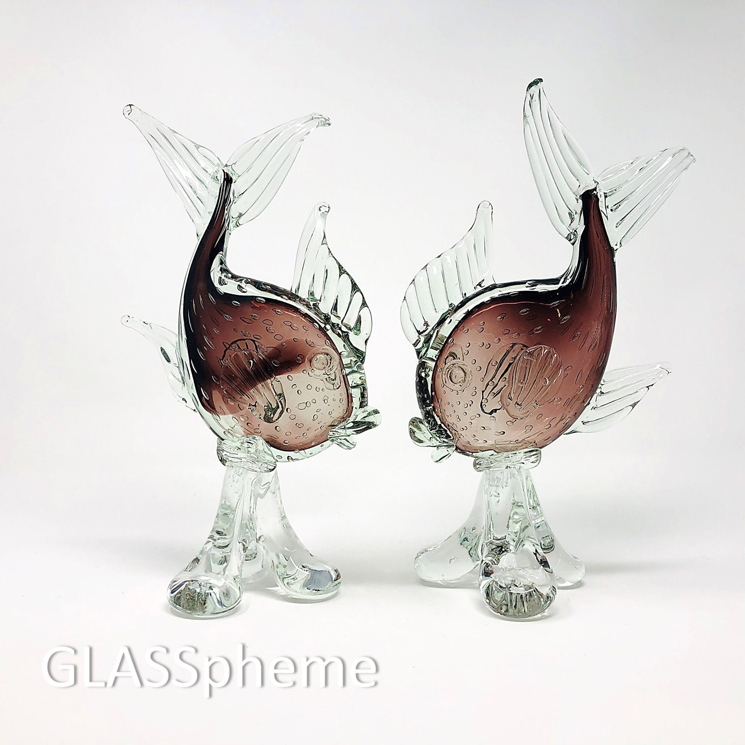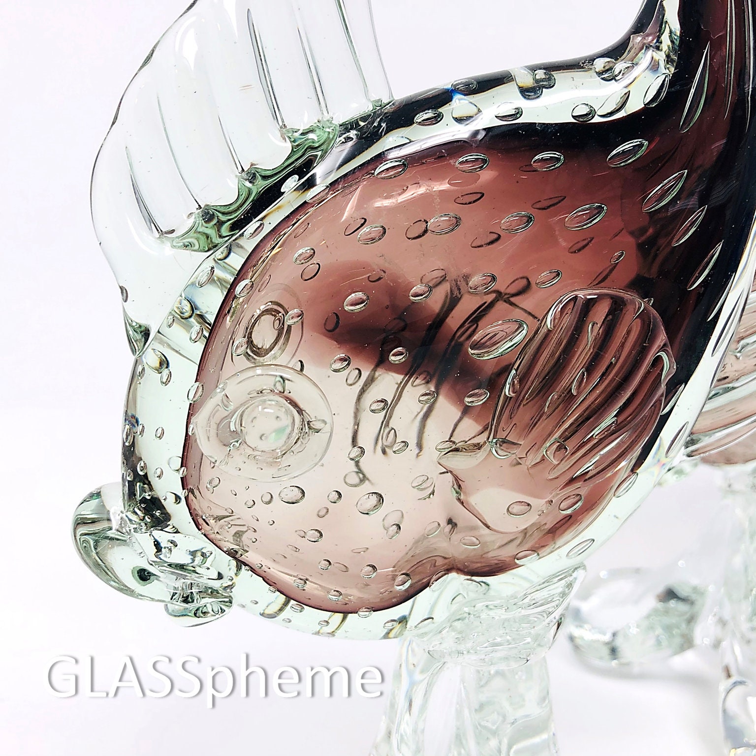 You're looking at a gorgeous pair of mid-century Murano glass fish sculptures by AVEM: No labels, but the three-legged base has been well documented as AVEM production (take a look at the Murano Zoo). With the stands and tail, fins, eyes, etc. done in a thick clear crystal and the fish body done in a deep purple body that gradually lightens (sfumato), this funky mid-century set is just the coolest.