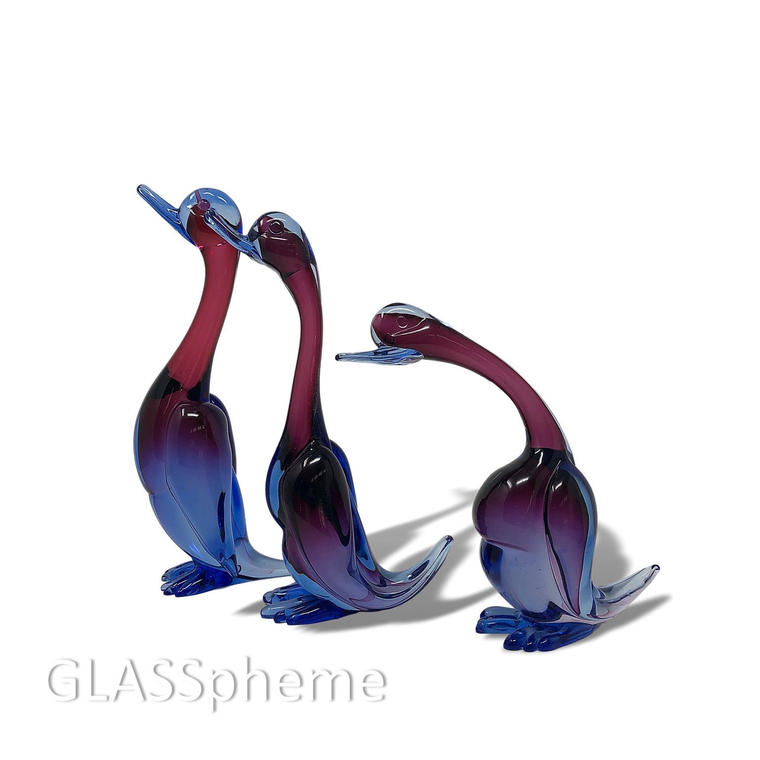 Feast your eyes on these perfect purple, pink and blue mid-century Murano ducks, probably by Archimede Seguso*. Notice how the colors on the body meld perfectly into one another in a seamless blur? That's one sure way to tell true Murano craftsmanship from the hordes of China-made imitations that comprise the MAJORITY of Murano glass sold on eBay. (Search "Murano birds" on alibaba.com and you'll quickly see how China-based glassblowers haven't come close--yet.) This gorgeous flock features three different variations and are 11", 10" and 8" tall, respectively. These amazing creatures, minty and near-pristine, won't last!