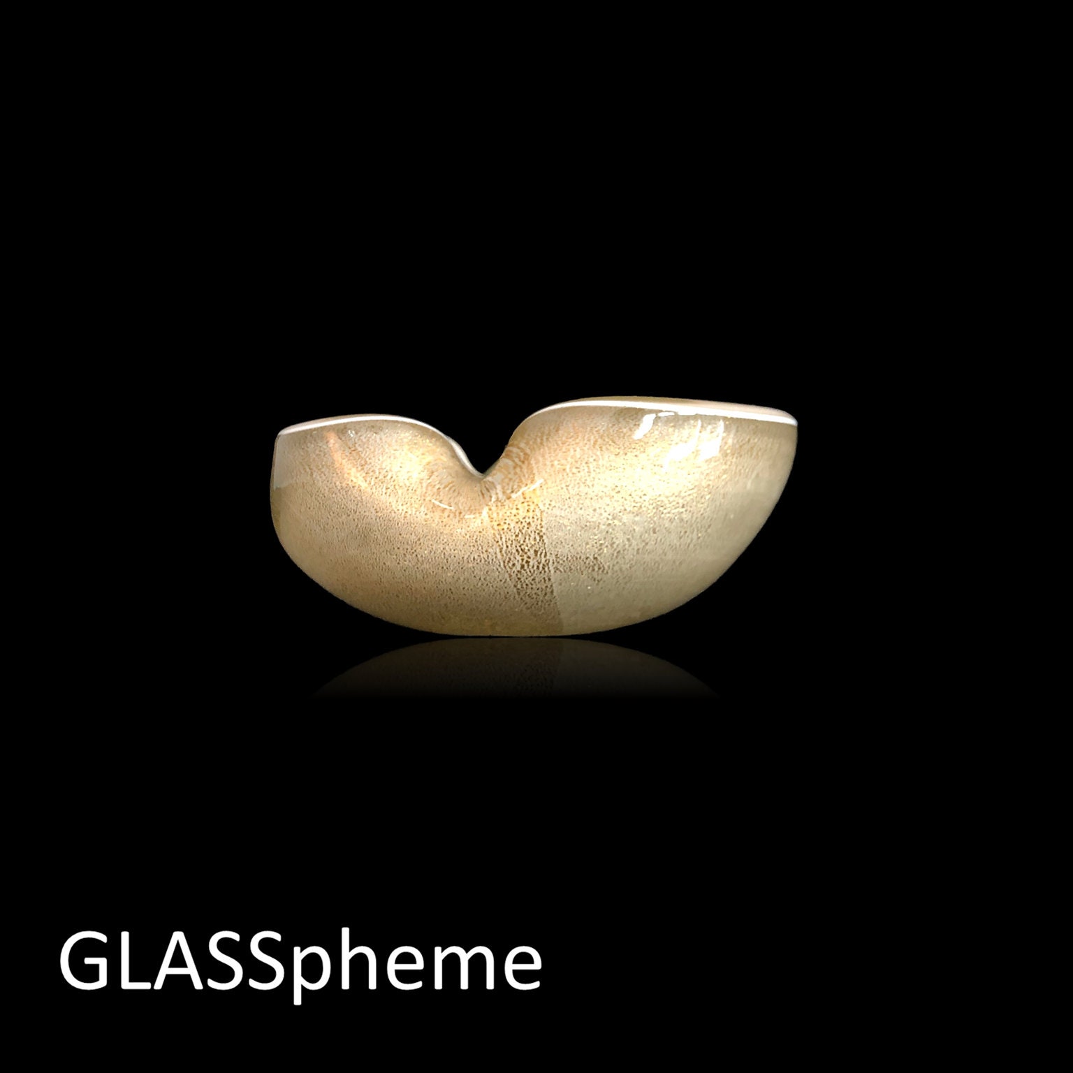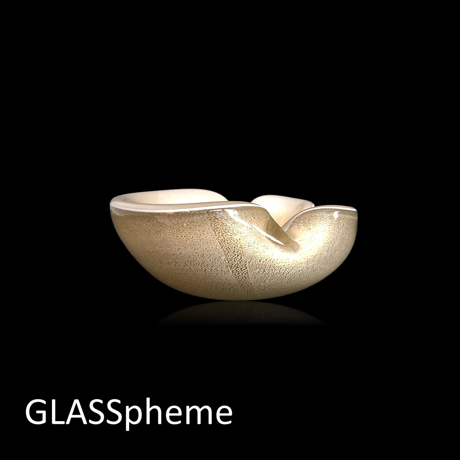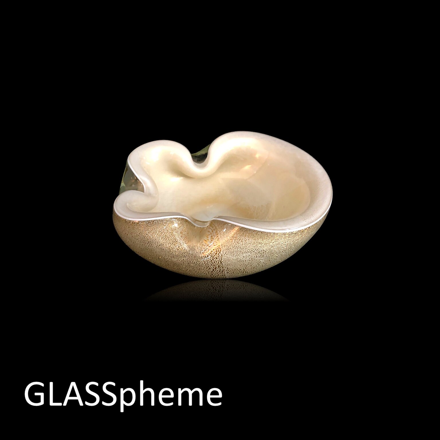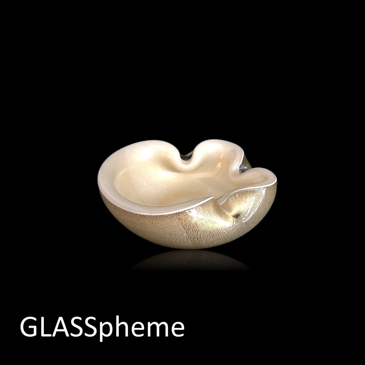 You're looking at an exquisitely formed mid-century Murano bowl | ashtray | trinket dish most likely by Alfredo Barbini for Weil Ceramics & Glass given nearly identical labeled pieces I've seen. Done with a bright white lattimo glass base covered in gold flecks and then encased in crystal, this beauty's interior seems to be cream colored, but is actually that same creamy lattimo white infused with gold. Biomorphically shaped with two indentations for us as an ashtray or ash receiver, this precious C.1950s Murano glass wonder would make an awesome gift! )