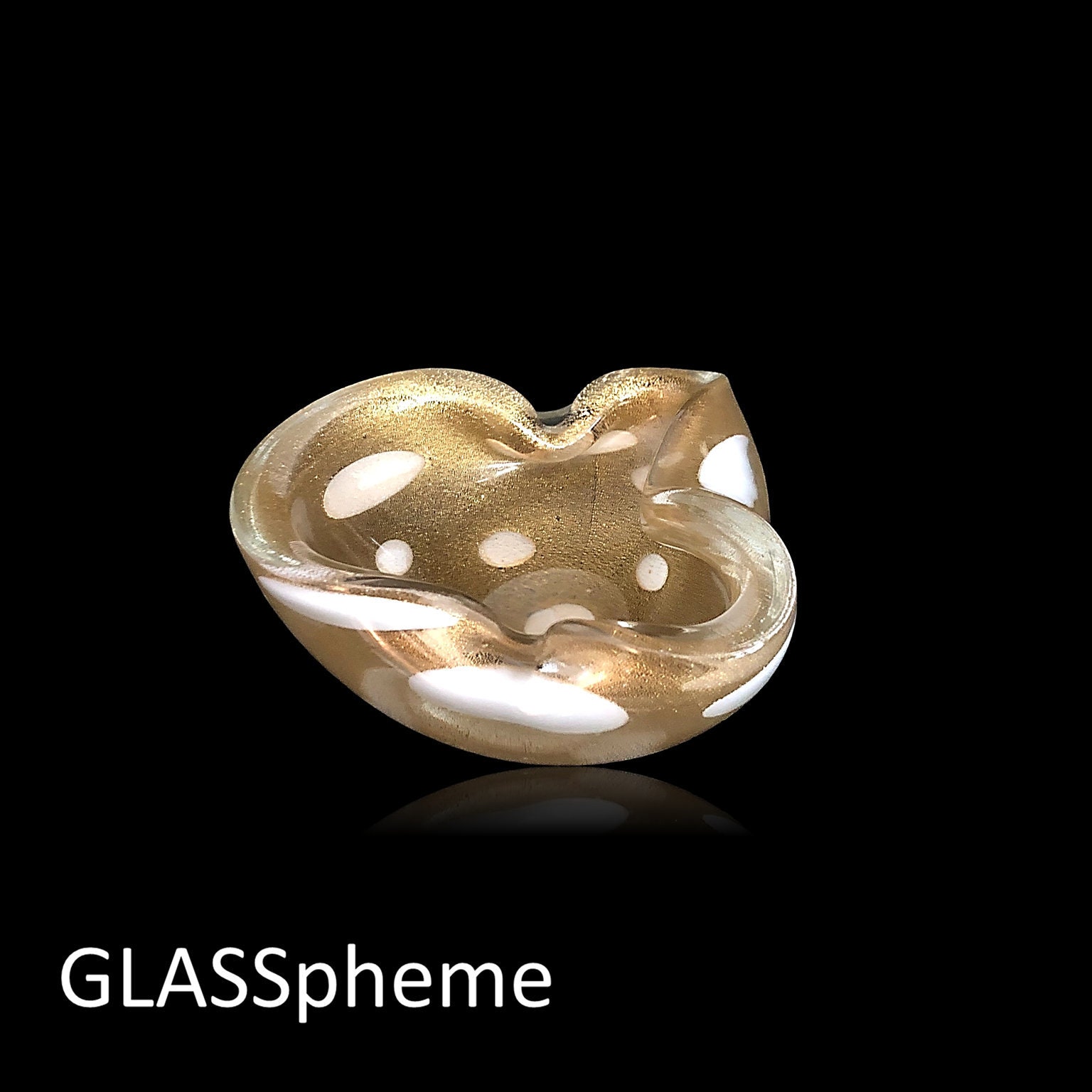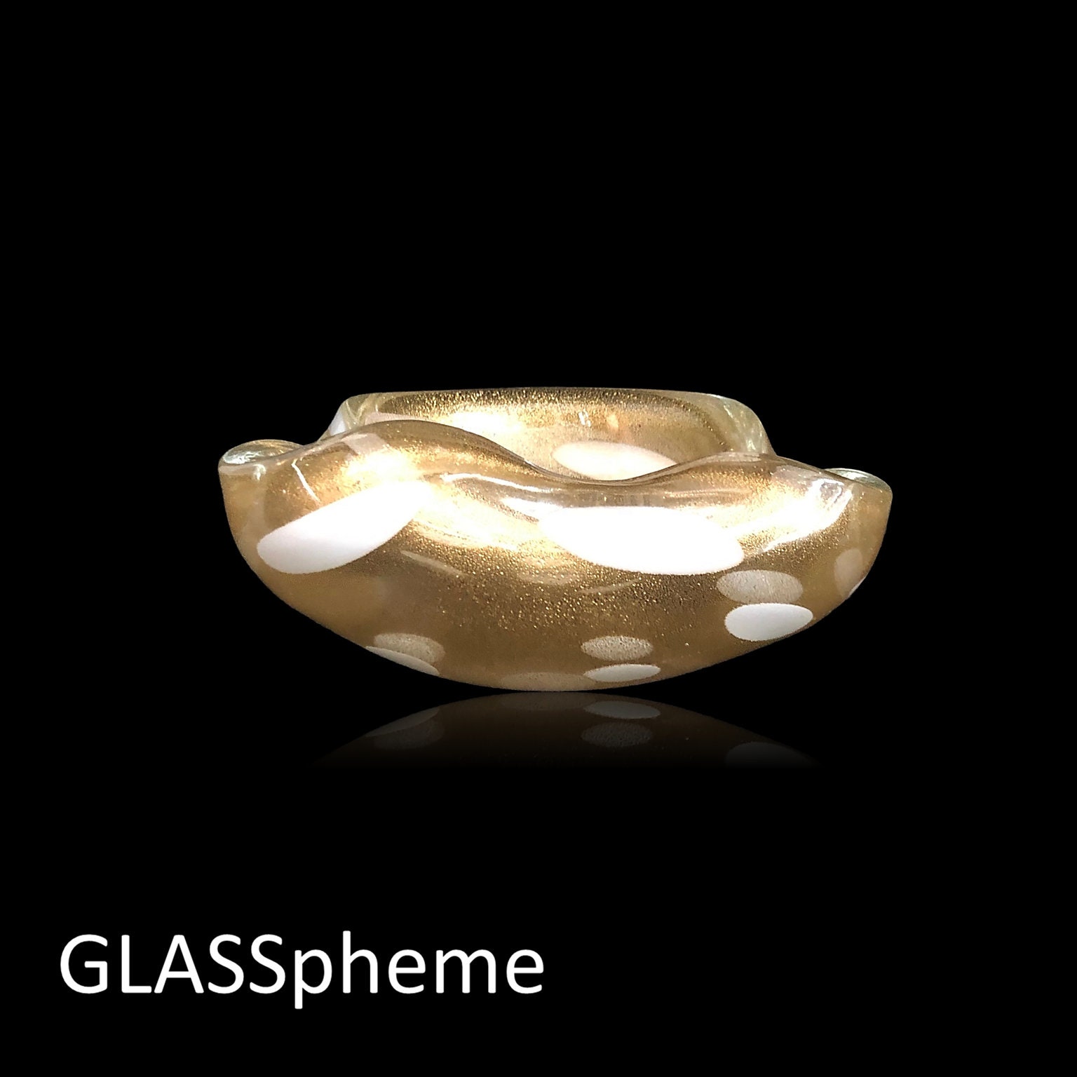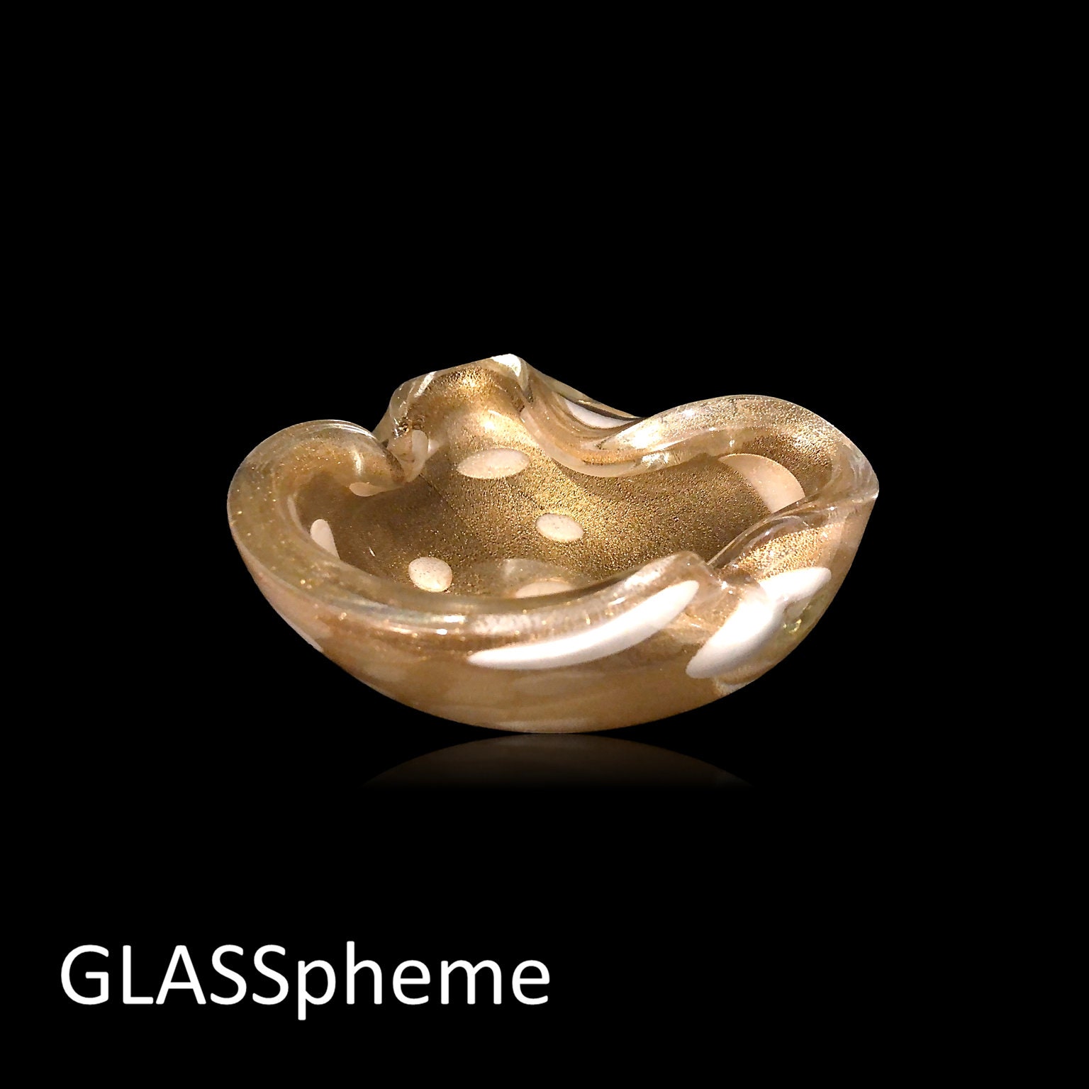 You're looking at an exquisitely formed mid-century Murano glass bowl | ashtray | trinket dish most likely by Alfredo Barbini. Done in a thick crystal glass heavily strewn with gold flecks and then accentuated with awesome white polka dots (murrines), this is a killer cool bowl you just gotta have!