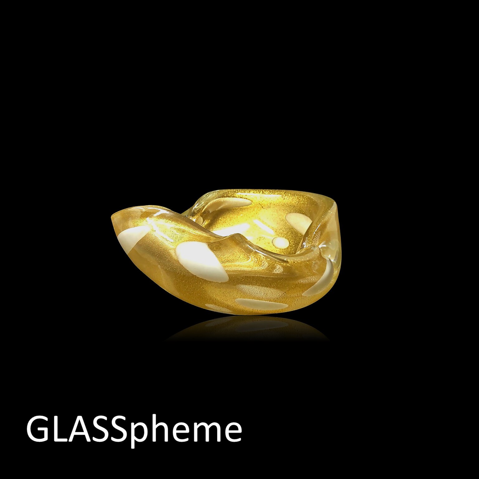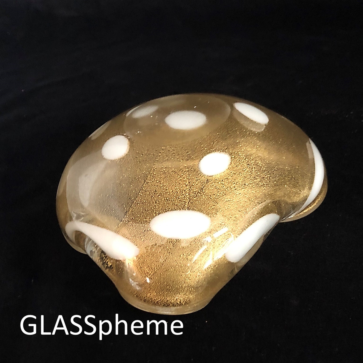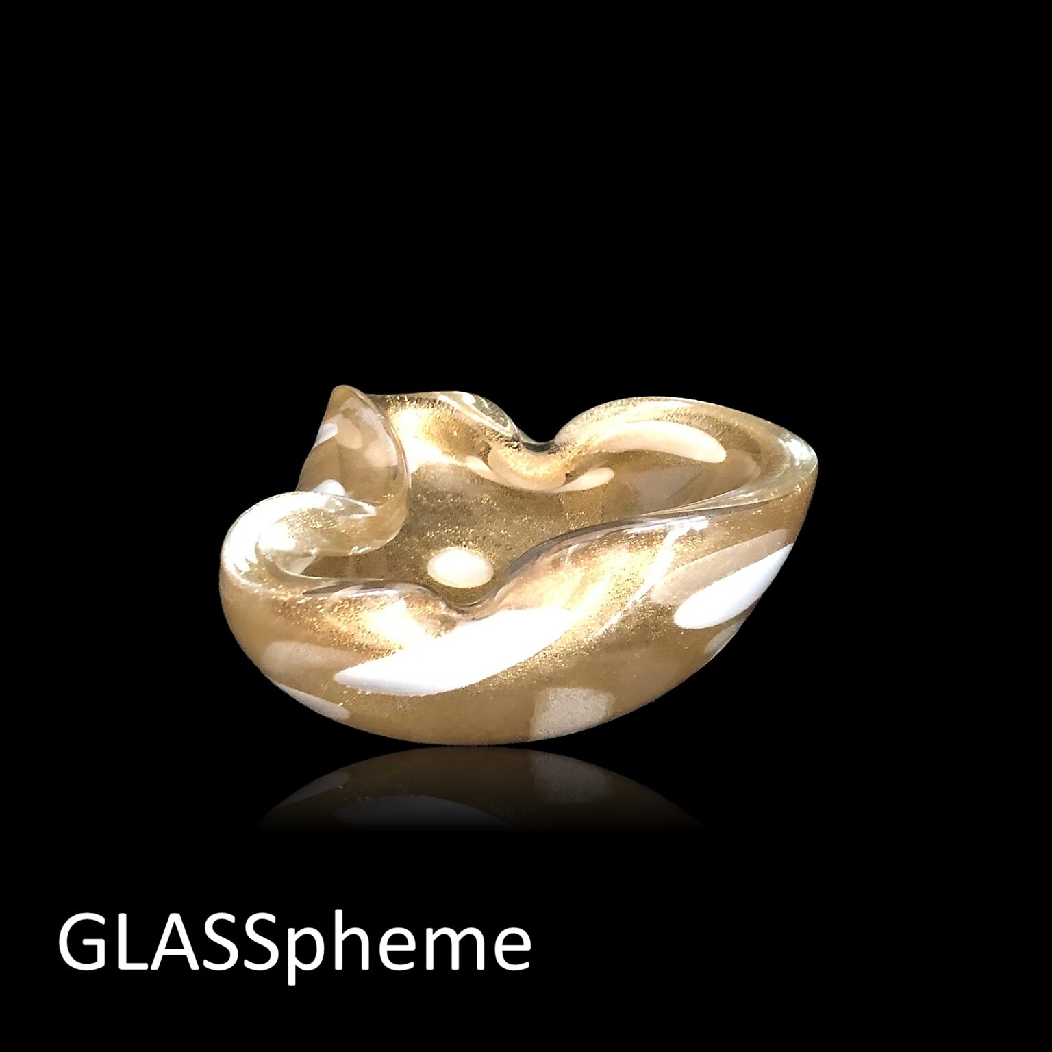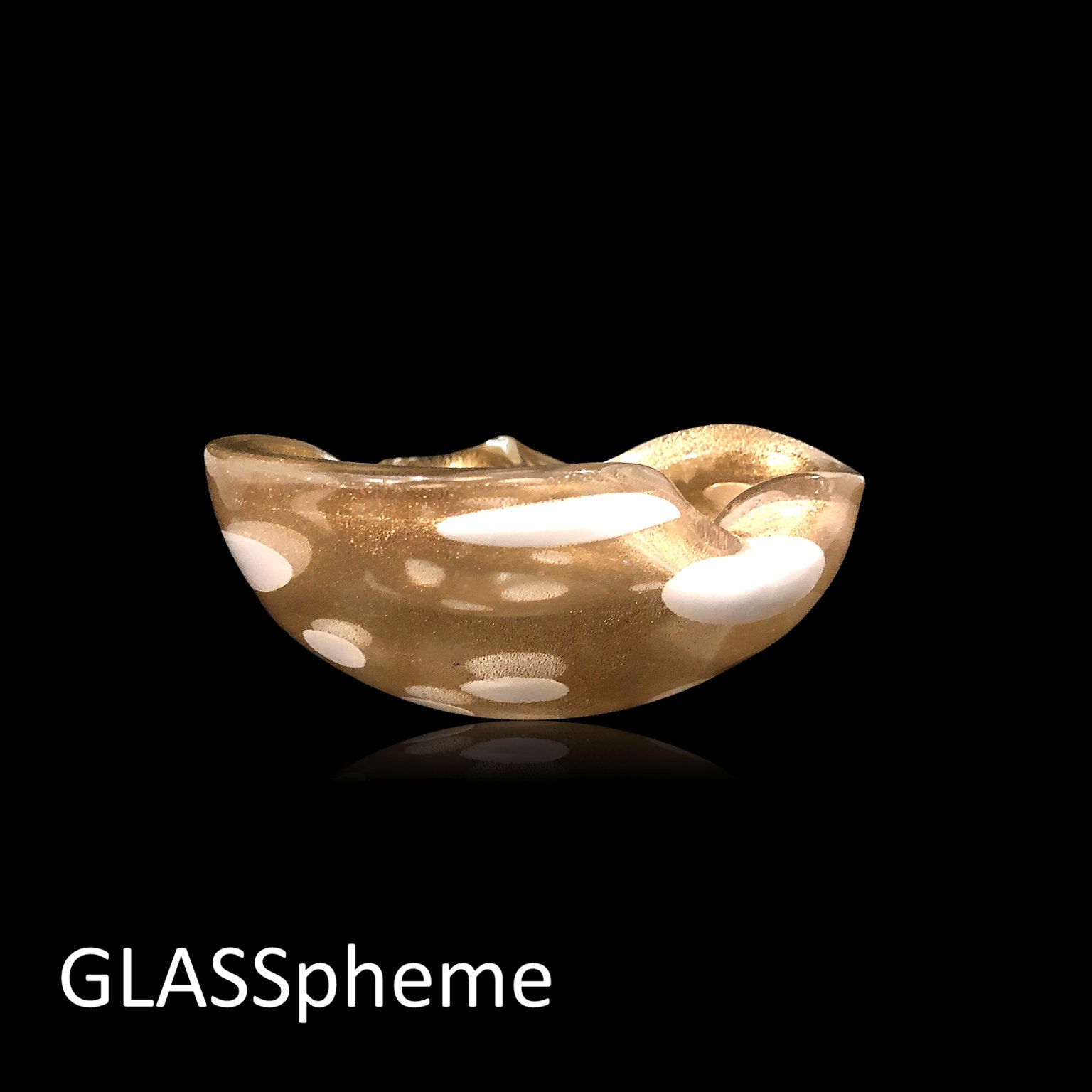 You're looking at an exquisitely formed mid-century Murano glass bowl | ashtray | trinket dish most likely by Alfredo Barbini. Done in a thick crystal glass heavily strewn with gold flecks and then accentuated with awesome white polka dots (murrines), this is a killer cool bowl you just gotta have!