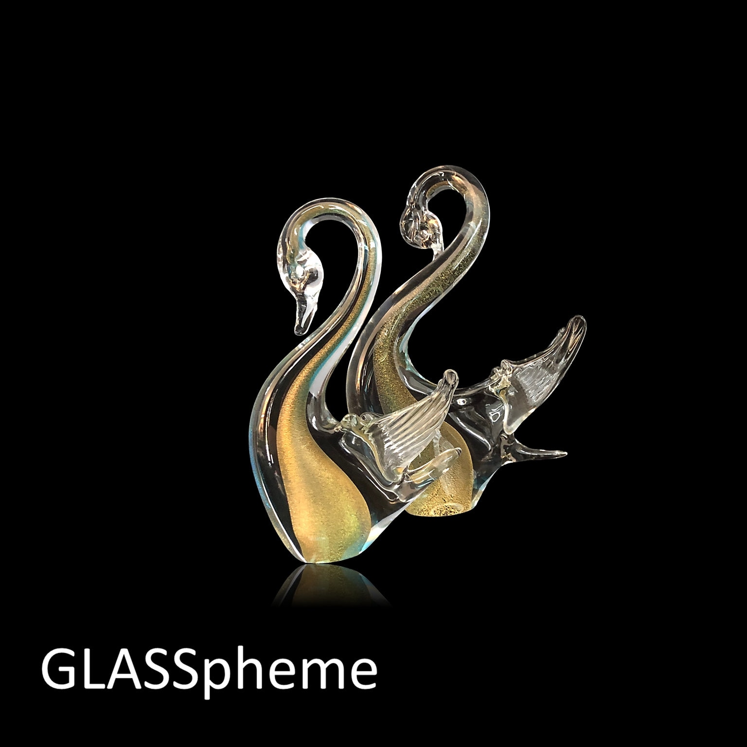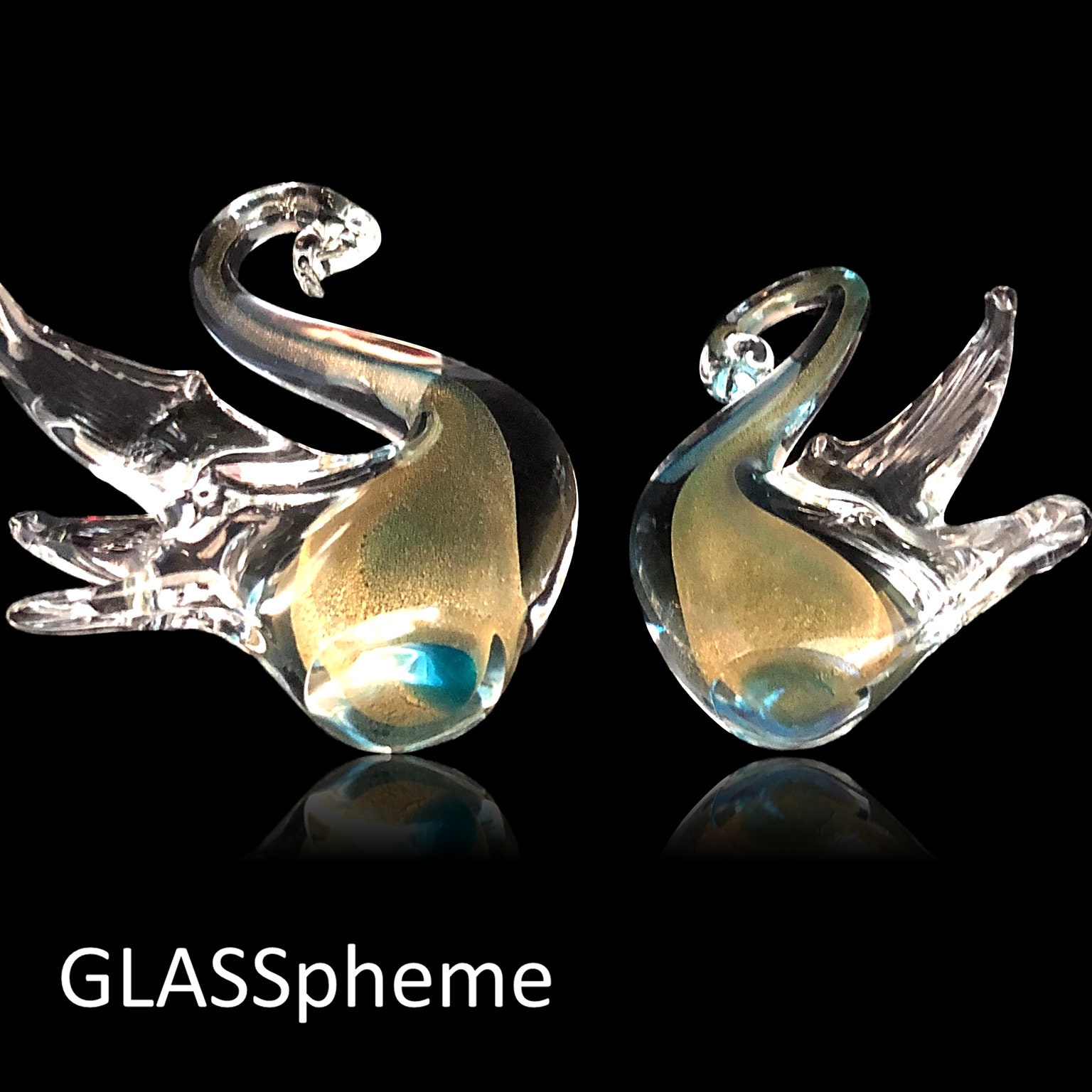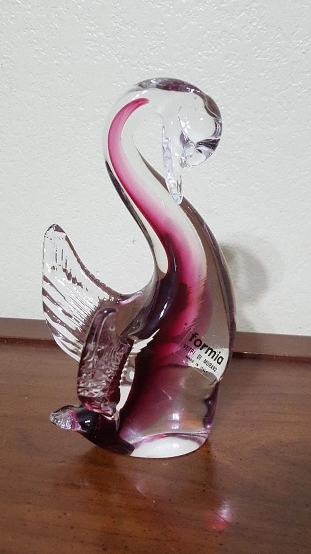 These stunning sommerso glass swans with shimmering gold fleck interiors were produced by Formia Vetri Di Murano (1962-2016). While unsigned and without a label, photo #4 shows the identical form with a Formia label. These smaller but absolutely spectacular pieces are in mint condition and would make amazing stocking stuffers!