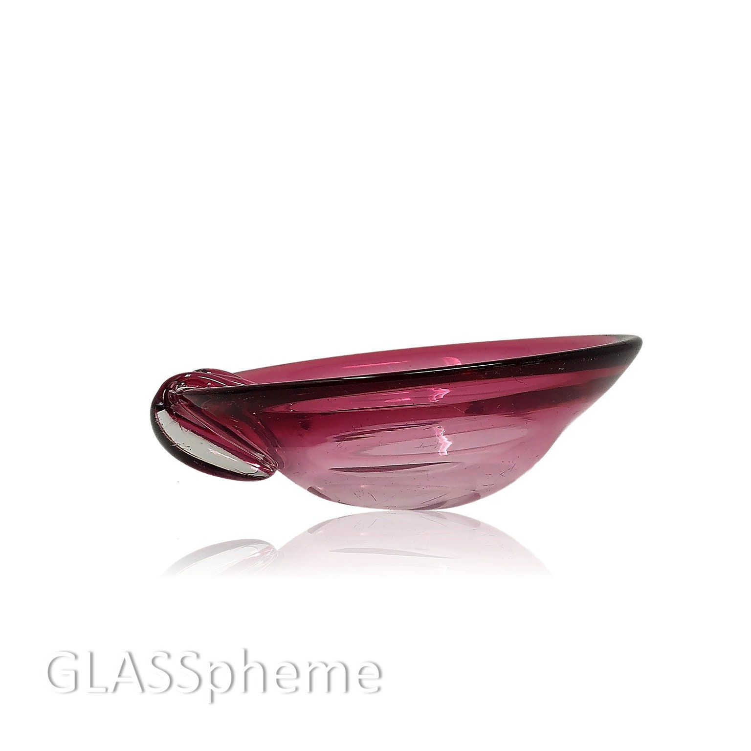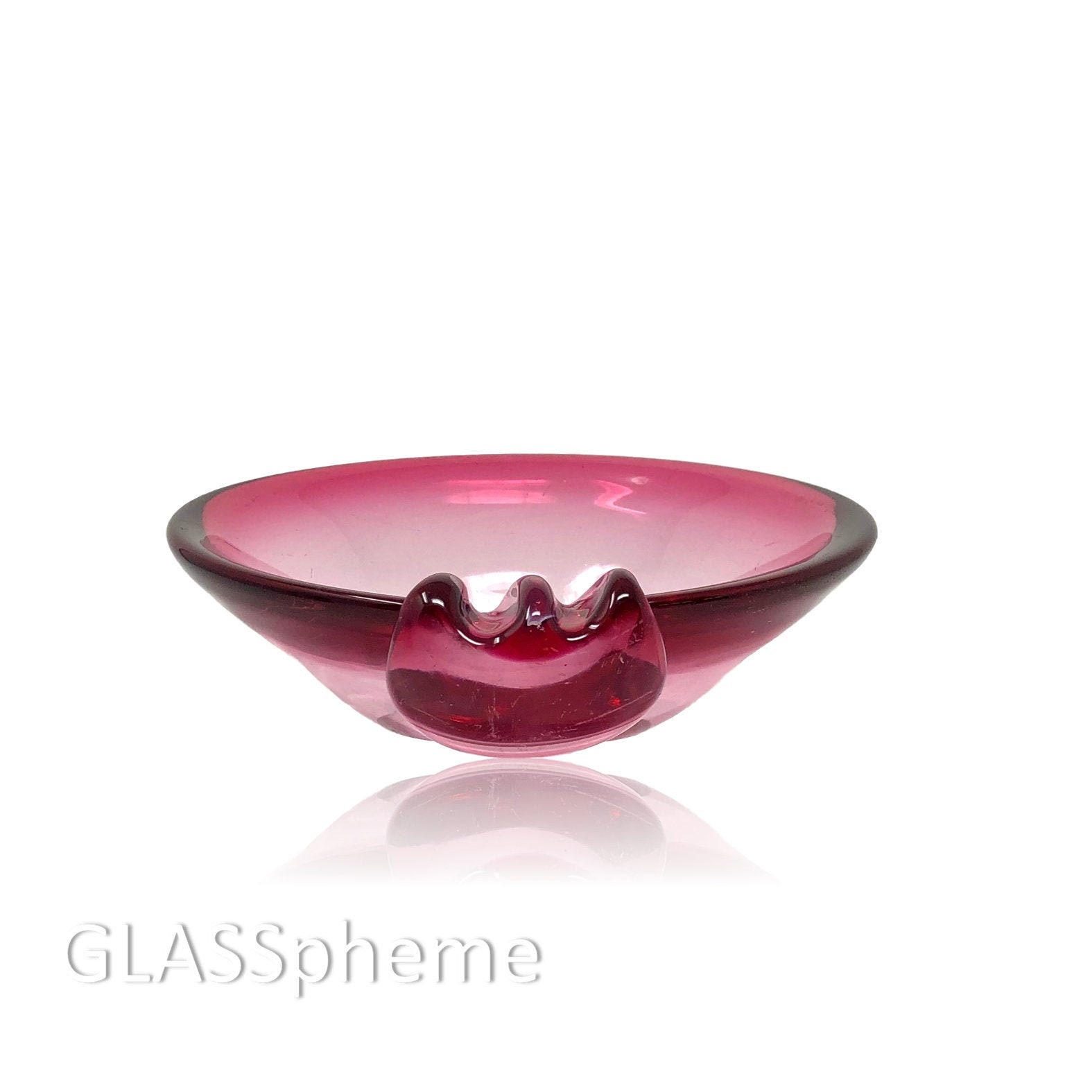 The item for sale is a high quality glass cigar ash tray or dish made by the Steuben company of New York. The tray was designed by David Hill during the middle of the last century. The form is essentially sloping conical with an off center flat foot and an applied cigar holder with two grooves in it. The clarity and quality of the glass is super. This tray is also the variety with cranberry glass around the rim which Steuben does on rare occasions. The bowl is not signed on the base although this is identical to a well known signed Steuben design. The foot of the tray shows slight signs of table wear. Otherwise it is essentially as made. The height and diameter at the top without the holder are 2 1/2" and 8".