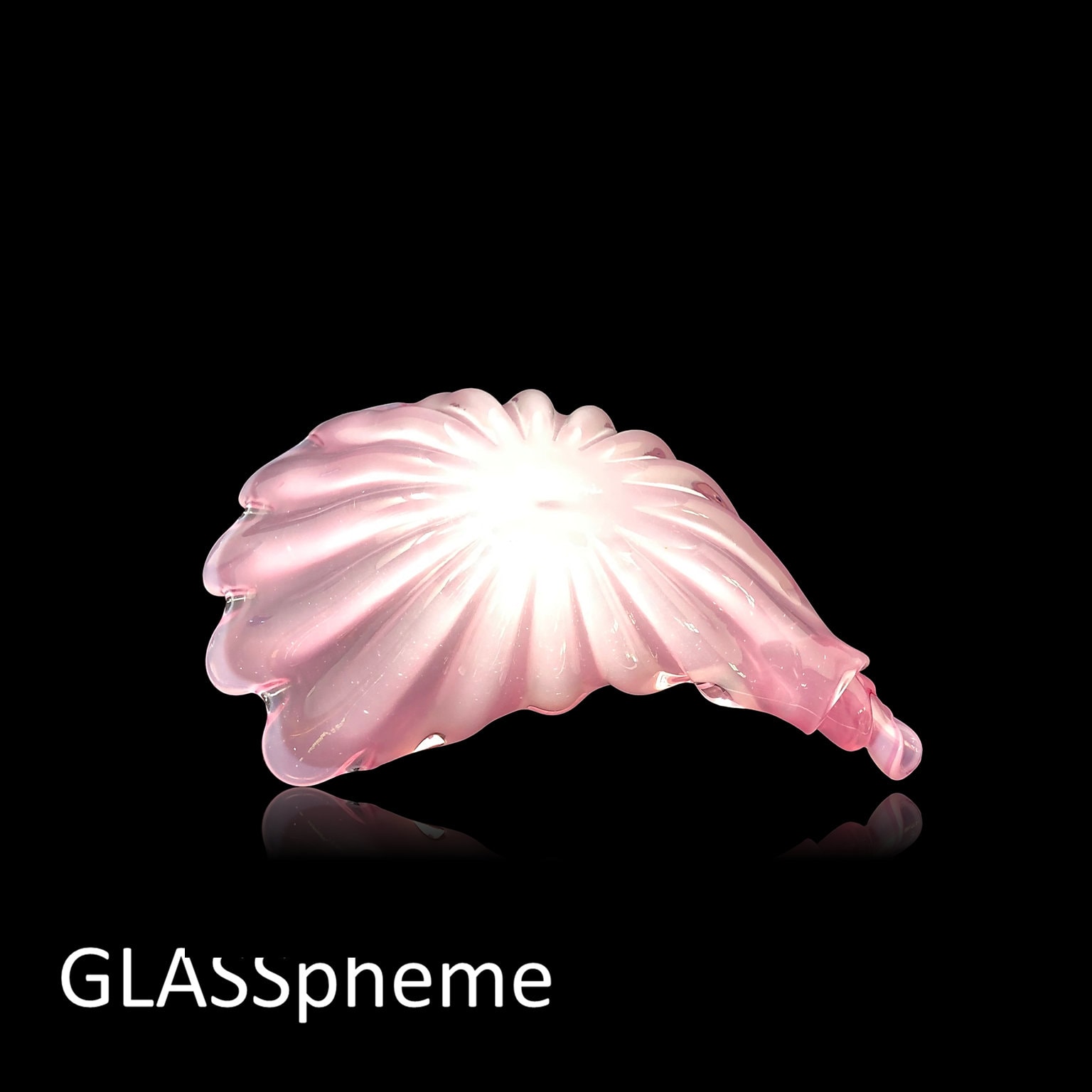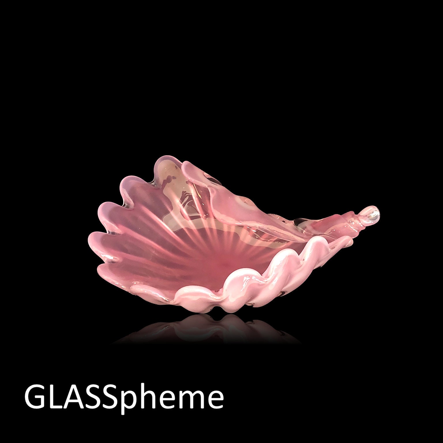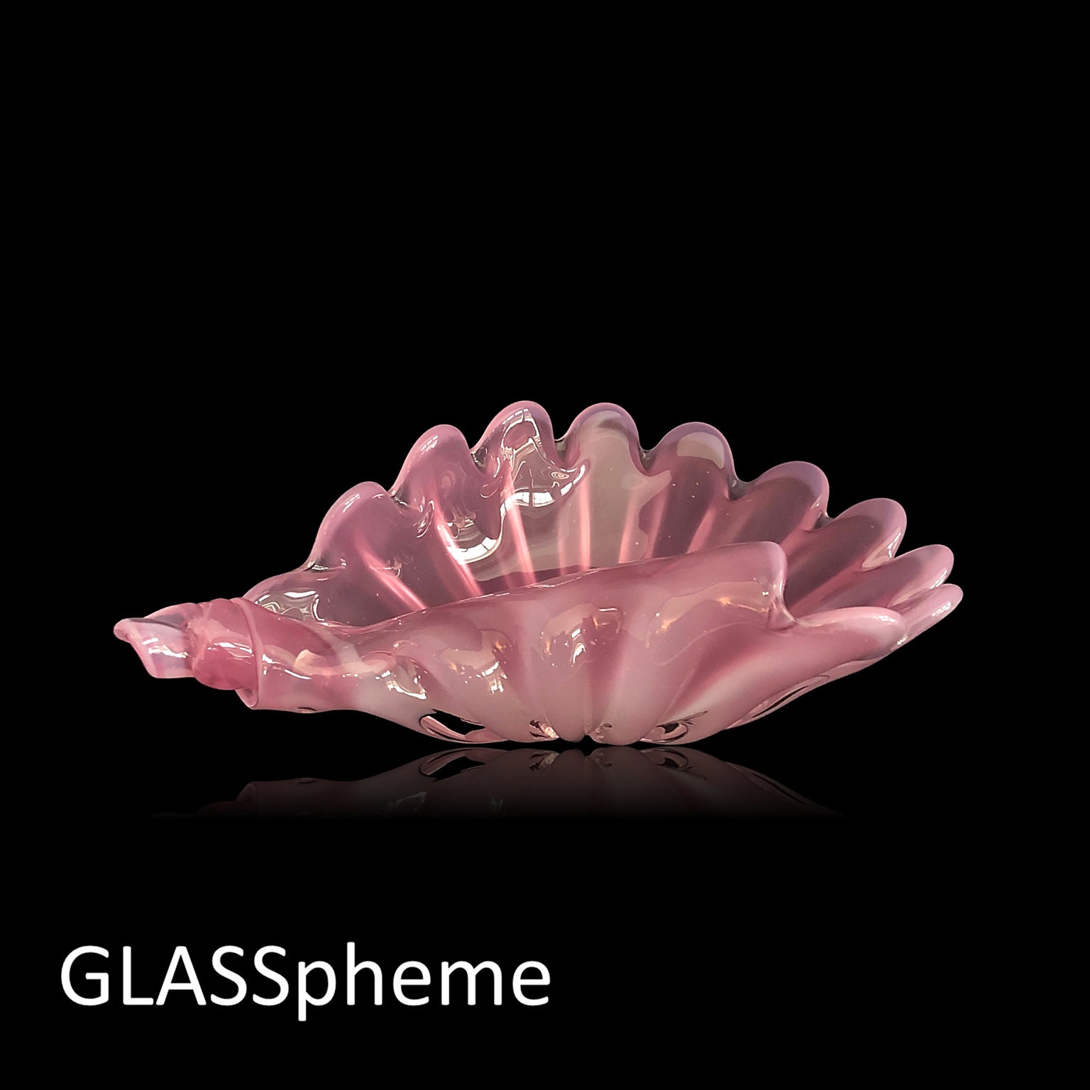There's nothing more dreamy than pink opalescent Murano glass, and this big modern glass shell is a perfect example of why! Nearly 11 inches long and 9" wide, this thickly cased work of art weighs nearly 5 lbs. I've seen variations of this design done by Luigi Onesto/Oball and Formia and this might be by either or none as the signature on the base is S. Puccini. A quick bit of research shows that this Puccini signature has been found on many pieces I've known to be done by Formia--a glass artist there perhaps or an entirely different entity producing popular designs on contract. In this instance, it matters not as this astonishing piece is purely a passion play.