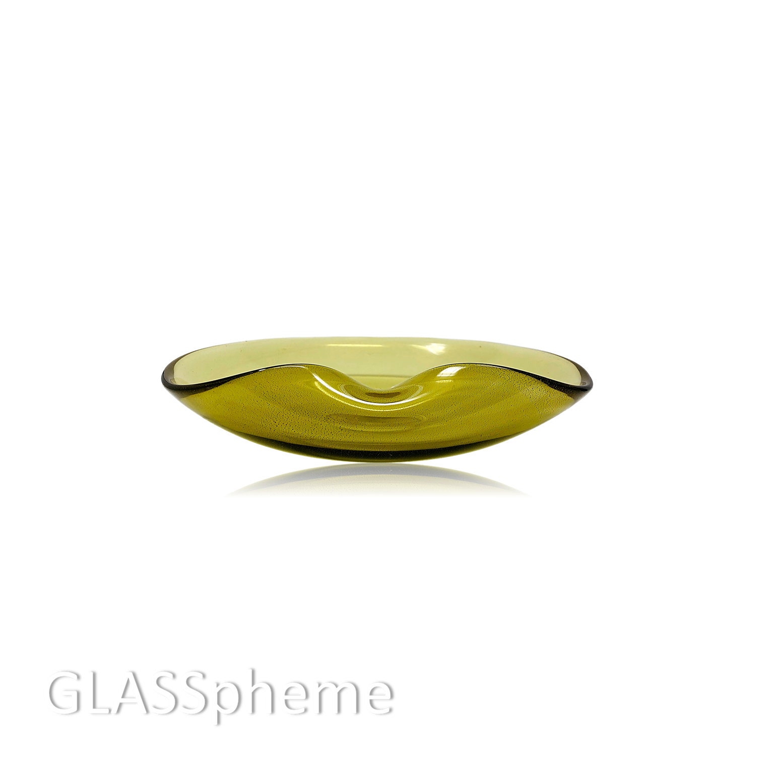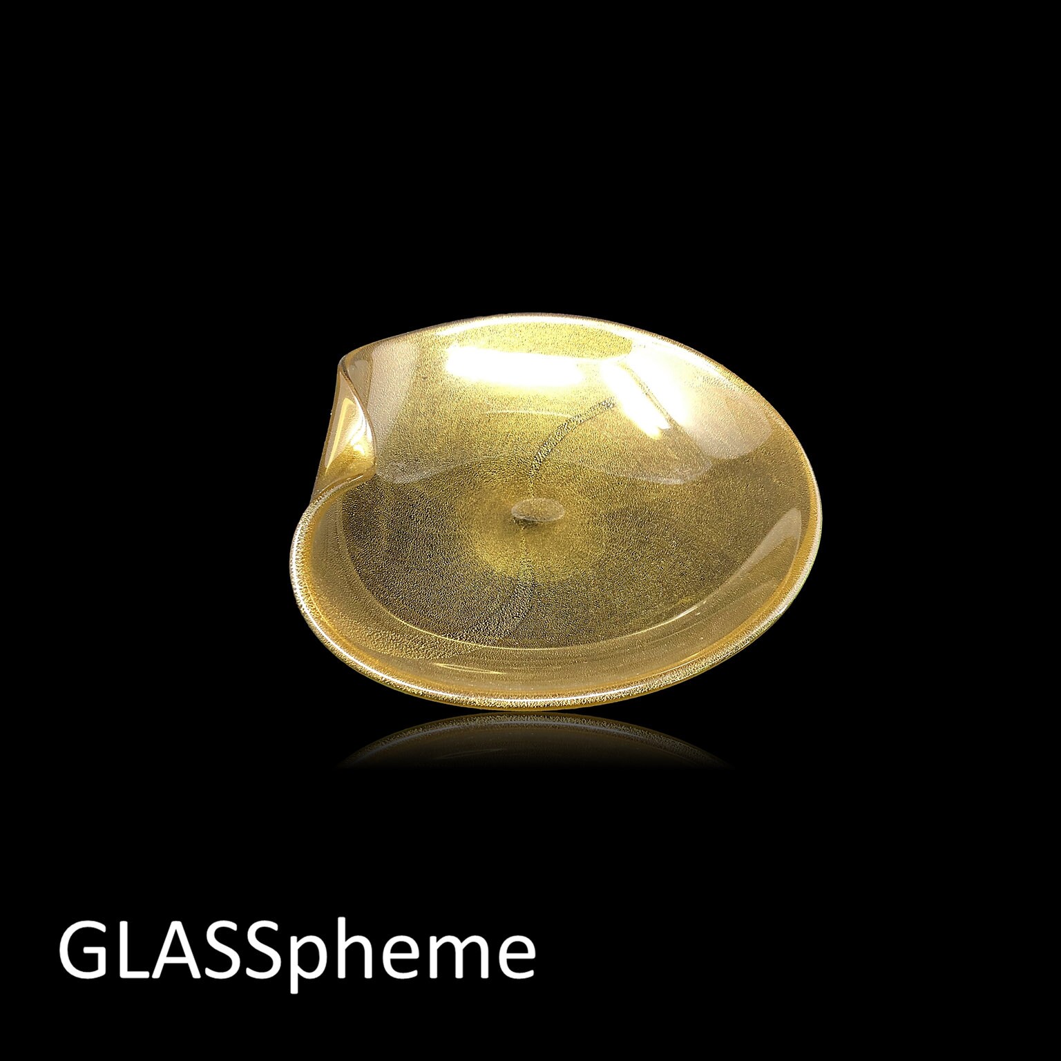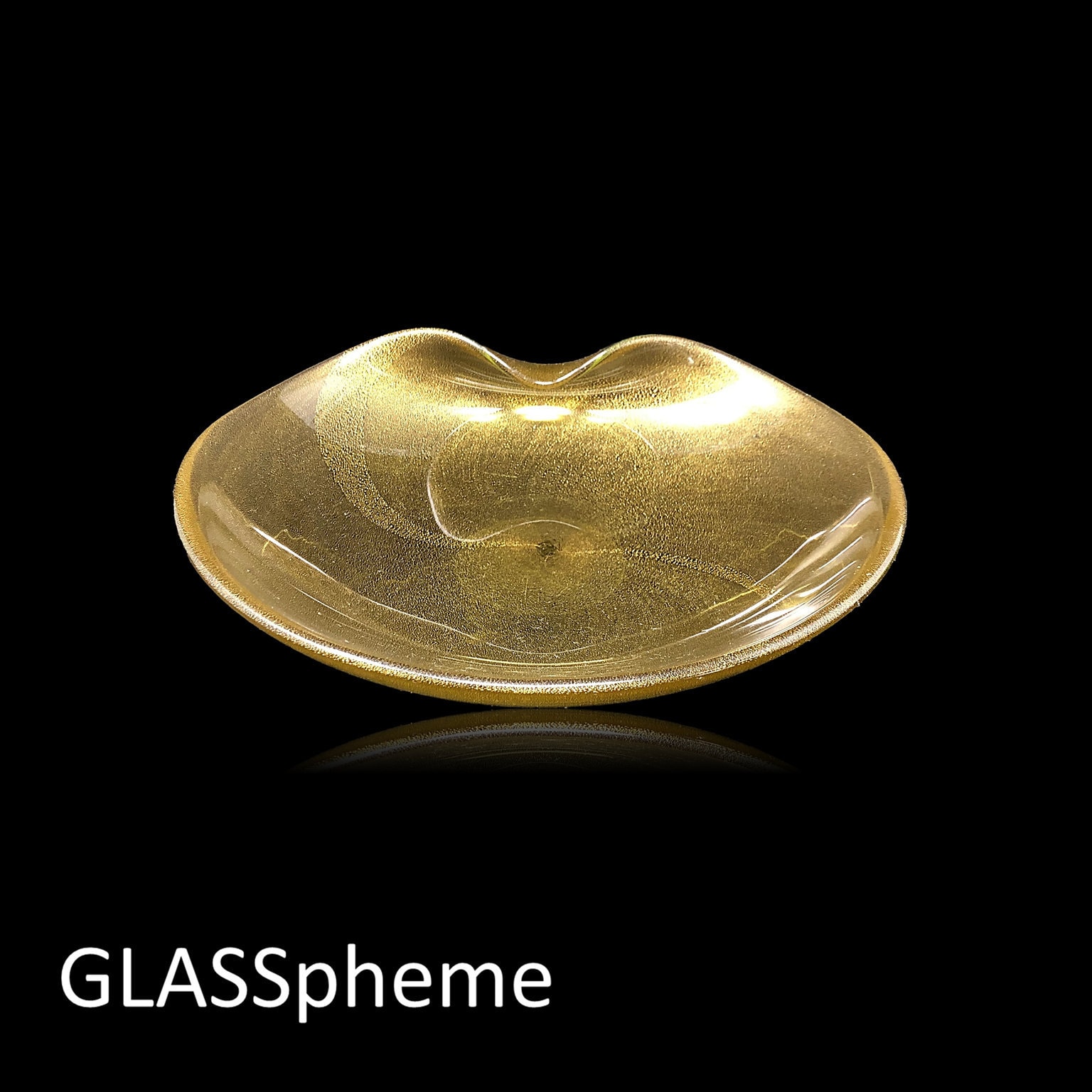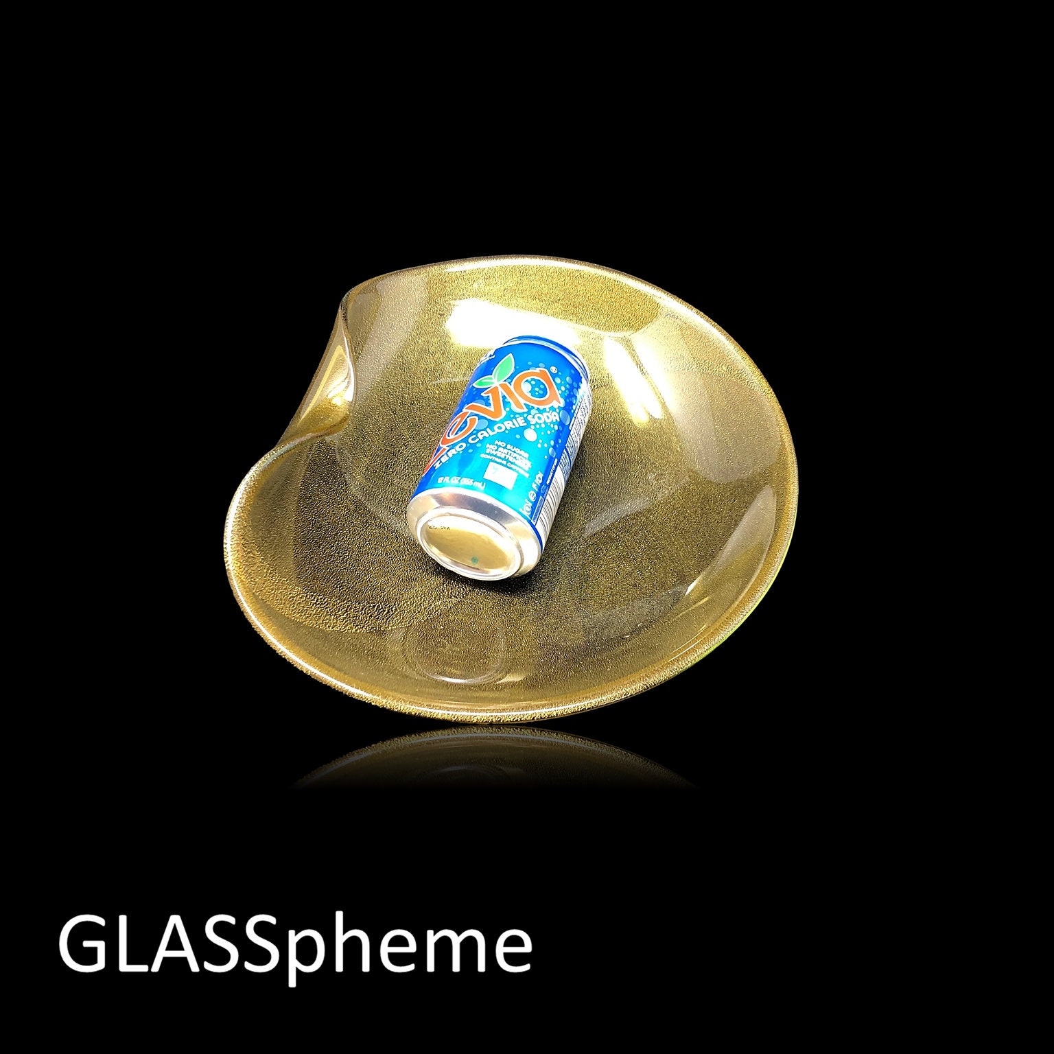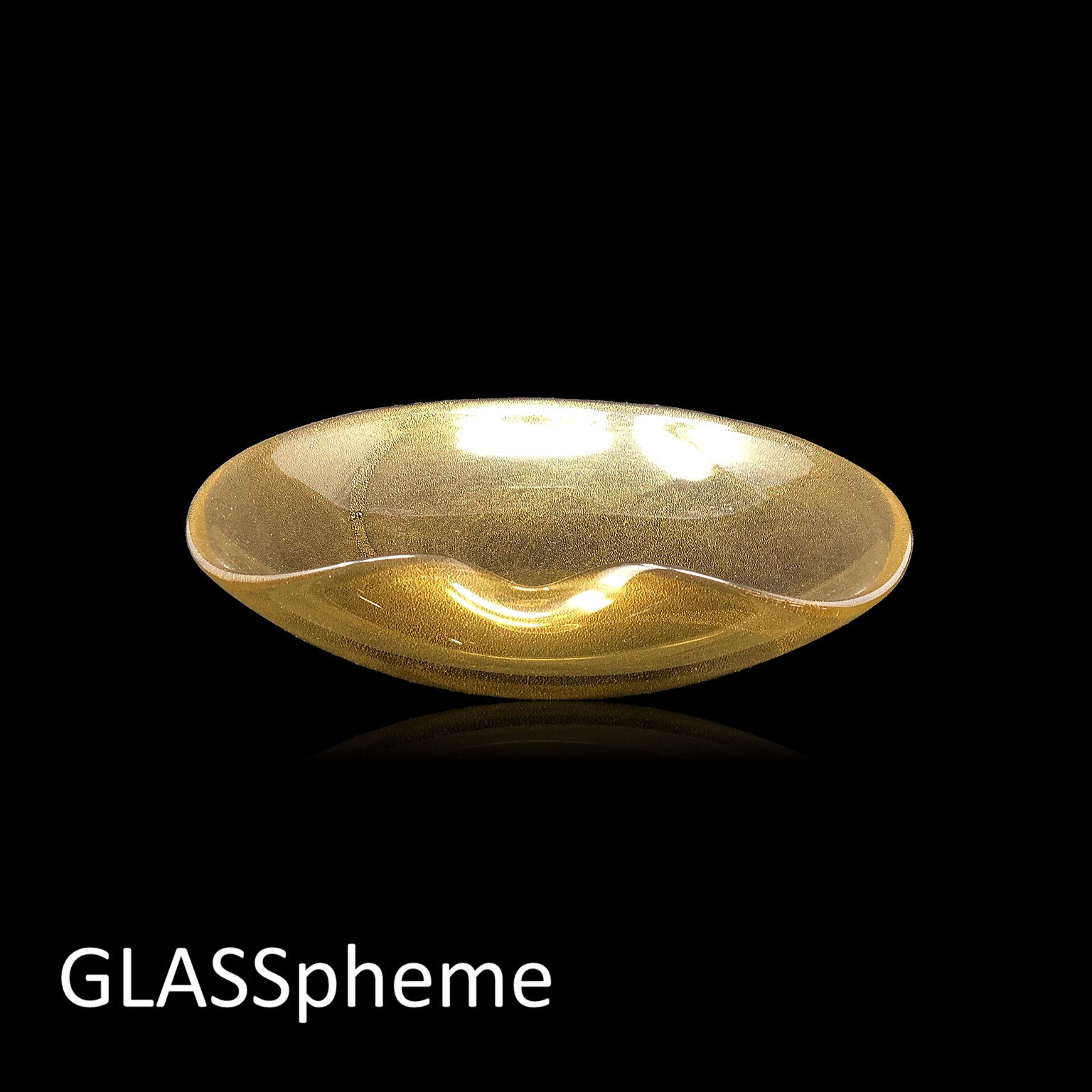 The glittering tiny gold aventurine flecks submerged throughout this extraordinary work of art gives this magnificent glass platter a glowing unearthly quality. While no label remains, the style, color, craftsmanship and impossible beauty--not to mention availability of many like pieces with the Seguso label--make this most likely a Seguso.