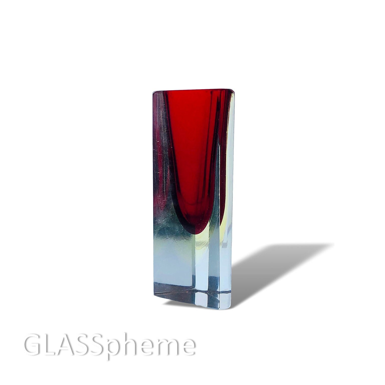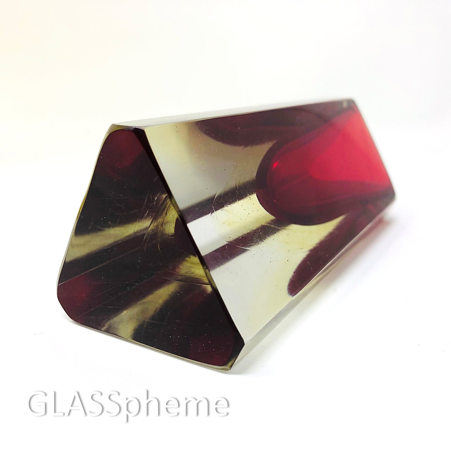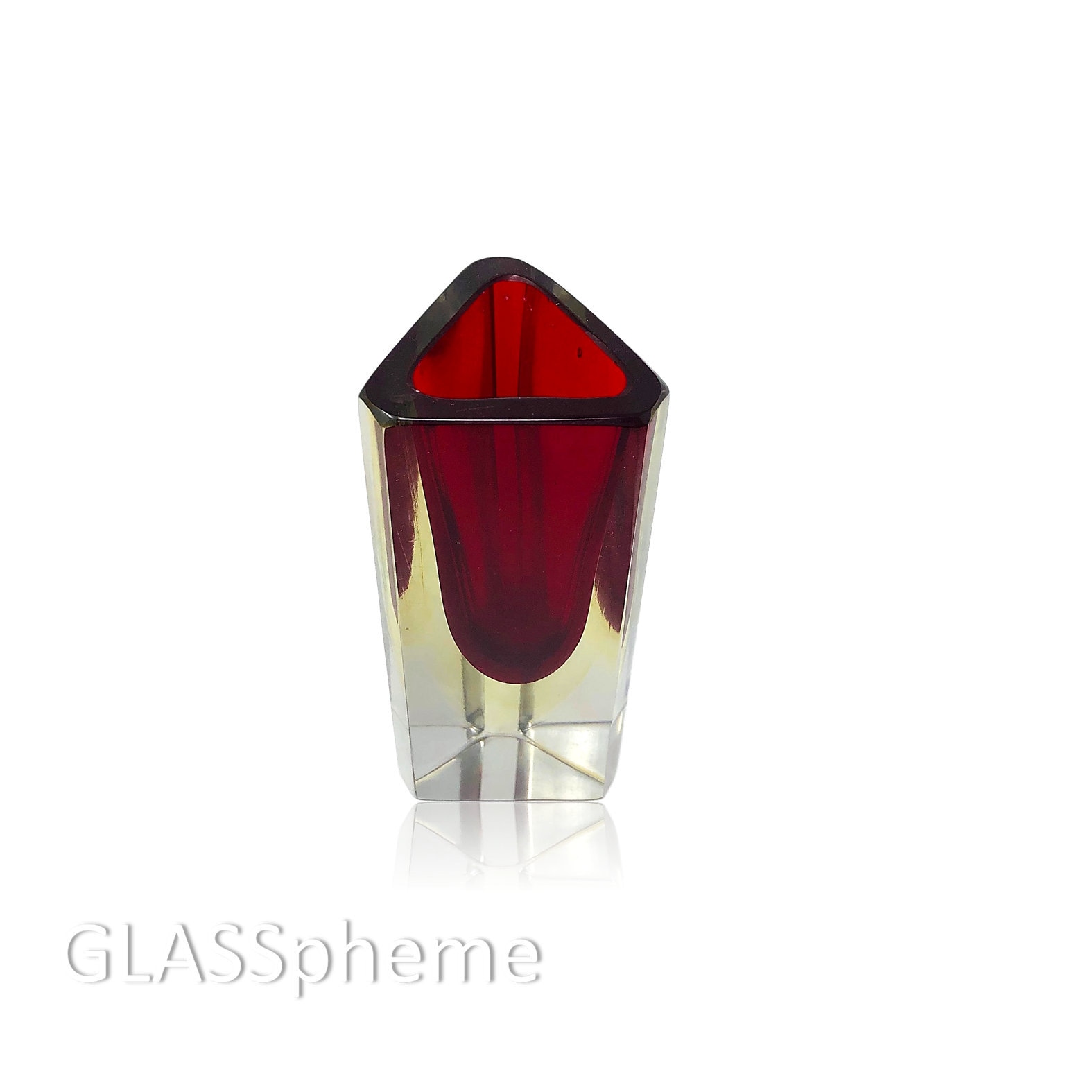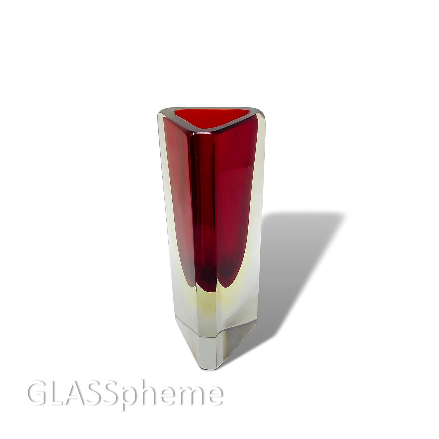 This SUPER MOD mid-century Murano triangular faceted sommerso glass bud base (or pen holder) is almost certainly by MANDRUZZATO given labeled pieces I've seen that are almost identical in construction and design. It's a small and unusual piece and incredibly solid, weighing over one pound despite its diminutive size. This dramatic modern piece is in near-perfect condition, with very light base wear or other signs of use.